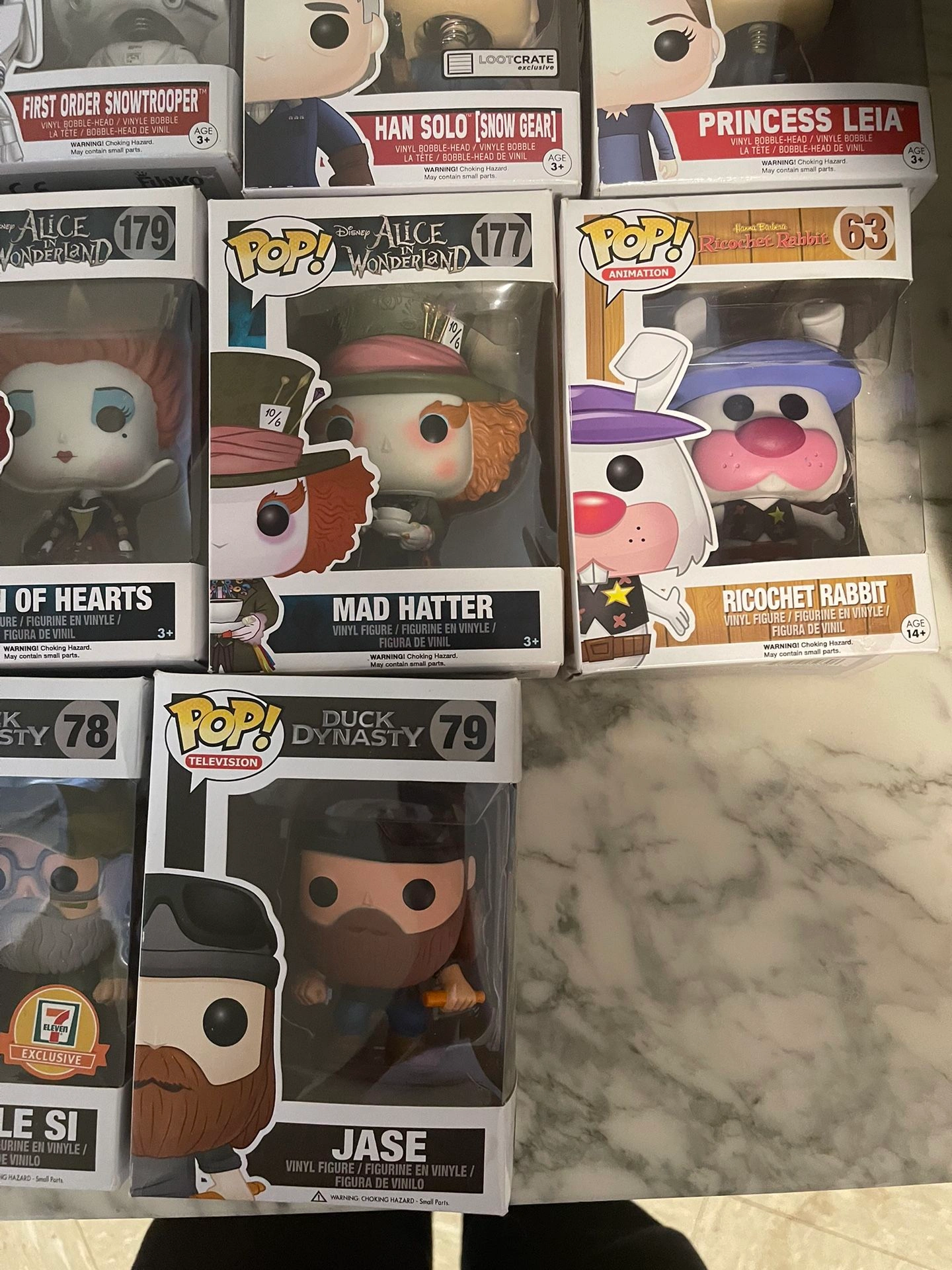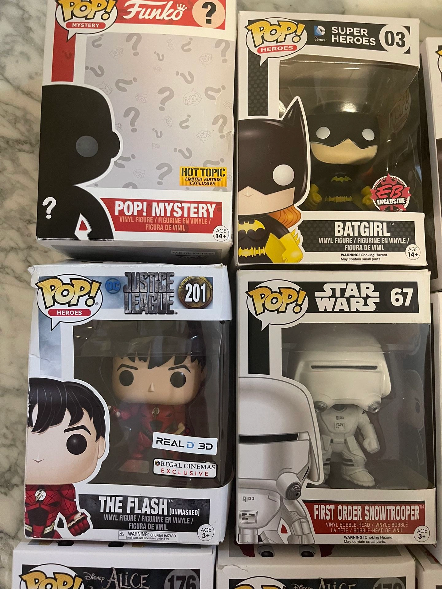 Selling my collection of Funko Pops! Asking $125 for all 15, or you can purchase them individually. My collection includes Disney's Alice in Wonderland set, Star Wars, Duck Dynasty, The Flash Regal Exclusive, and Batman & Batgirl exclusives from EB and GameStop. Some of the Pops included are: