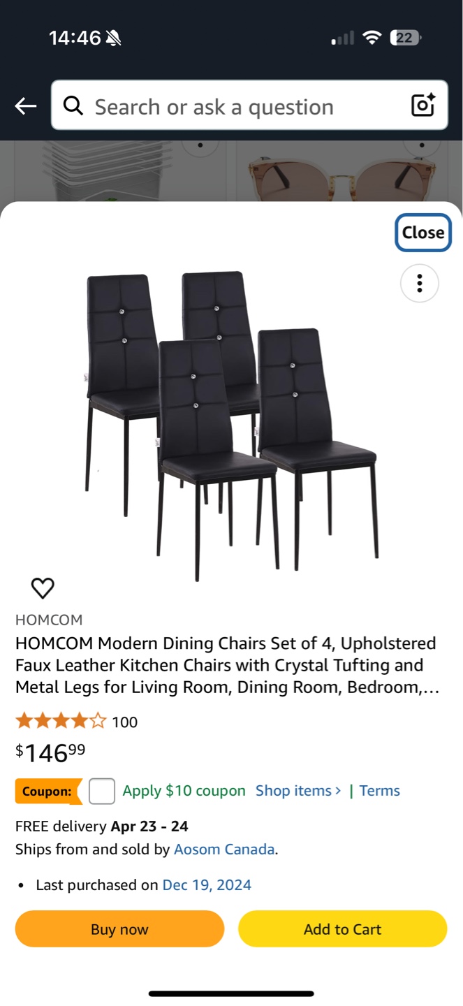 Buy & SellHOMCOM Modern Dining Chairs - Set of 4HOMCOM Modern Dining Chairs - Set of 4$100New in box. Set of four black faux leather dining chairs. Crystal tufting and metal legs.ConditionNewWHERE TO MEETCheck LocationView MapSELLERShawNewmarket NW352 reviews0 chats·0 favorites·6 viewsSEND CHAT TO SELLERHi Shaw! I’m interested in your listing.Hi Shaw! I’m interested in your listing.Get the Karrot app to chatSign In to chat