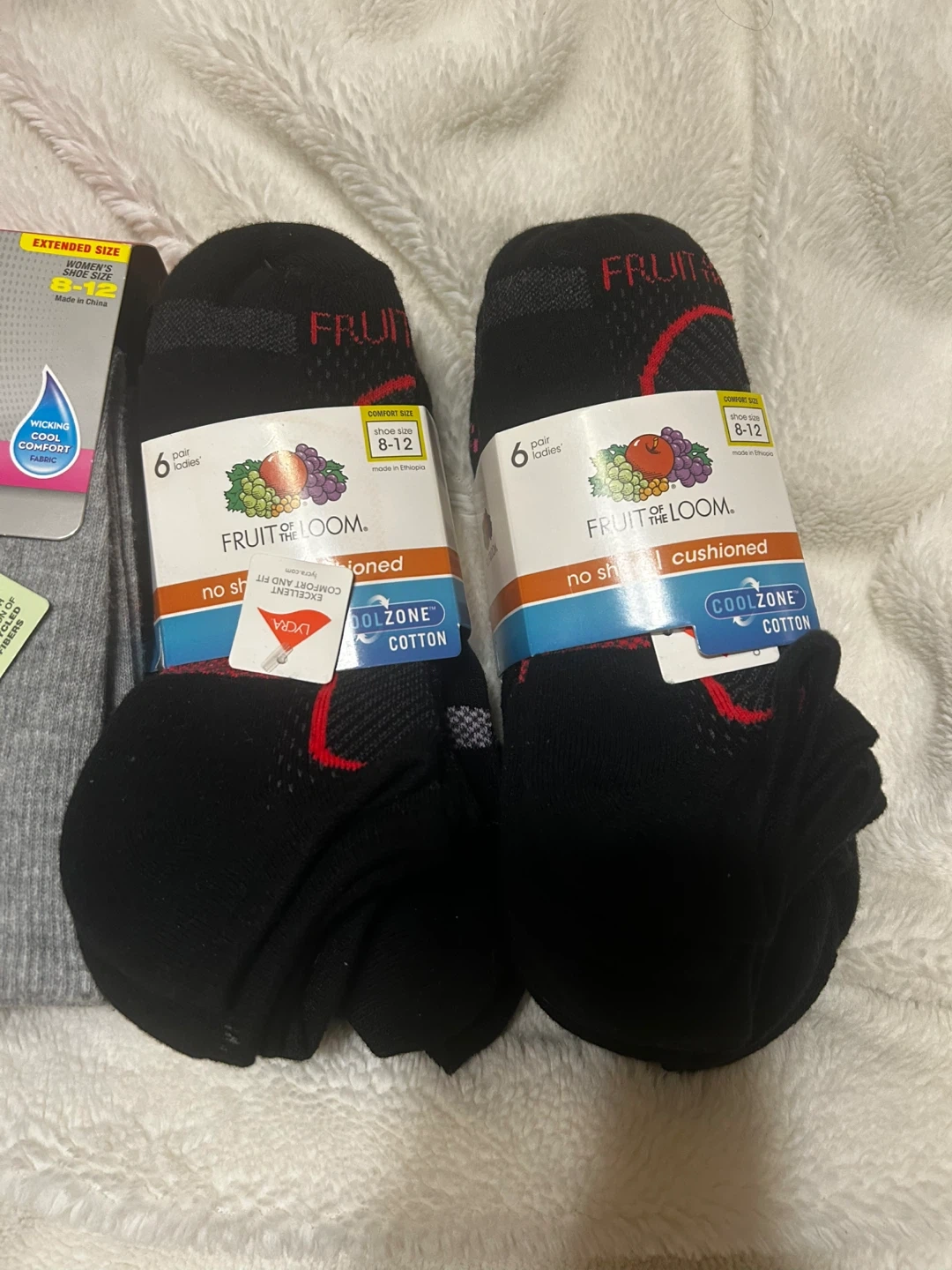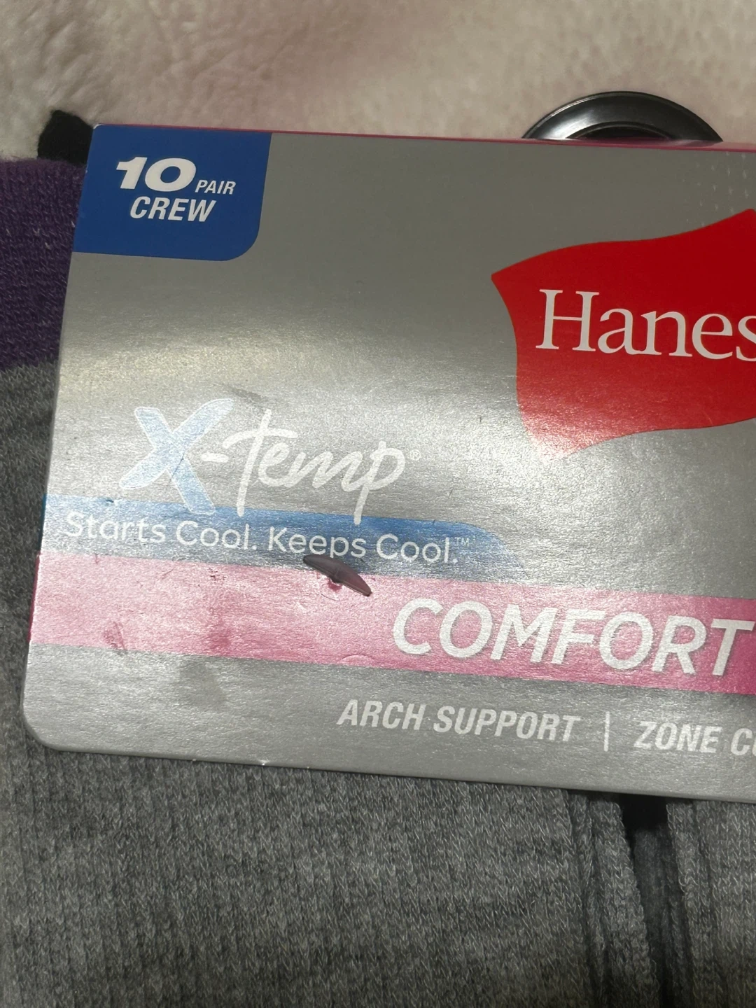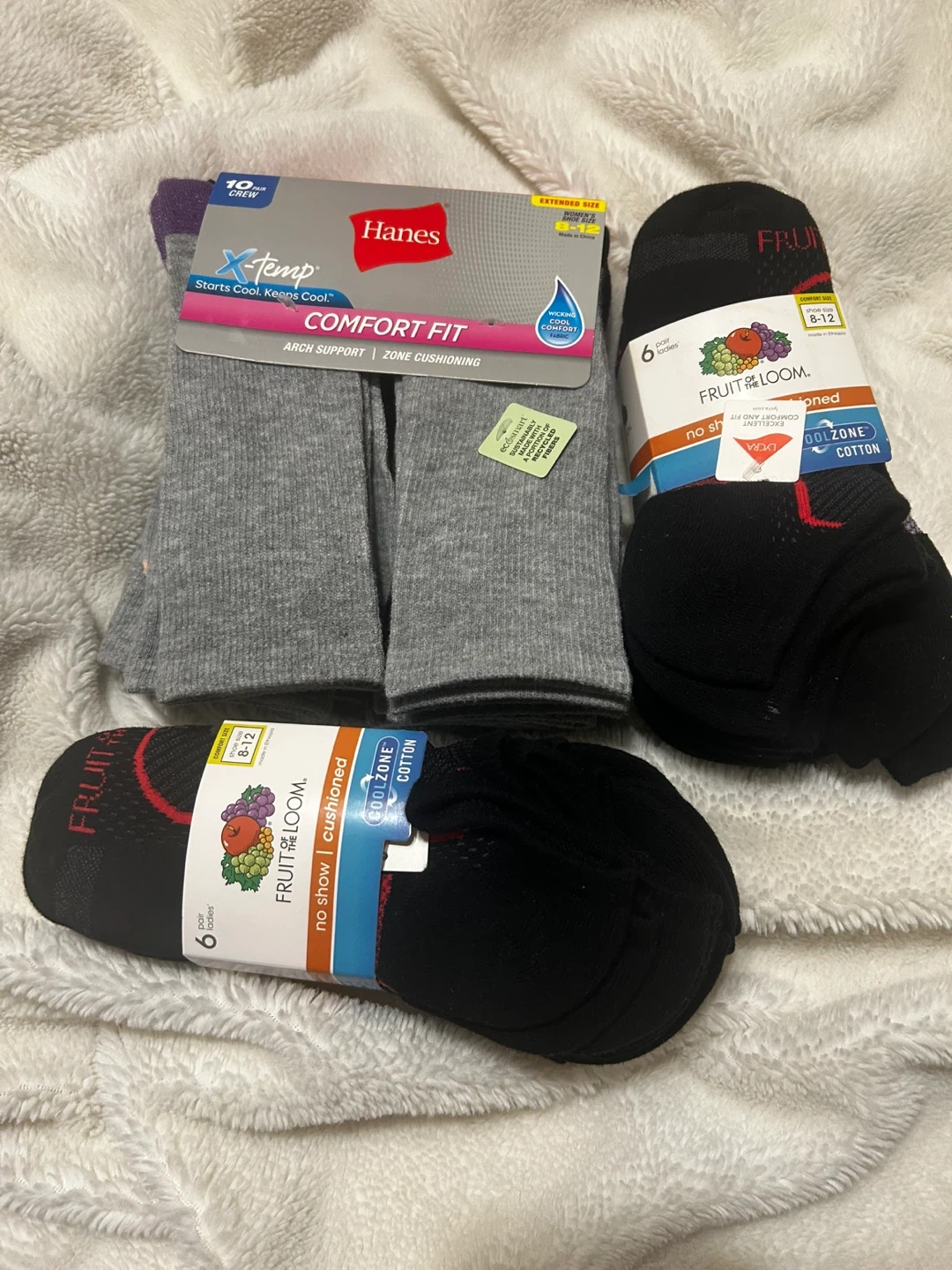 One 10-pair pack of Hanes X-Temp Comfort Fit crew socks, featuring arch support and zone cushioning. Also includes two 6-pair packs of Fruit of the Loom cushioned socks for ladies, size 8-12, with Cool Zone technology. All socks are made with cotton.