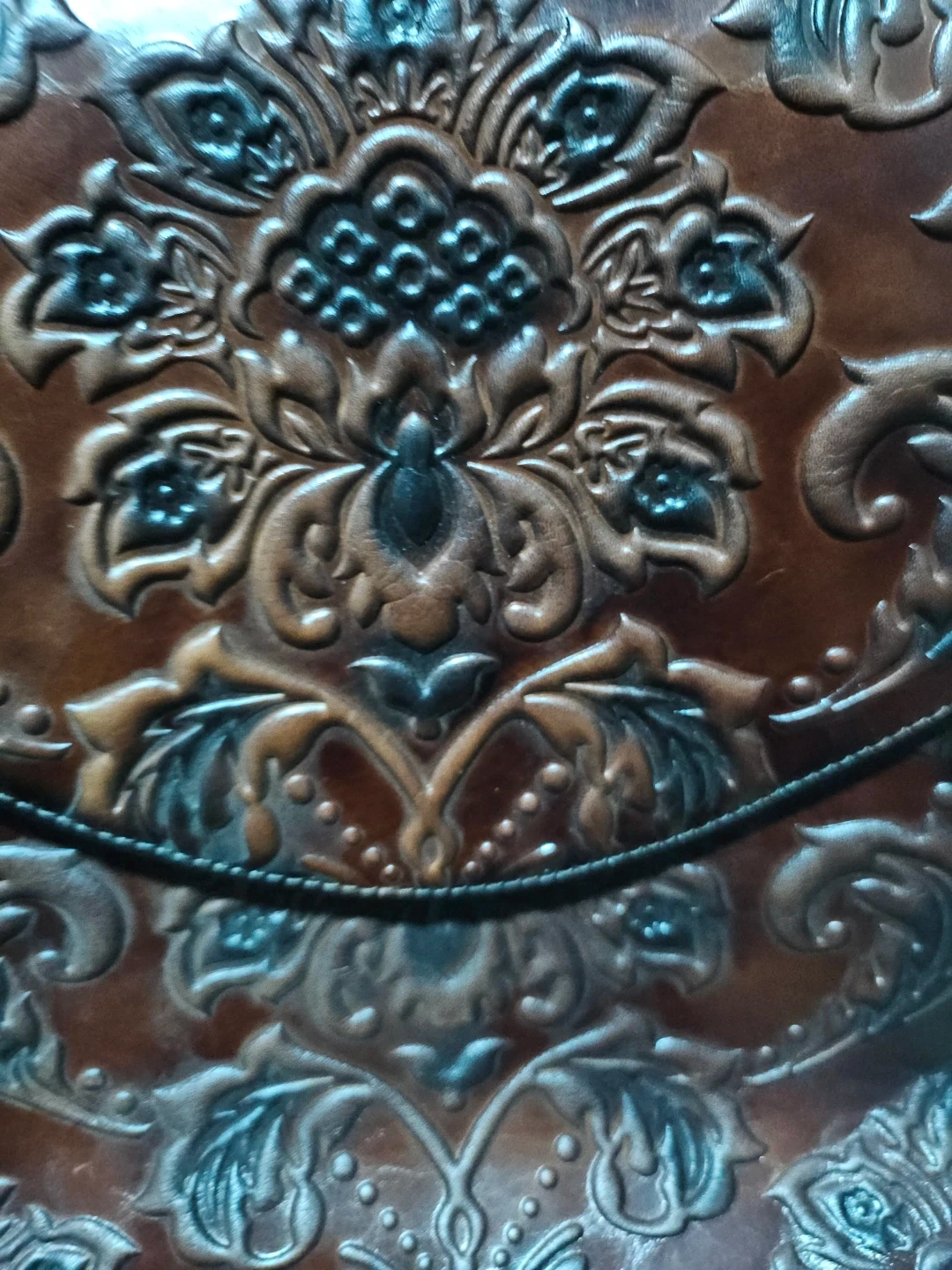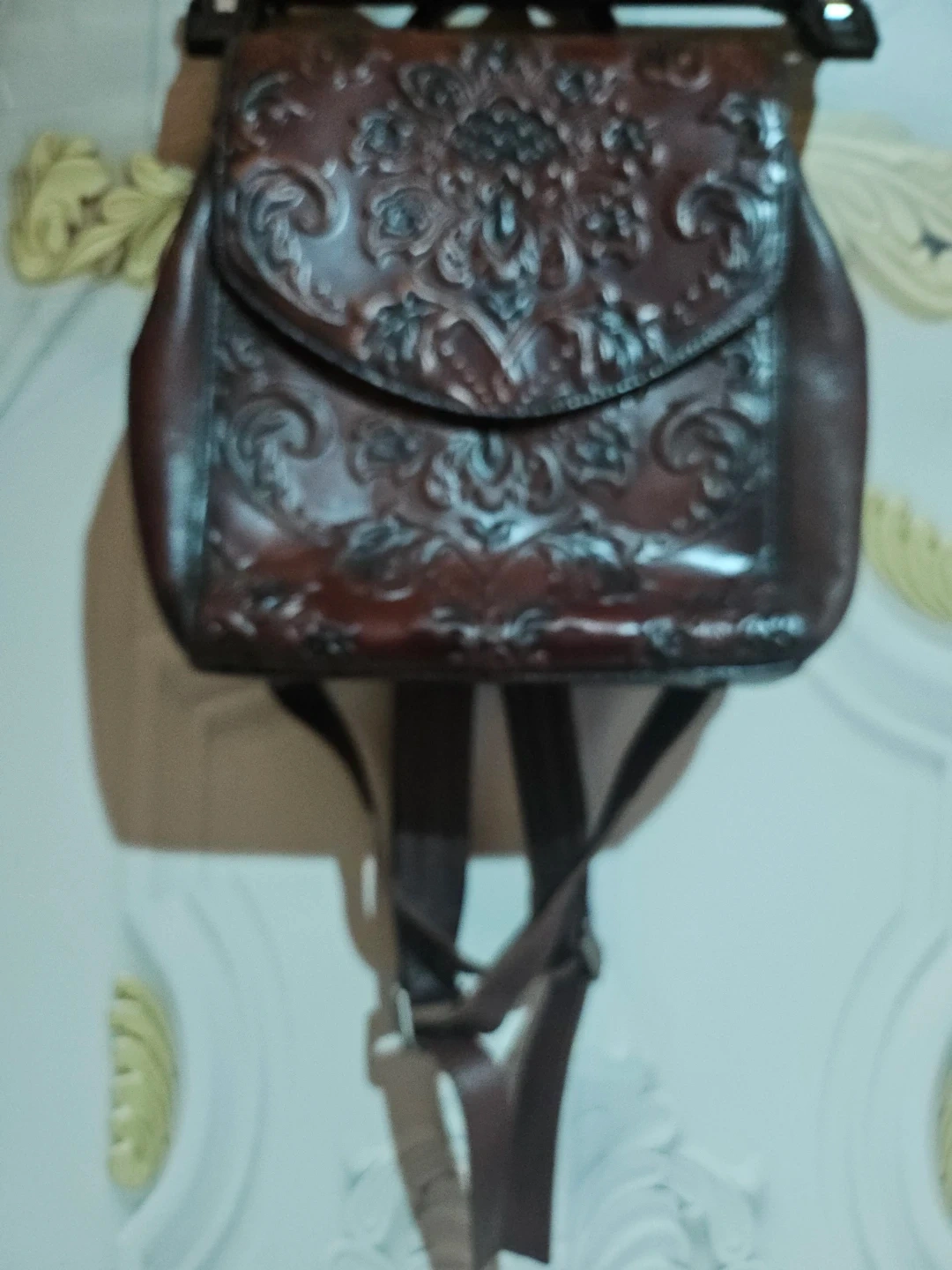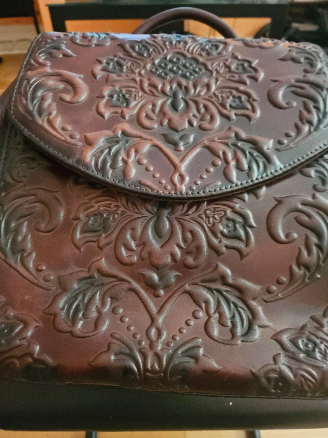 This stylish brown leather backpack features a detailed embossed floral design. It's a medium-sized bag with adjustable straps for comfort. A beautiful accessory for everyday use!