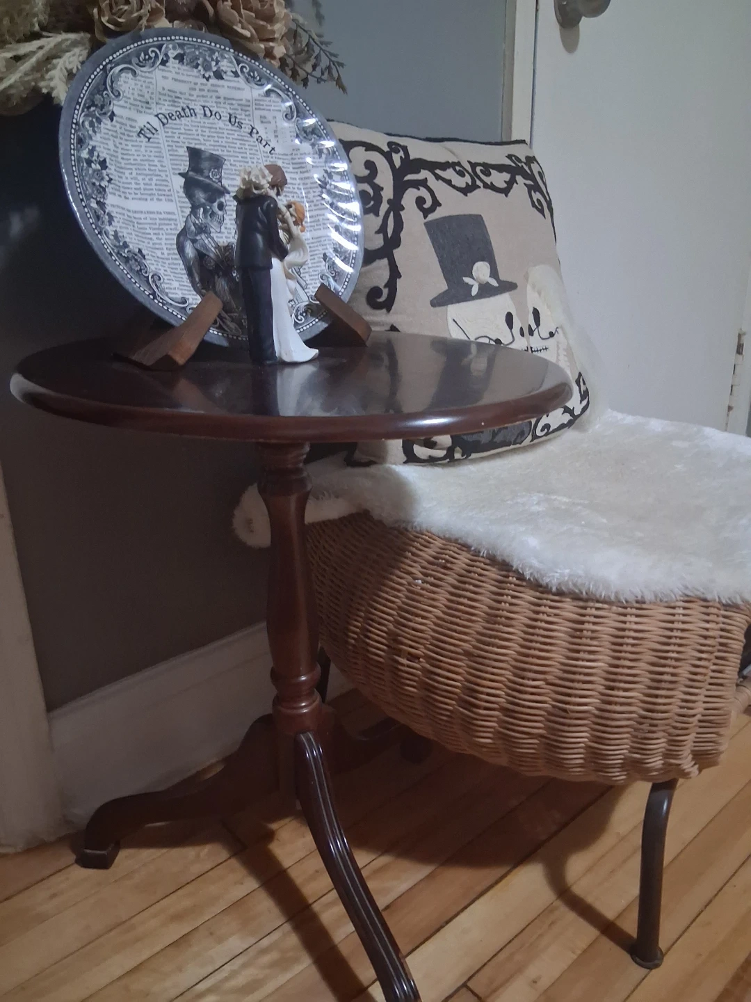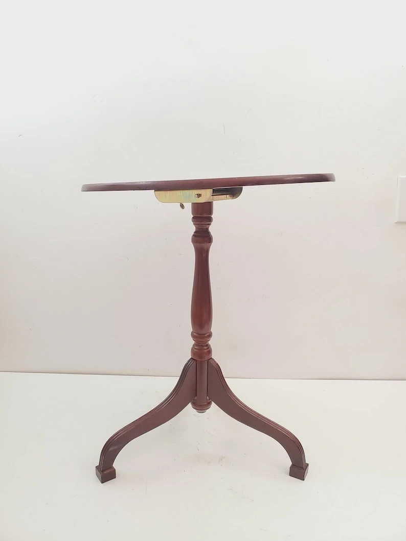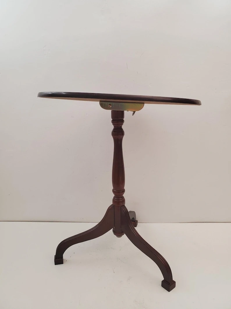 A charming small wooden pedestal side table with a round top. It's made of dark wood and features a sturdy three-legged base. This table's compact size makes it easy to place next to chairs or sofas. It's a versatile piece for holding a drink or a small lamp.