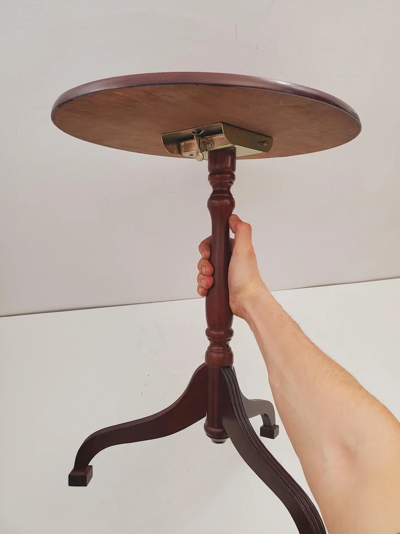 A charming small wooden pedestal side table with a round top. It's made of dark wood and features a sturdy three-legged base. This table's compact size makes it easy to place next to chairs or sofas. It's a versatile piece for holding a drink or a small lamp.