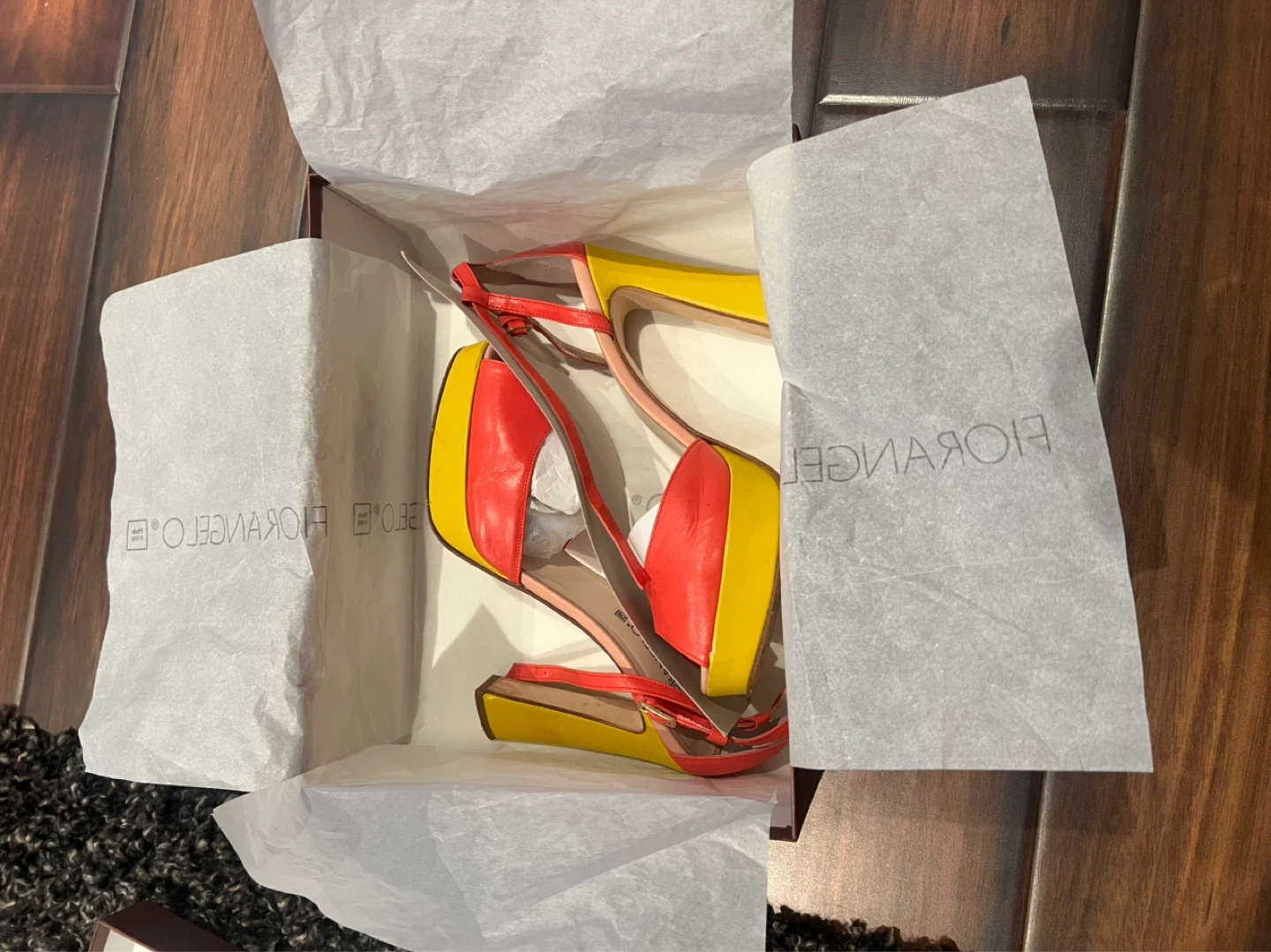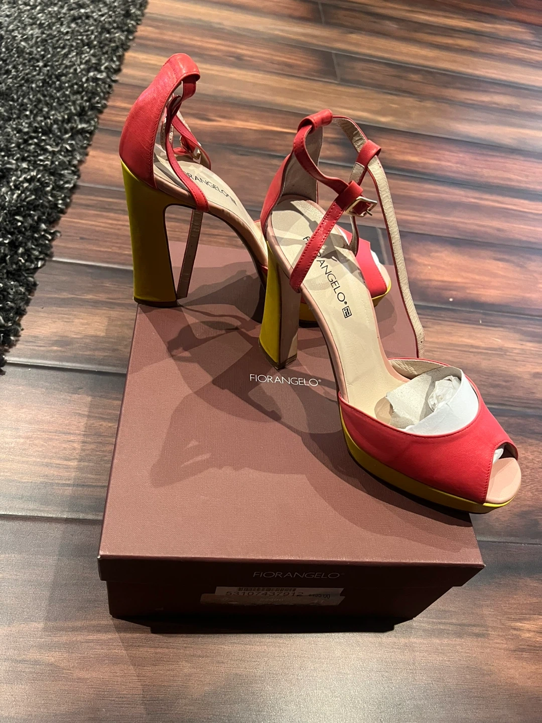 Fiorangelo women's open-toe heels in red and yellow. These stylish heels come with their original box. Made in Italy.