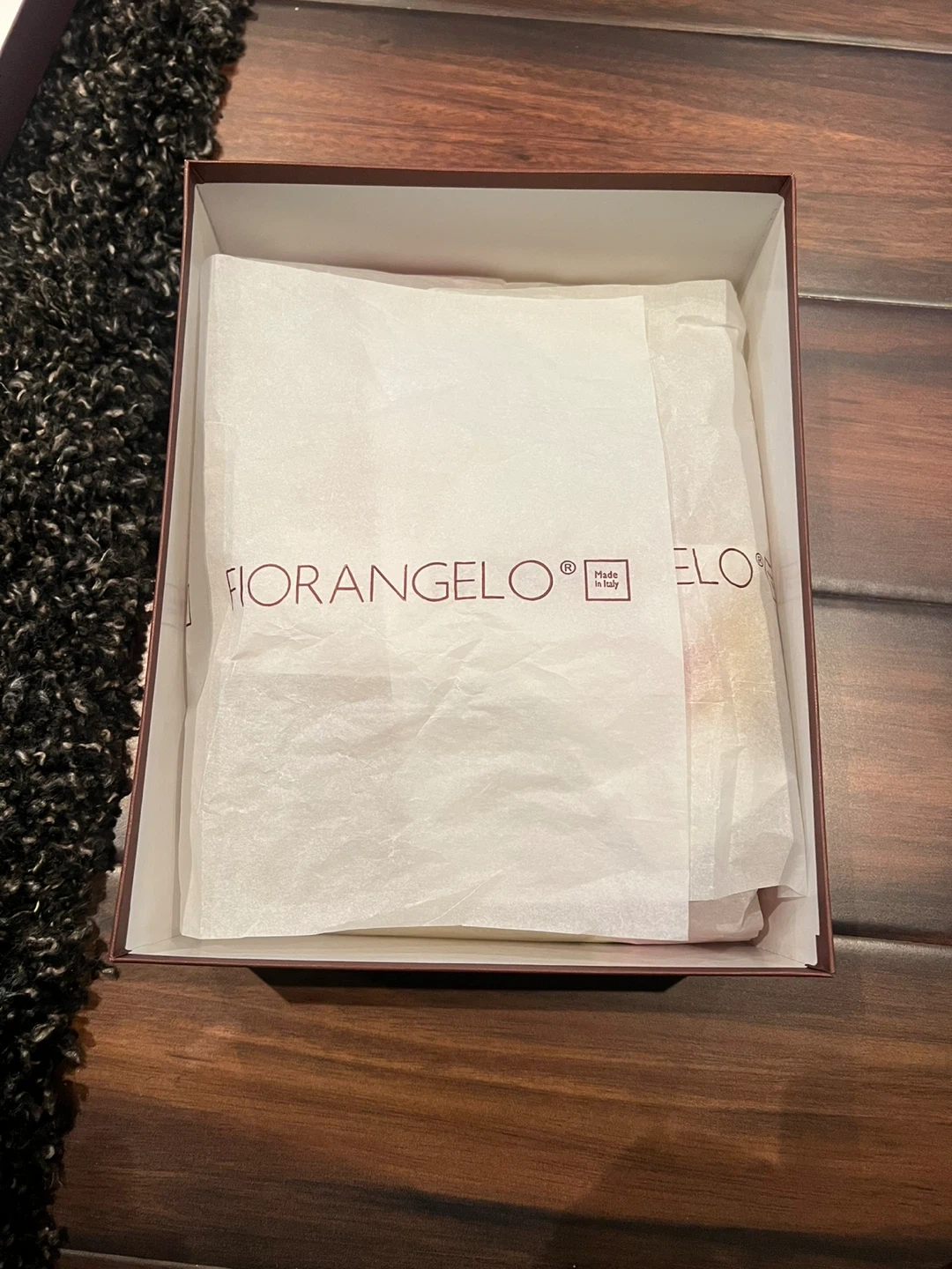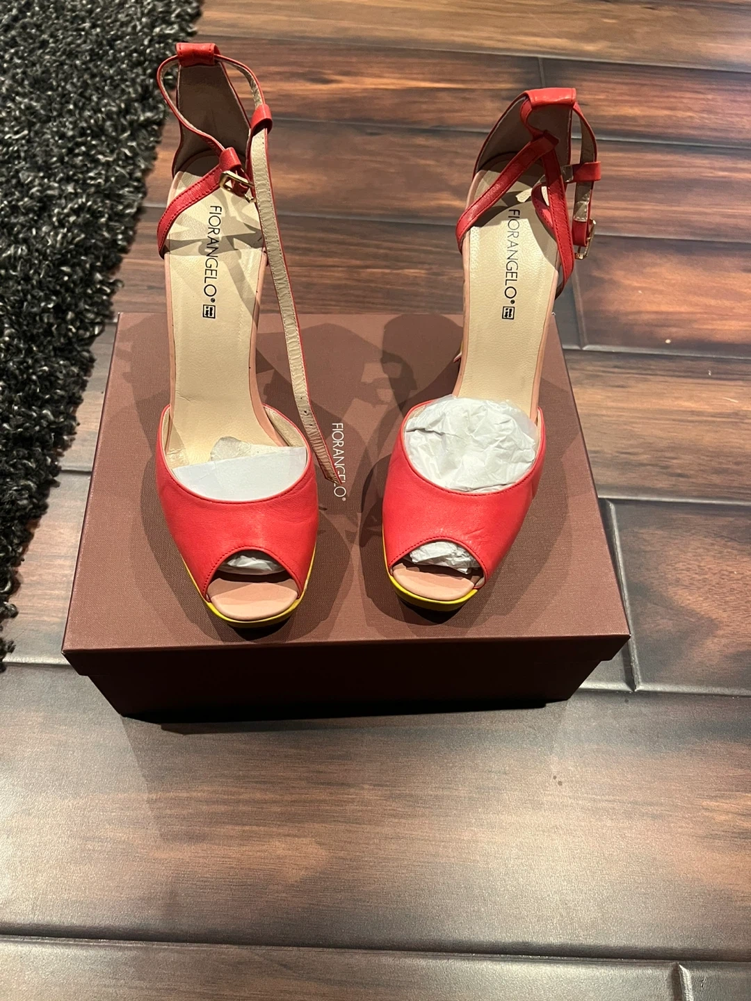 Fiorangelo women's open-toe heels in red and yellow. These stylish heels come with their original box. Made in Italy.