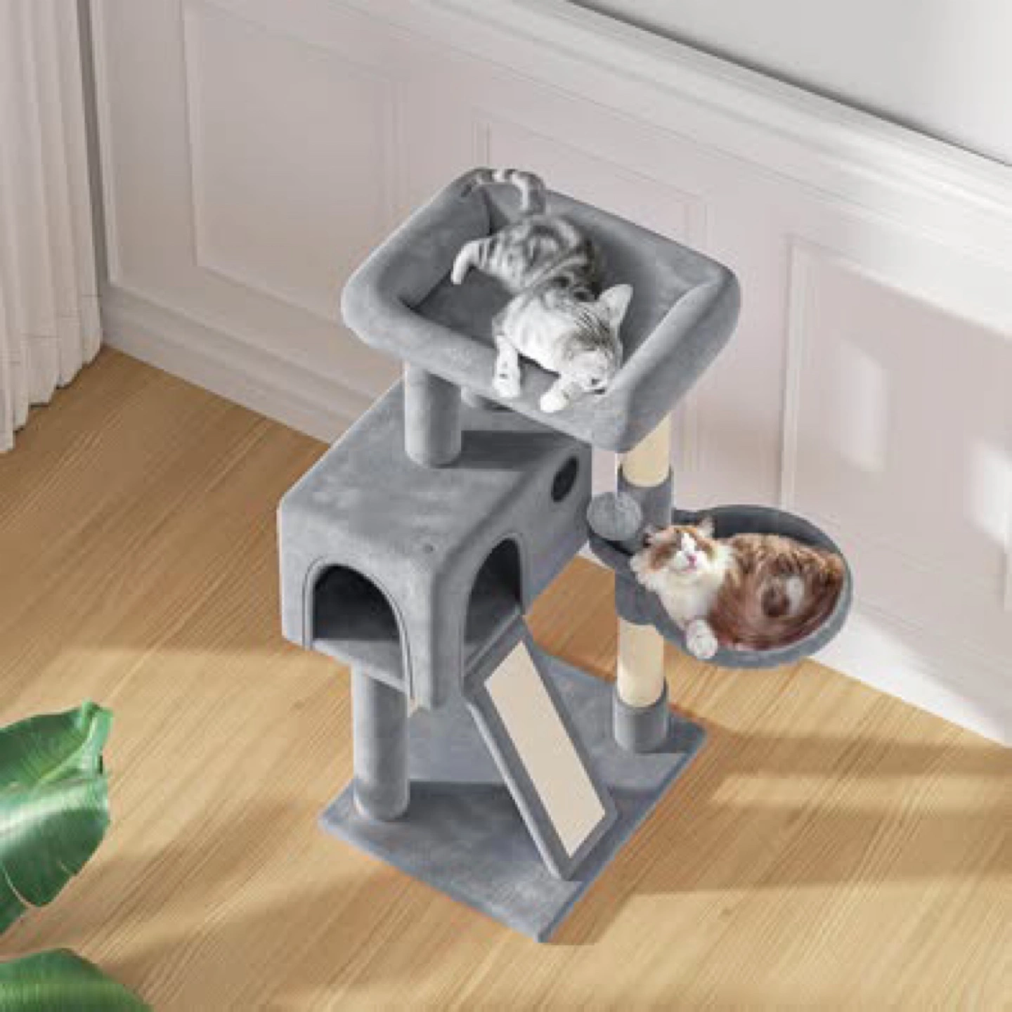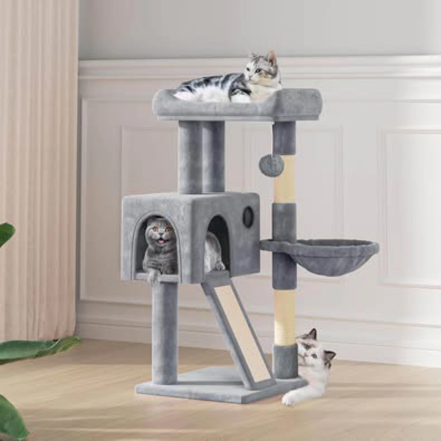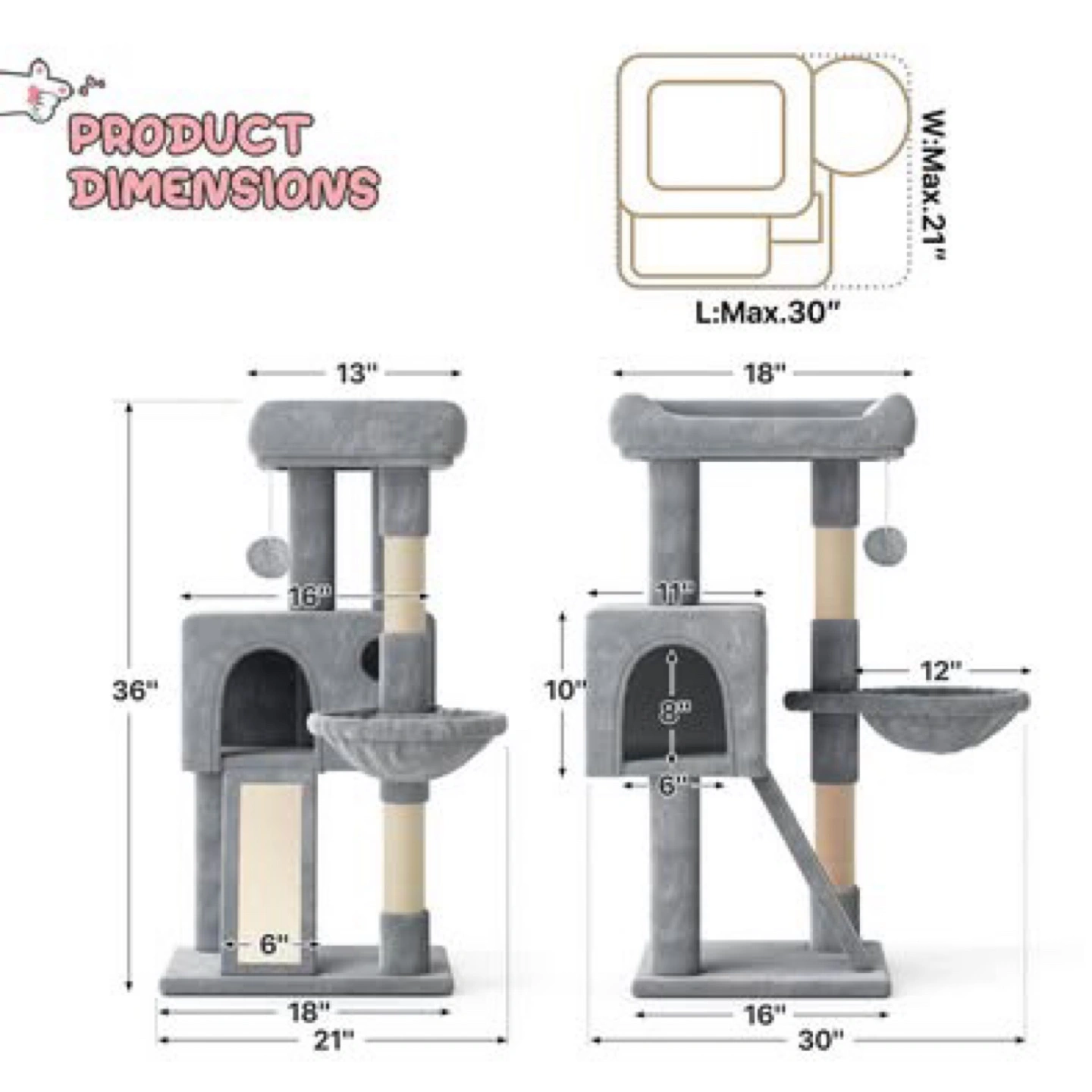 Cat Tree - 36 Inch Tower with Condo, Scratching Post & Board, Hammock, Indoor Cat Climbing Tree, Light Grey