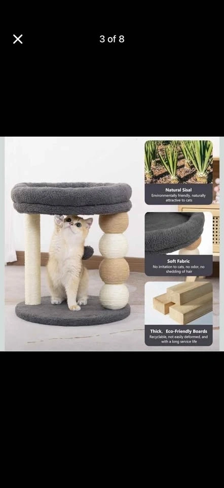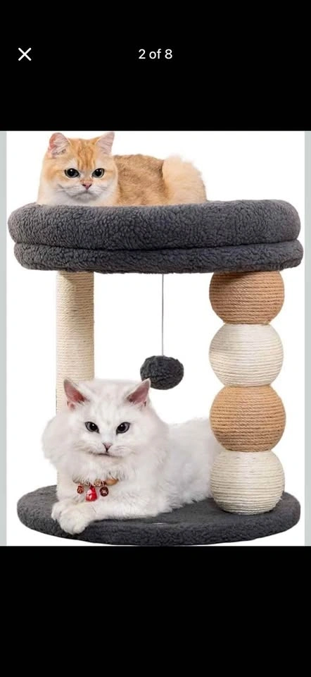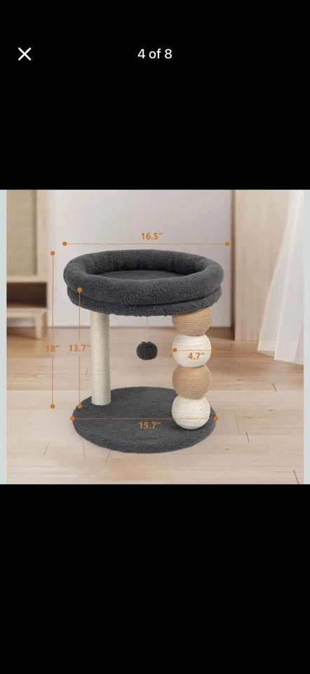 Brand new in box! Dark grey. Easy Assembly & Stability: The cat tree can be assembled in just 10 minutes, making it convenient and quick to set up. Once assembled, it stands sturdy and stable, ensuring long-term use without any wobbling or instability issues. This stability is crucial for providing a safe and secure environment for your cat. Comfortable & Cozy Design: The circular top perch is designed to be incredibly comfortable and cozy for your cat. The plush and skin-friendly material ensures a soft and inviting space for relaxation. The circular shape also allows cats to curl up comfortably or roll into a ball, providing them with a sense of security and comfort. Hygienic Maintenance: The top perch is removable, which makes cleaning and maintenance a breeze. You can easily detach the perch, clean it thoroughly, and reattach it, ensuring a fresh and hygienic environment for your pet. This feature is essential for promoting your cat's health and well-being. Claw Care & Interactive Play: The cat tree includes high-quality natural sisal scratching posts. These posts are designed to encourage healthy claw maintenance for your cat. Cats can scratch and sharpen their claws on the sisal material, which also prevents them from scratching furniture or other surfaces in your home. The cat tree comes with dangling toys, such as a plush ball and a toy mouse. These toys are designed to stimulate your cat's curiosity and encourage interactive play. Versatile & Lightweight: The dimensions of this cat tree are 15.75"L x 15.75"W x 17.7"H. Compare to the large cat tree tower, this cat tree is lightweight and easy to move around, allowing you to place it in different locations throughout your home. This versatility ensures that your cat always has a cozy and secure resting place, whether it's in the living room, bedroom, or any other area of your home. It also allows you to change the cat tree's location to provide variety and stimulation for your cat.
