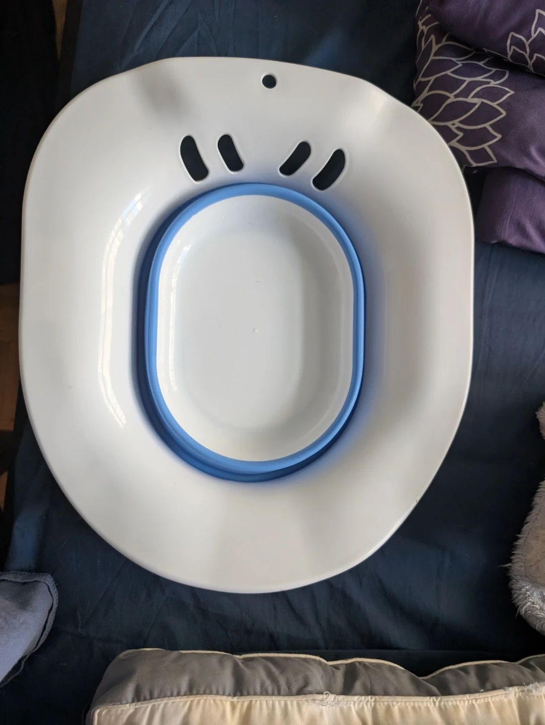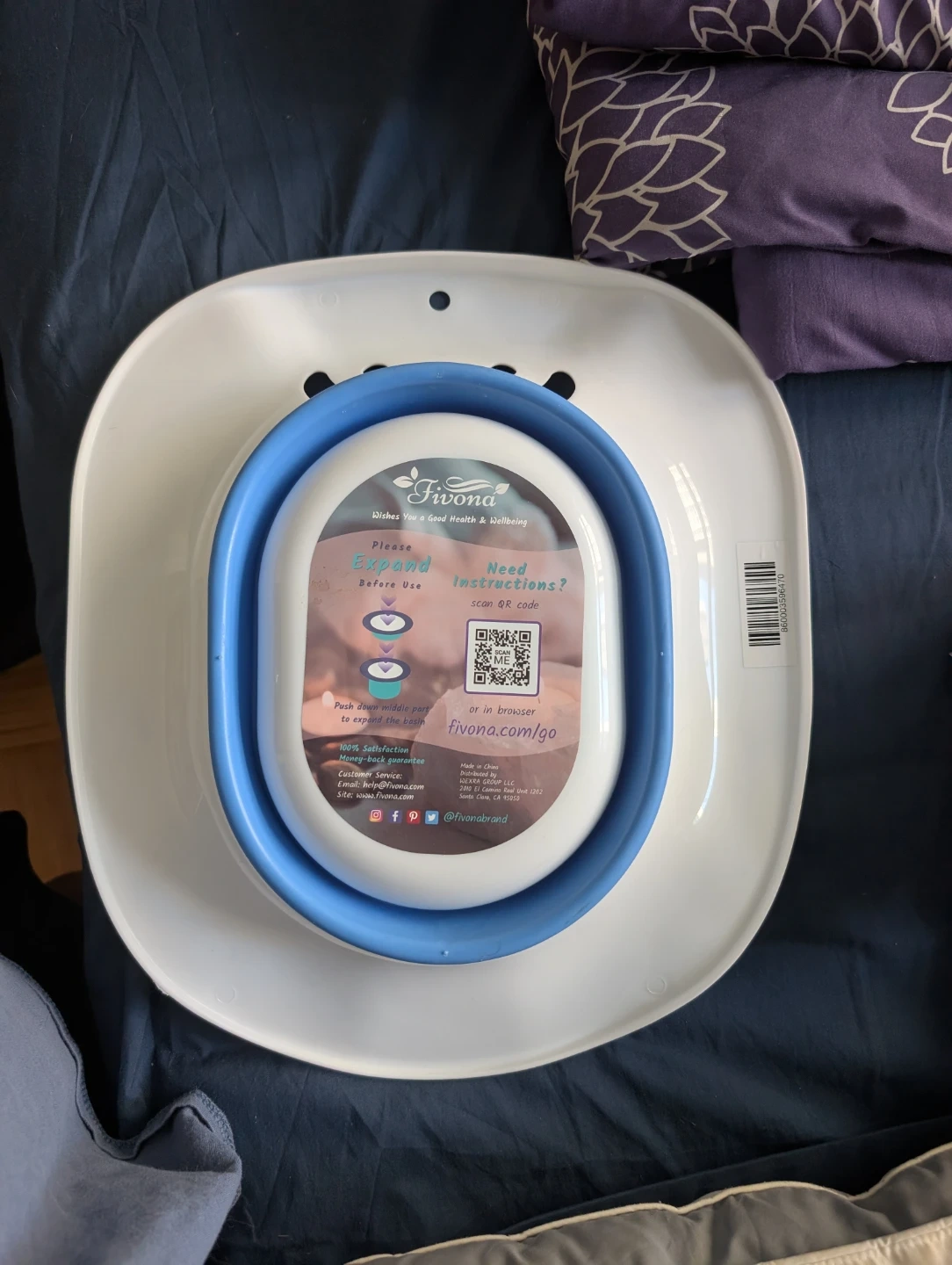 This Fivona collapsible sitz is perfect for your postpartum journey. It can be opened and fit over your toilet and folded compactly to be stored after use.