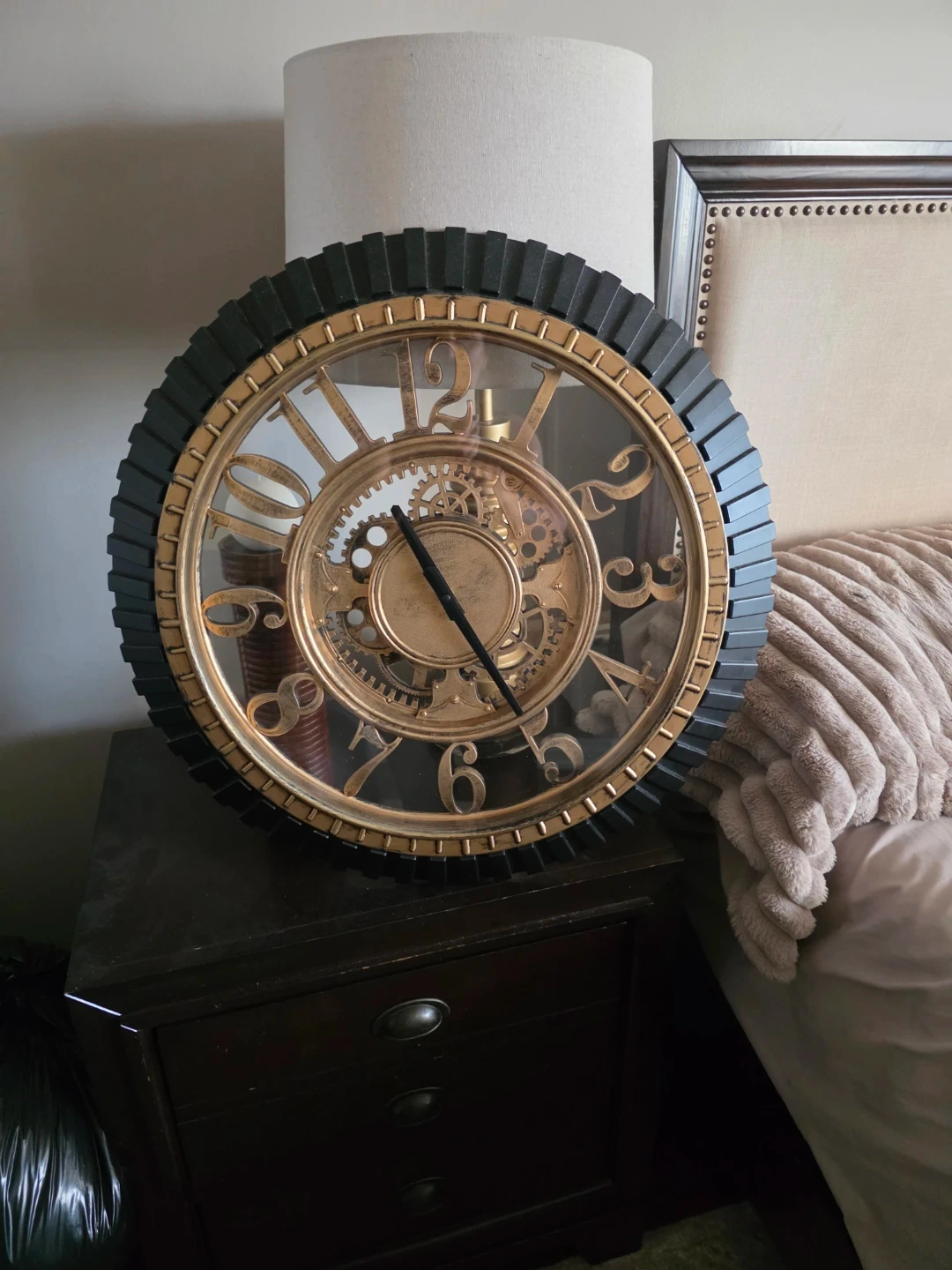This is a large decorative wall clock. It features a black outer rim with gear-like details and a gold inner frame. The clock face has Roman numerals and visible moving gold gears behind the hands. It's a striking piece for any room!