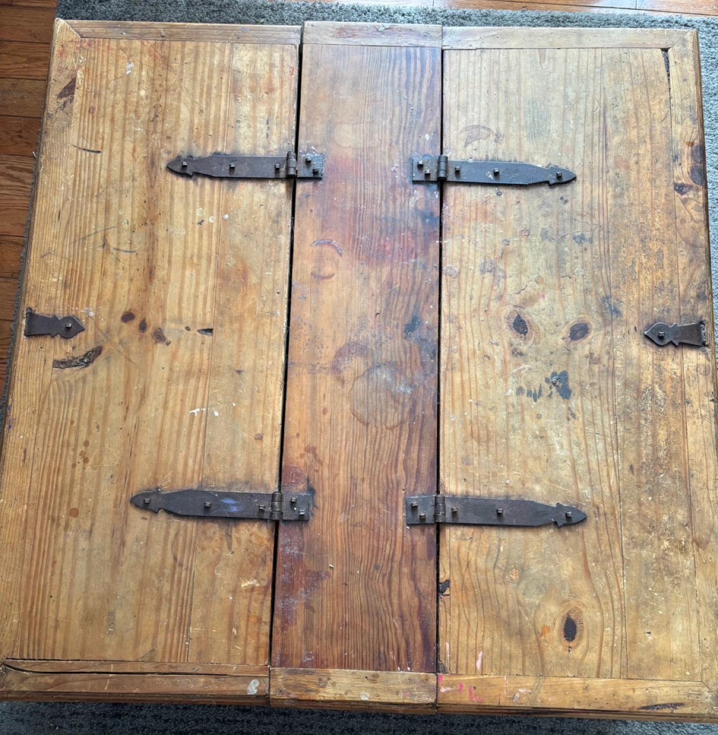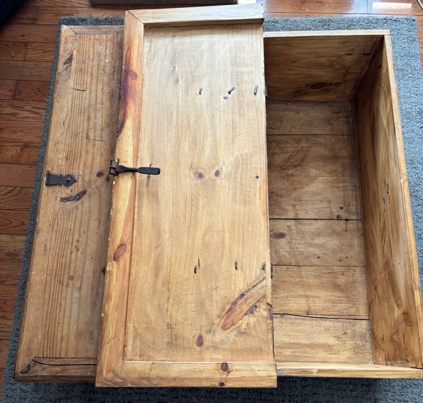 Large wooden farmhouse storage trunk. Solid wood construction. Used Rustic style. Great for storage or as a coffee table.