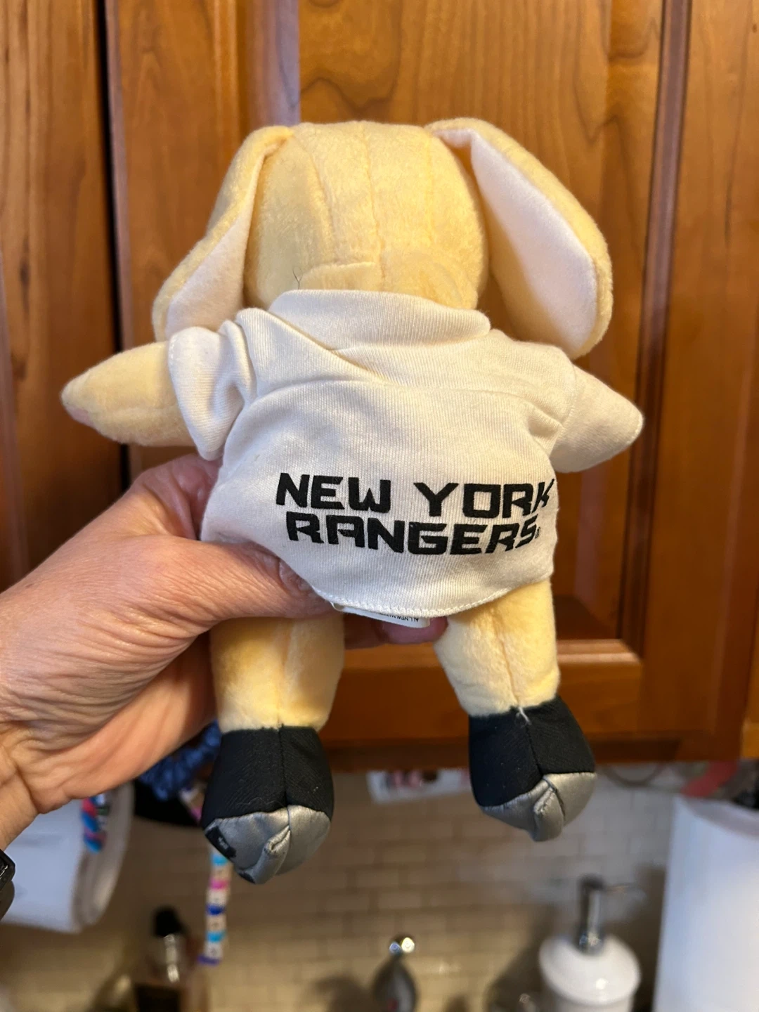 This is a yellow plush dog toy wearing a New York Rangers t-shirt. The shirt has the Rangers logo on the front and "NEW YORK RANGERS" printed on the back. It's a fun collectible for any fan! 7.5 inches tall