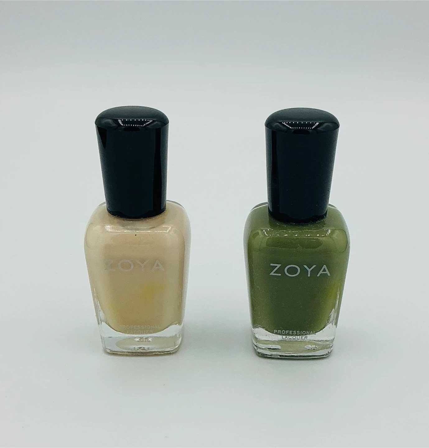 Two bottles of Zoya Professional Lacquer nail polish. Great for those with a colour analysis of True/Warm or Deep/Dark Autumn.