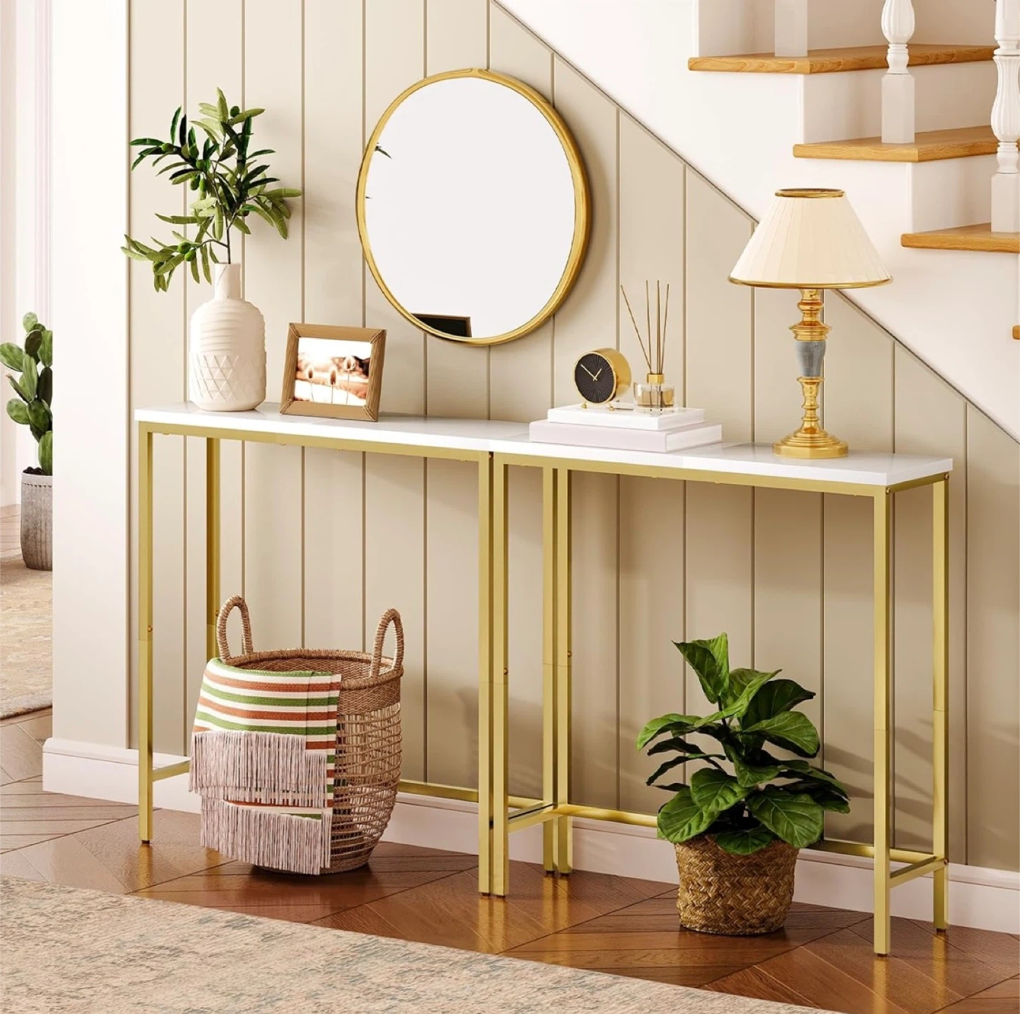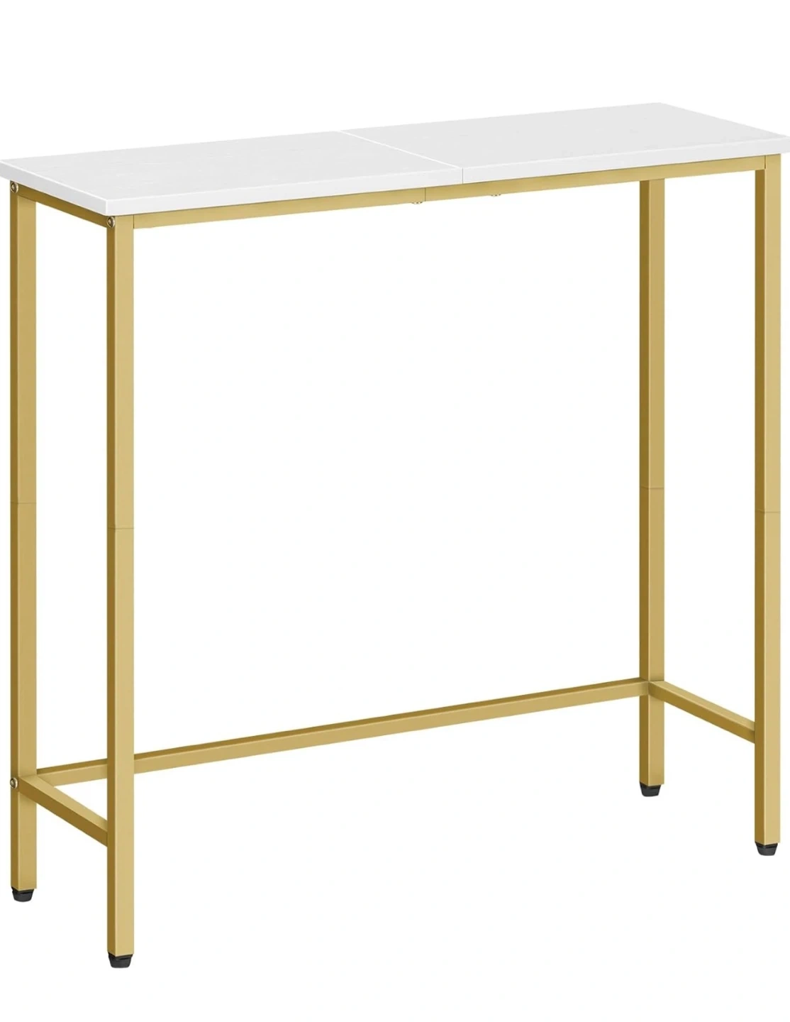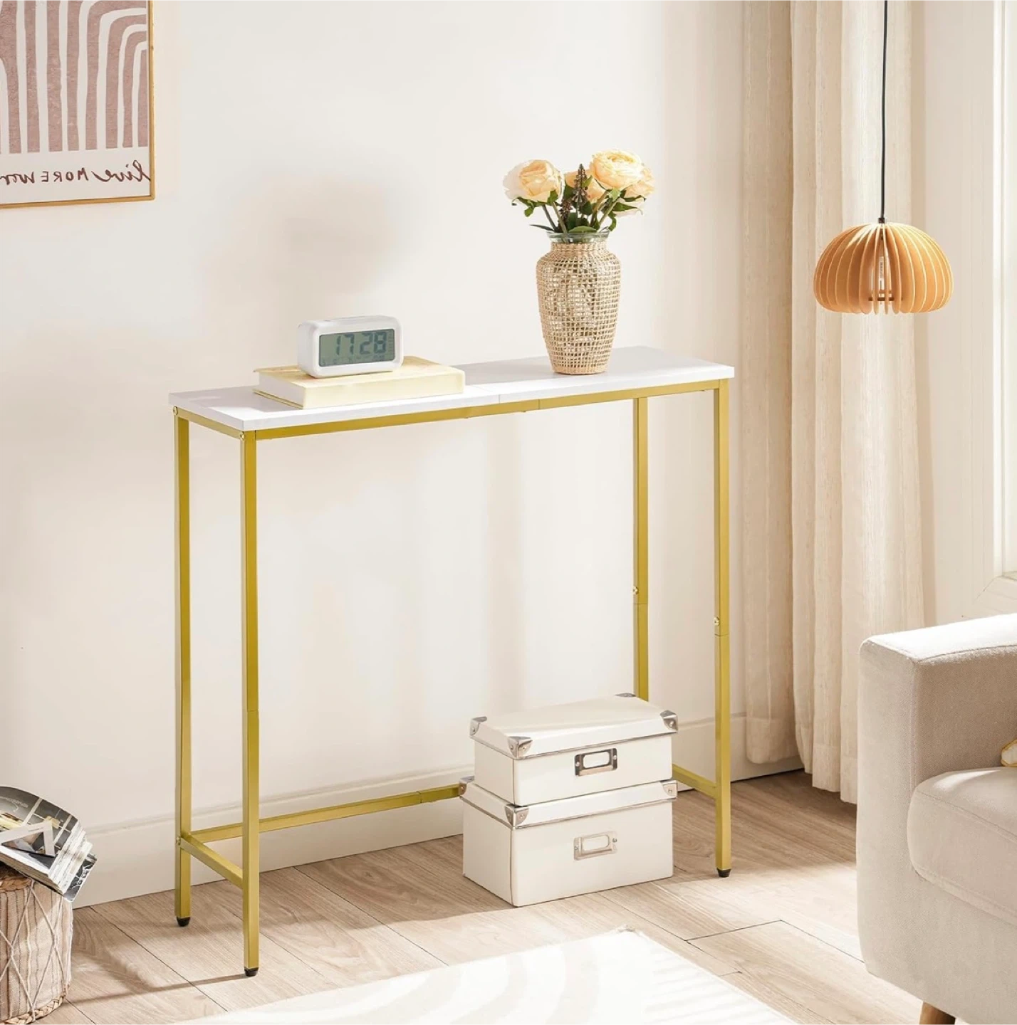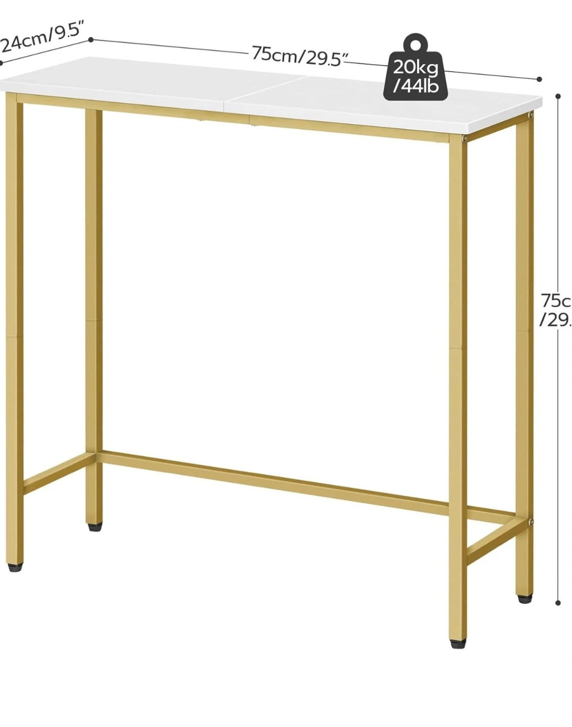 This narrow console table features a white marble-look top and a sturdy gold metal frame. It's 75cm/29.5" long, 24cm/9.5" deep, and 75cm/29.5" high, with a weight capacity of 20kg/44lb. It's a stylish spot for keys, mail, or decor. Great for hallways or small spaces!