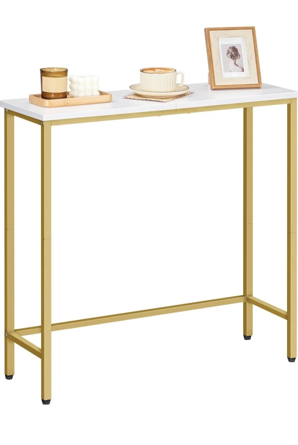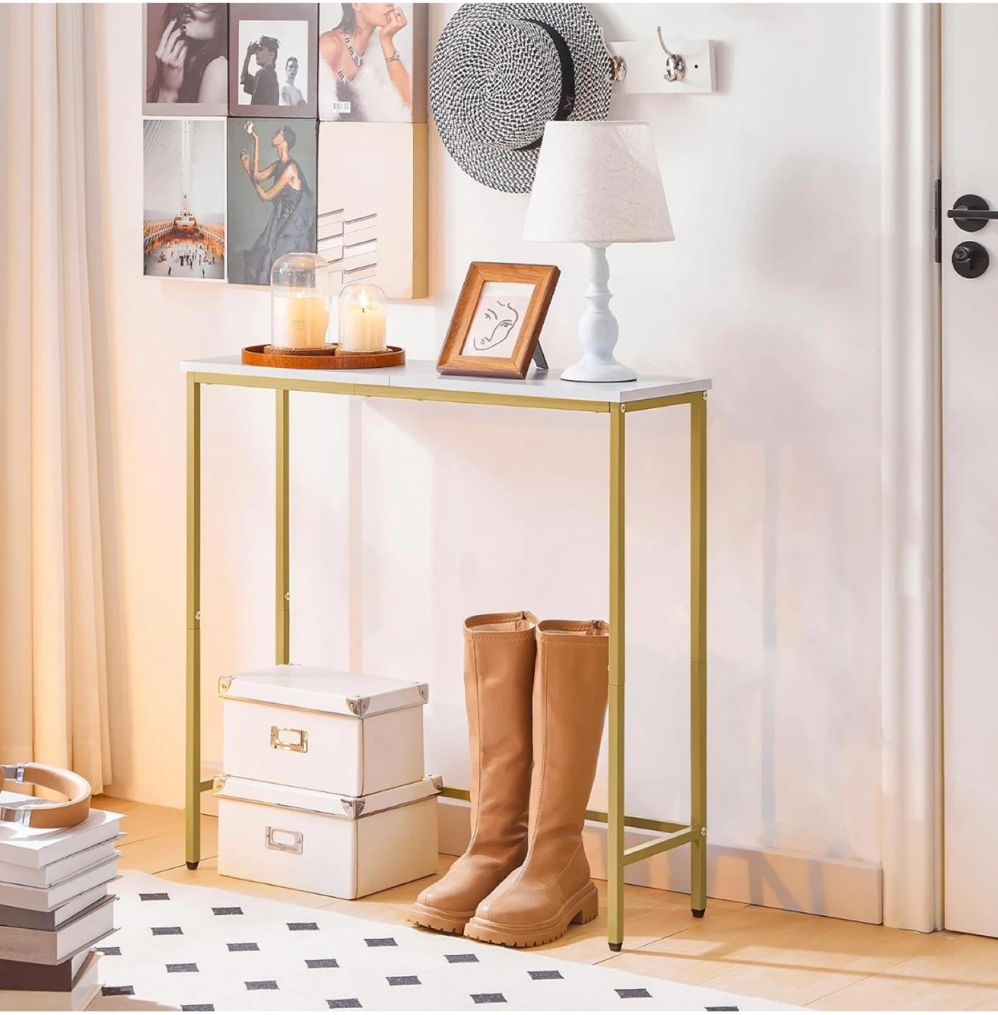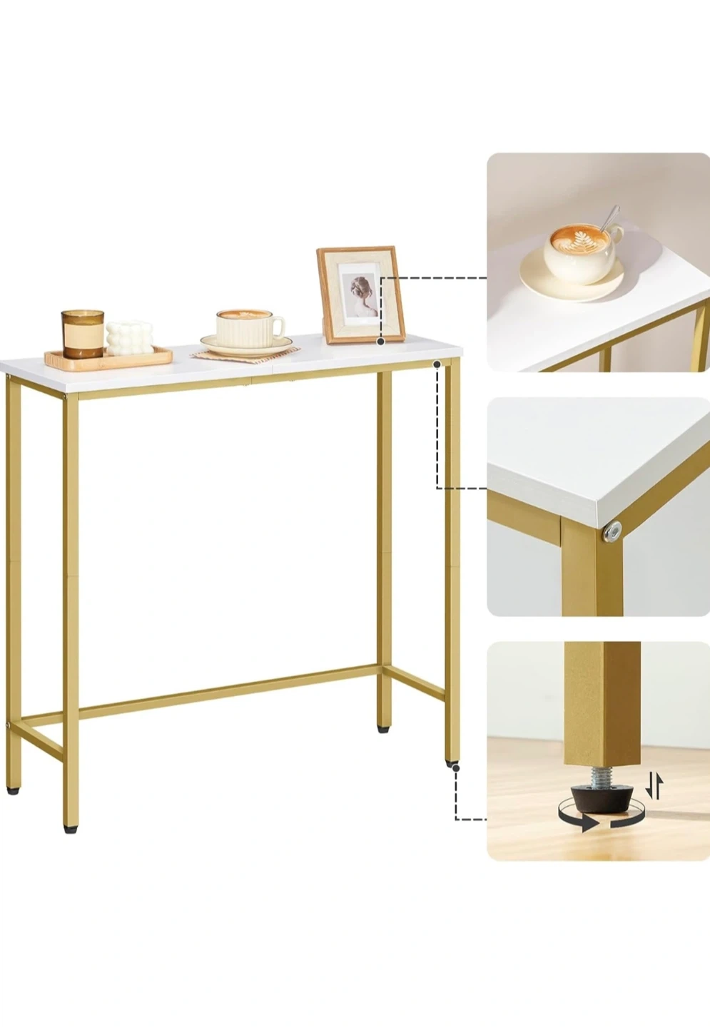 This narrow console table features a white marble-look top and a sturdy gold metal frame. It's 75cm/29.5" long, 24cm/9.5" deep, and 75cm/29.5" high, with a weight capacity of 20kg/44lb. It's a stylish spot for keys, mail, or decor. Great for hallways or small spaces!