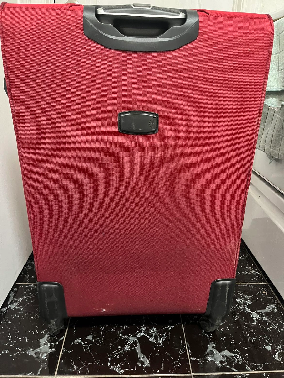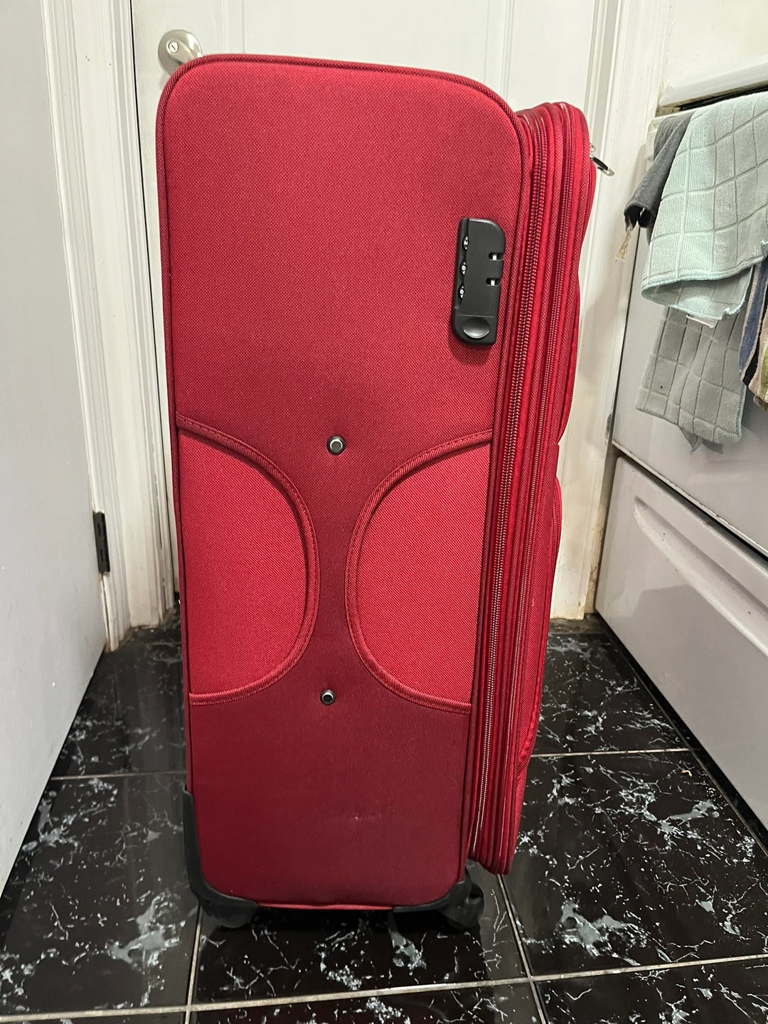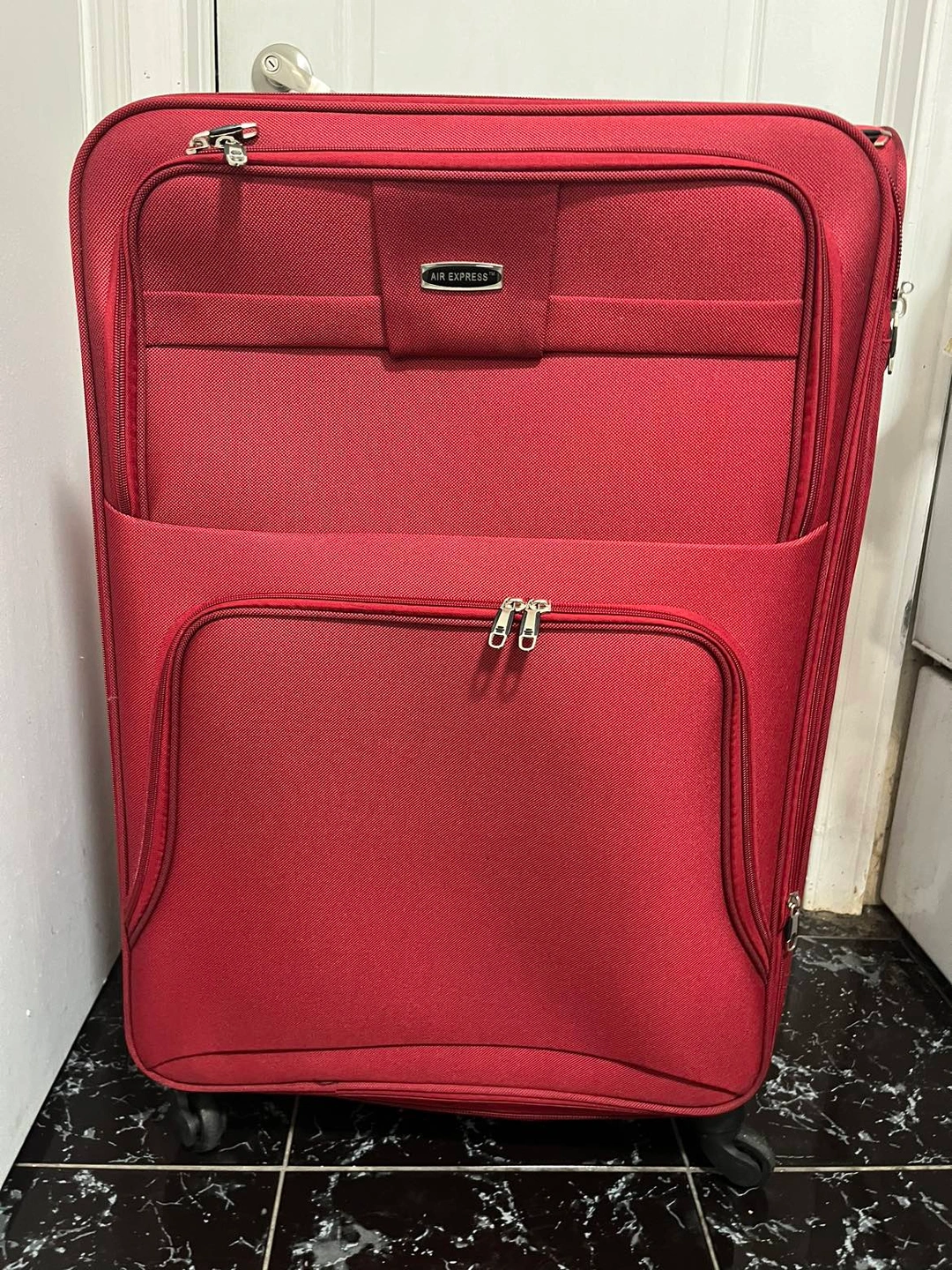 Red suitcase with 4 wheels for easy movement, it also has a 3 digit lock for security. Brand AirExpress. Only used it in one trip, original price $150