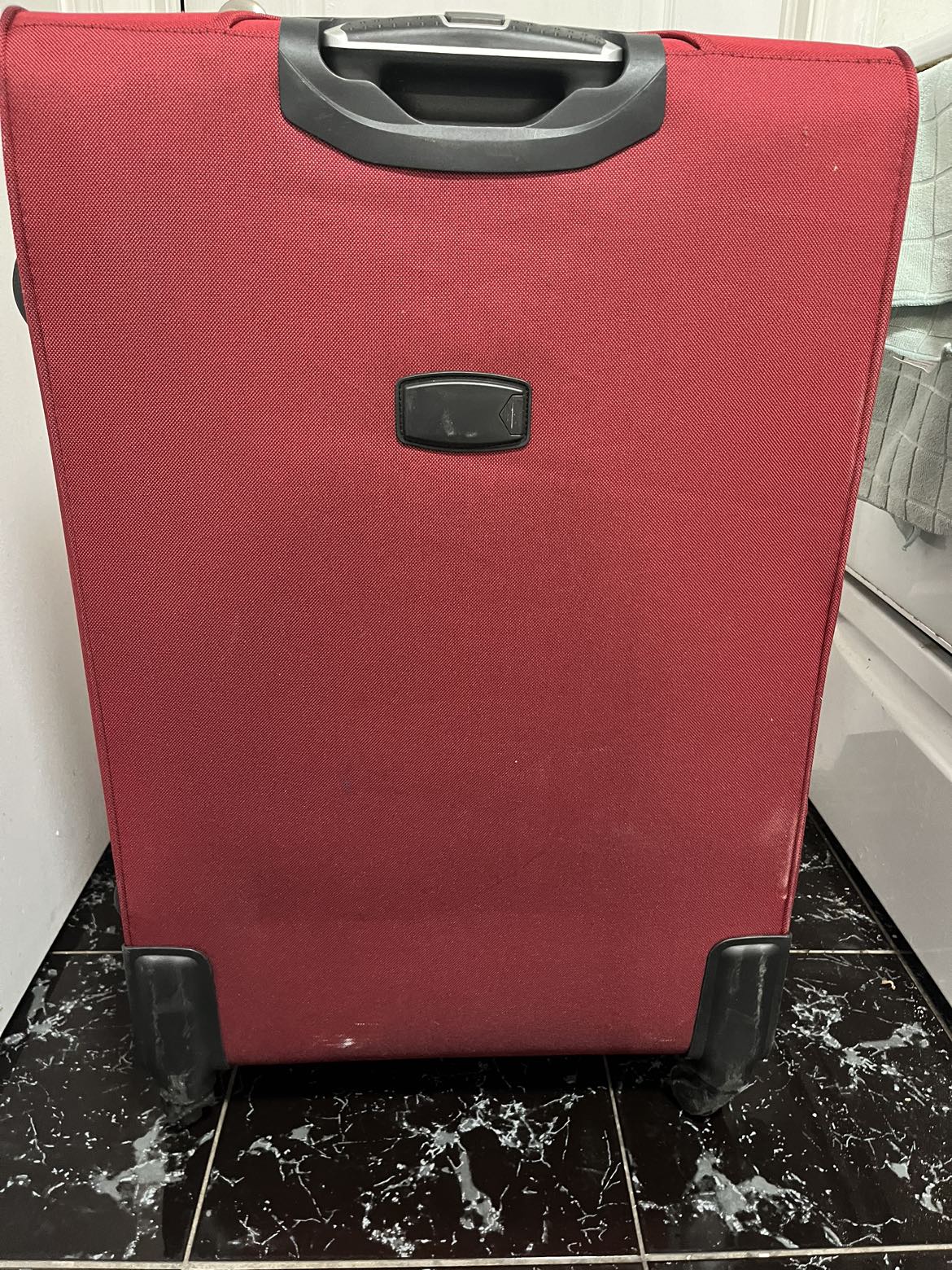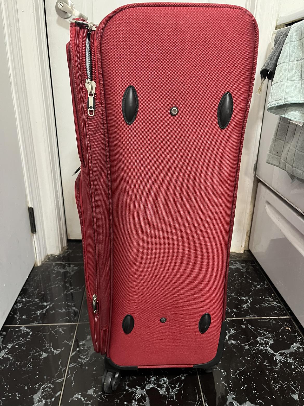 Red suitcase with 4 wheels for easy movement, it also has a 3 digit lock for security. Brand AirExpress. Only used it in one trip, original price $150