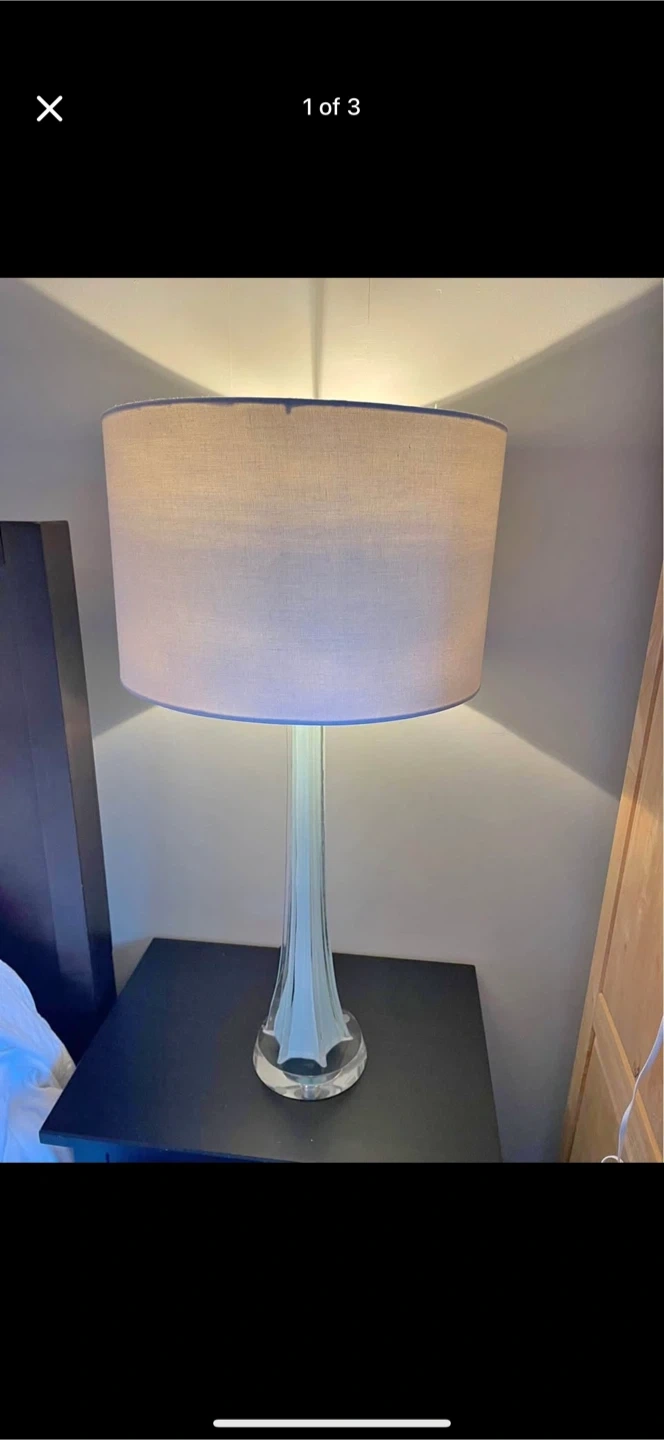 This table lamp features a clear glass base with a white drum shade. It's a stylish accent for any bedside table or living room. The lamp provides warm, ambient lighting.