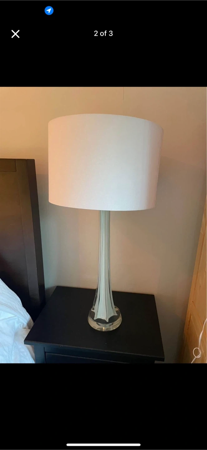This table lamp features a clear glass base with a white drum shade. It's a stylish accent for any bedside table or living room. The lamp provides warm, ambient lighting.