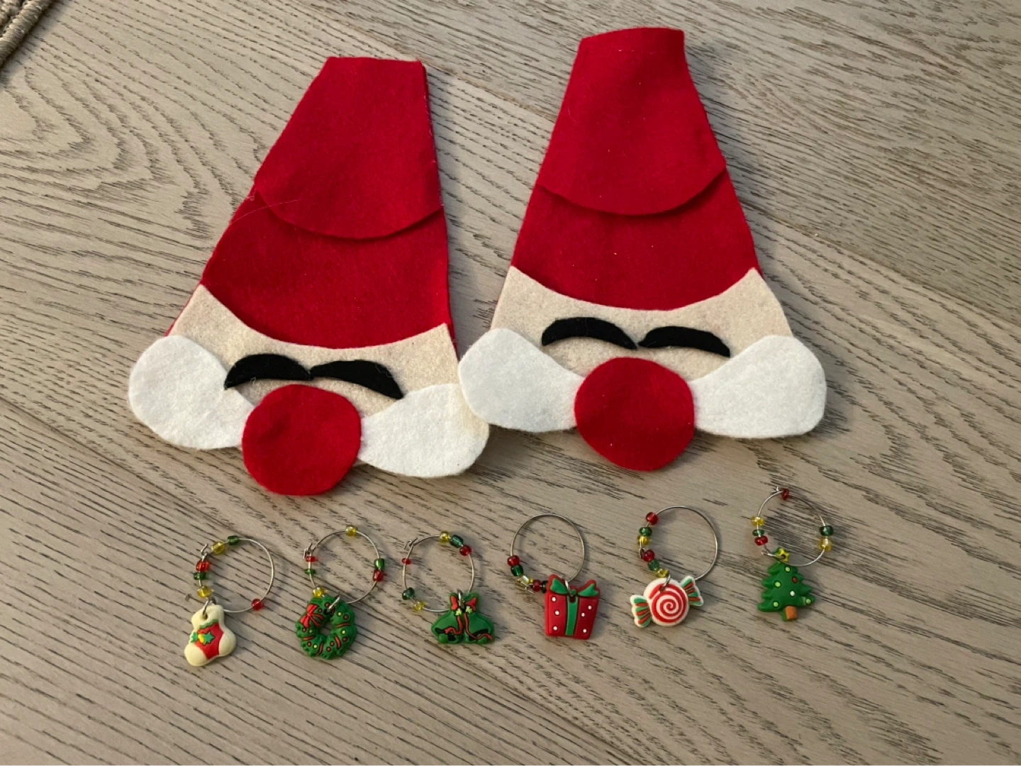 This set includes two Santa hat decorations and six assorted Christmas-themed charms. The charms are crafted from felt and feature festive designs like stockings, wreaths, presents, candy canes, and Christmas trees. They're perfect for identifying wine glasses at holiday gatherings!