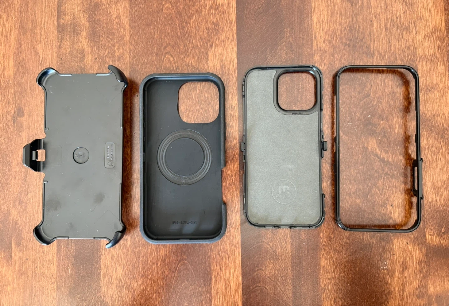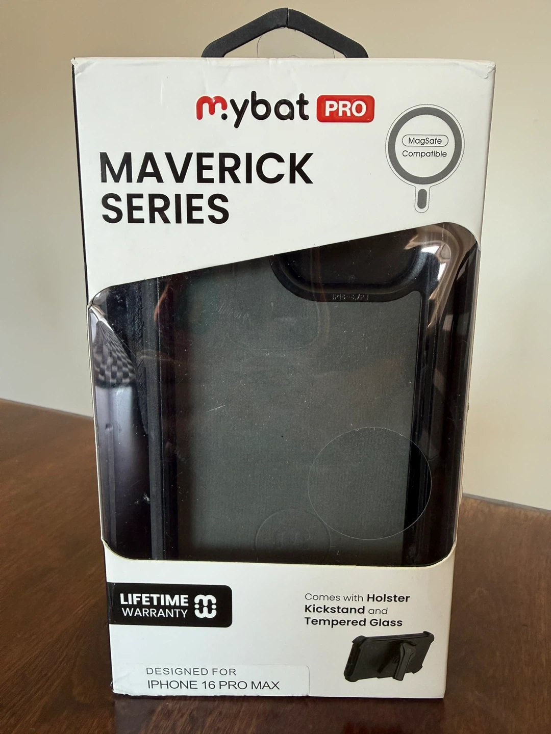 mybat PRO Maverick Series holster case designed for the iPhone 16 Pro Max. It's MagSafe compatible and comes with a 360° rotating holster clip. The case includes a hard inner shell, a soft padded outer cover, and a kickstand.