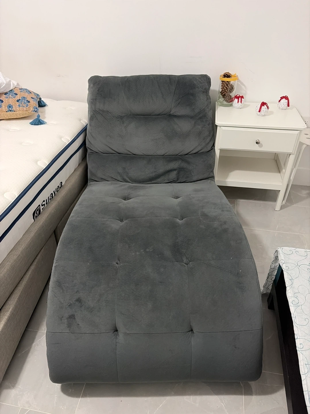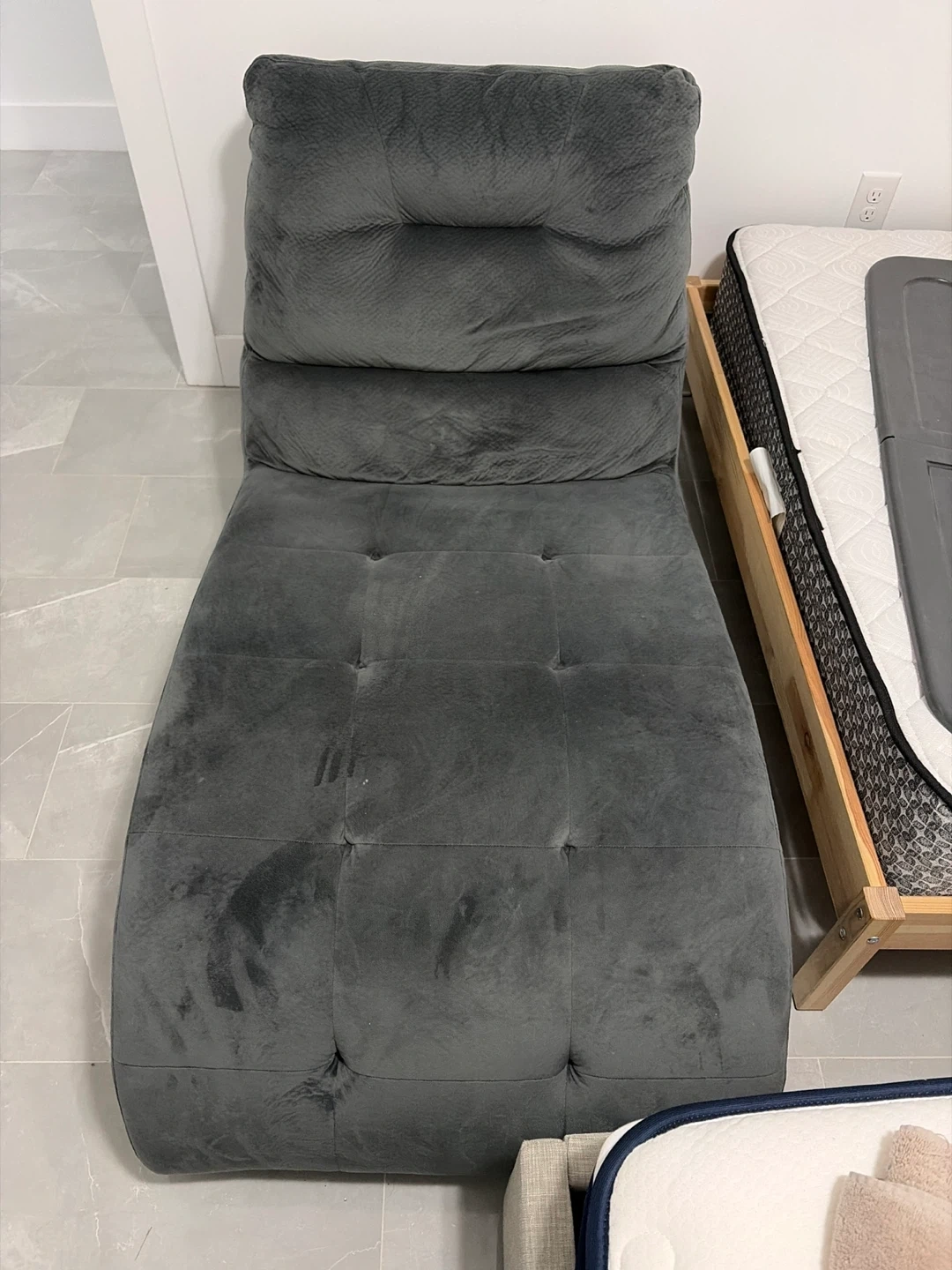 This is a comfortable gray chaise lounge chair. It's made of soft fabric with button tufting on the seat and back. The reclined design offers great support for lounging. It's a stylish addition to any living space!