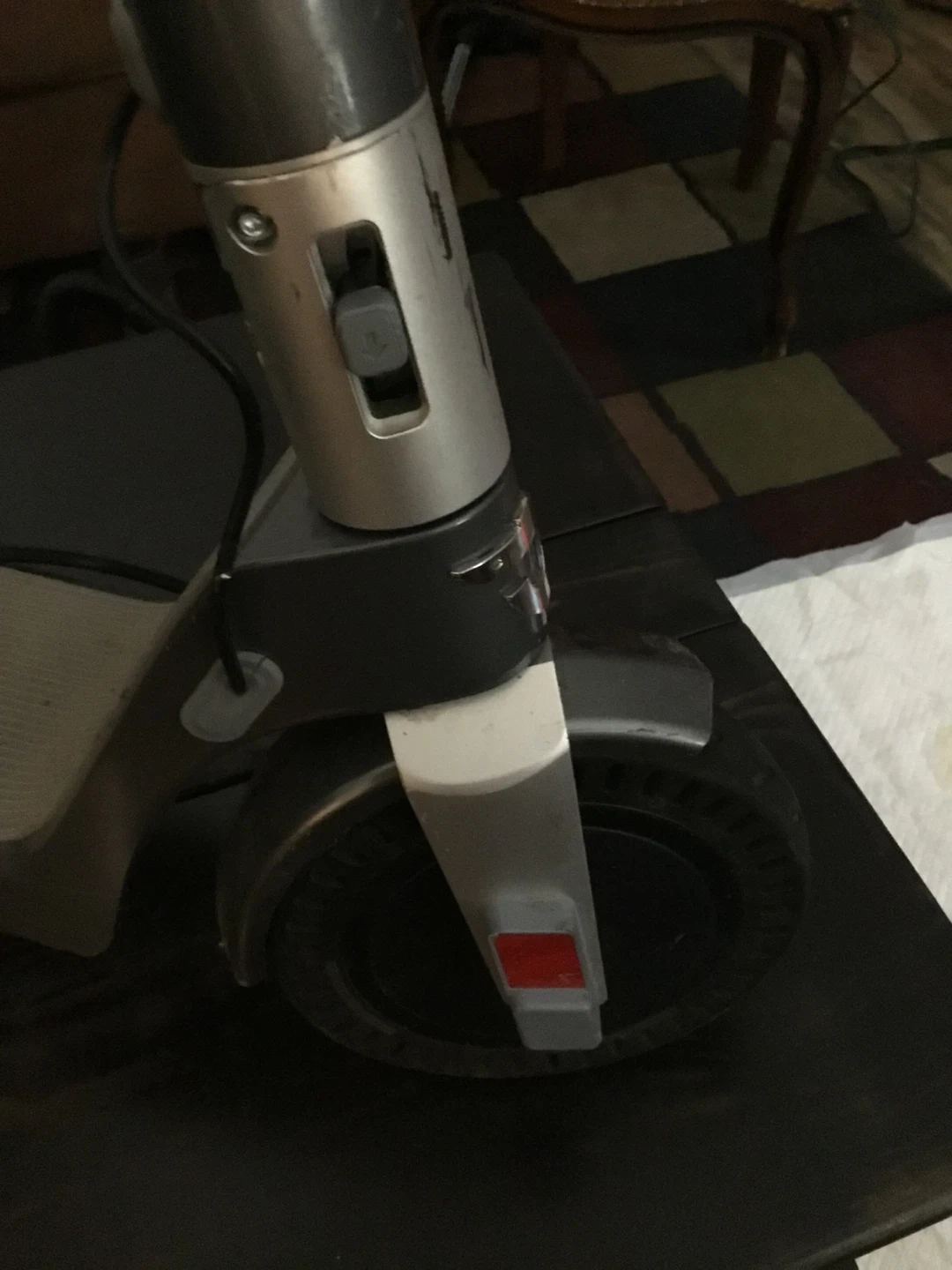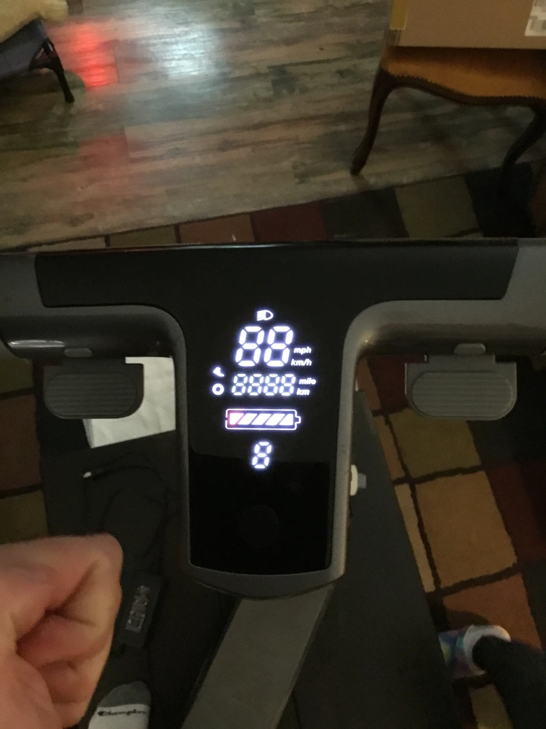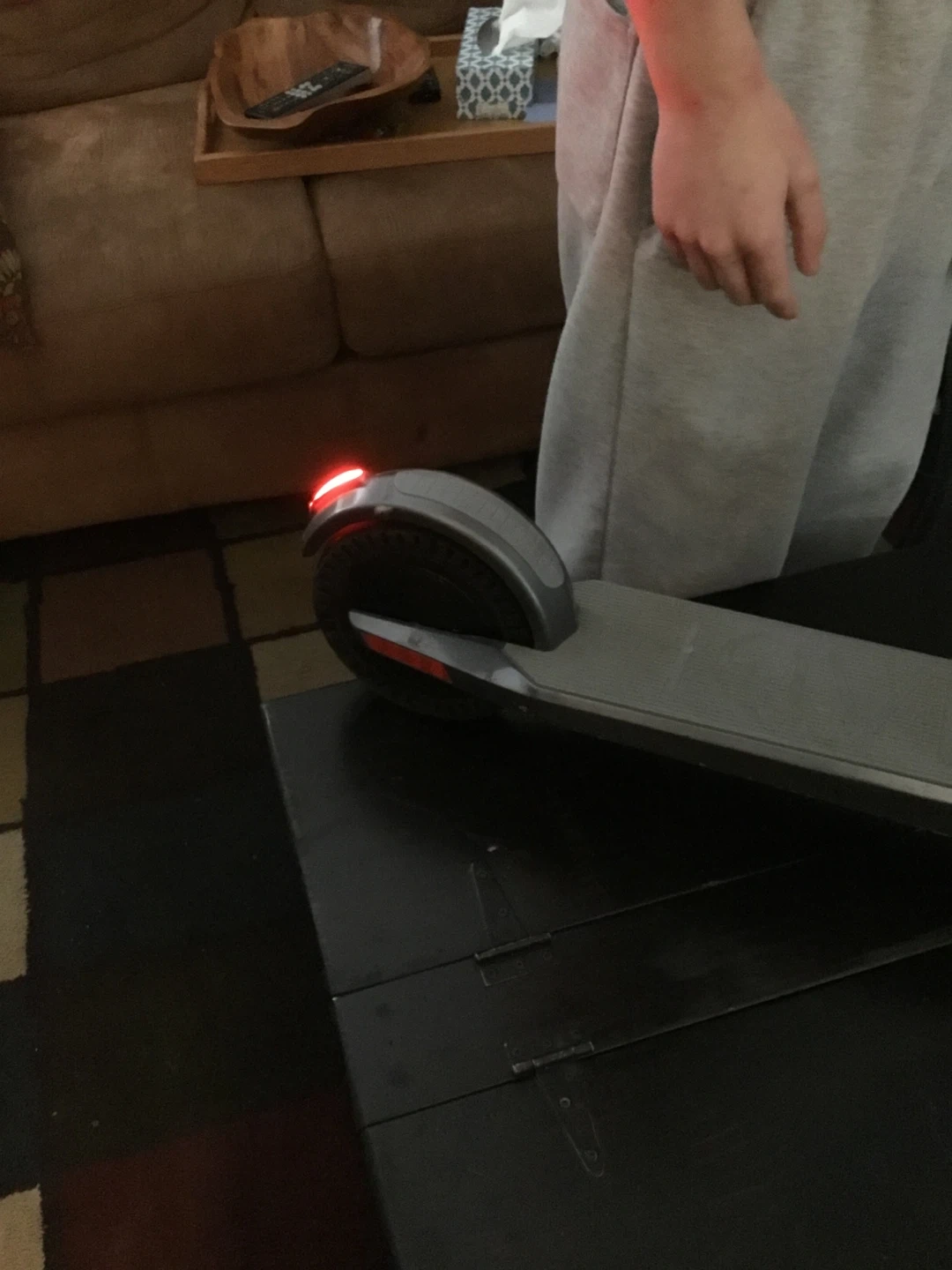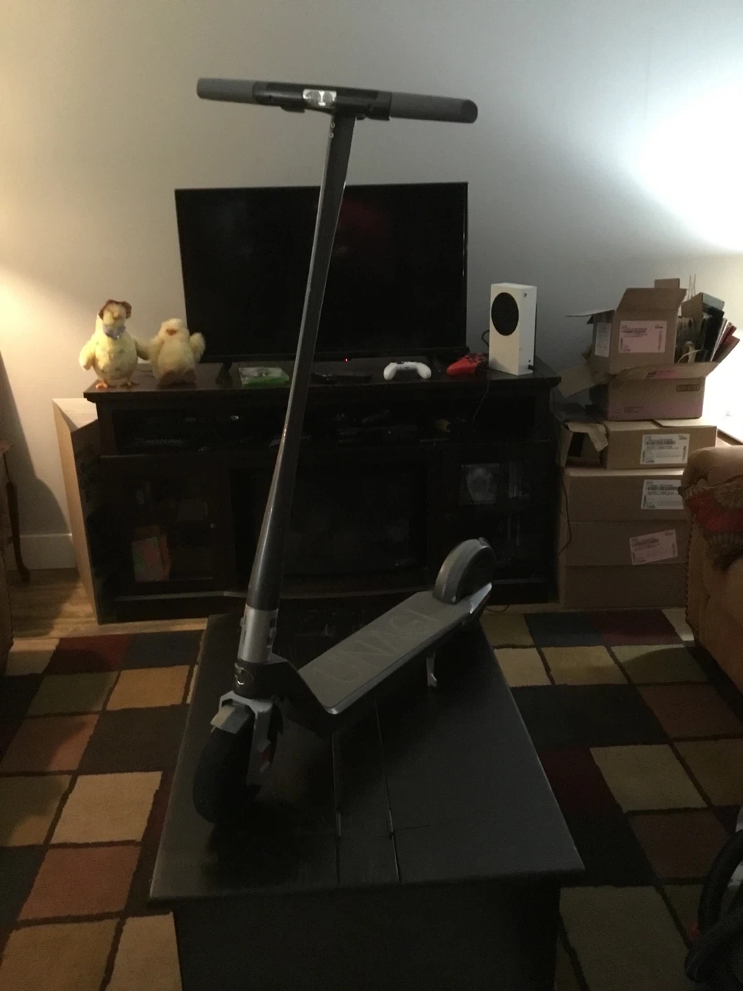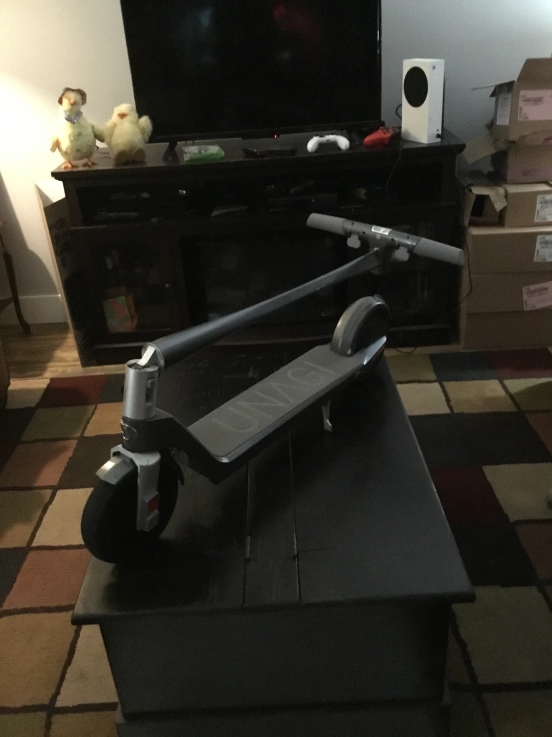 This is a Unagi electric scooter. It's grey with a digital display showing speed and battery level. Features a rear brake light.
