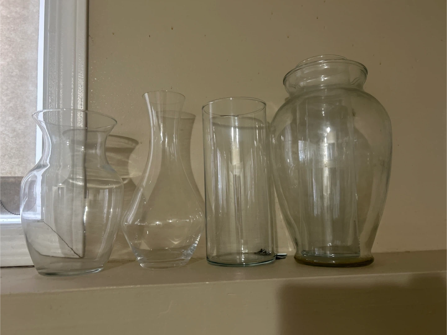 This set includes four clear glass vases of varying shapes and sizes. They're made of durable glass. These vases are great for displaying flowers or as decorative pieces in your home.