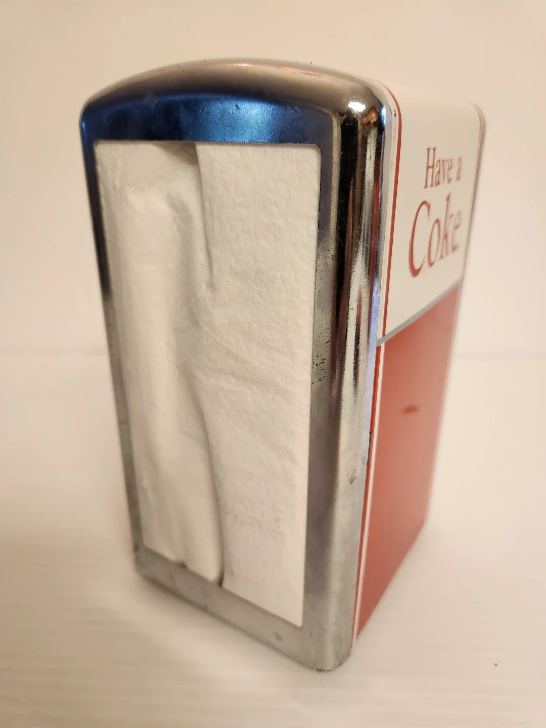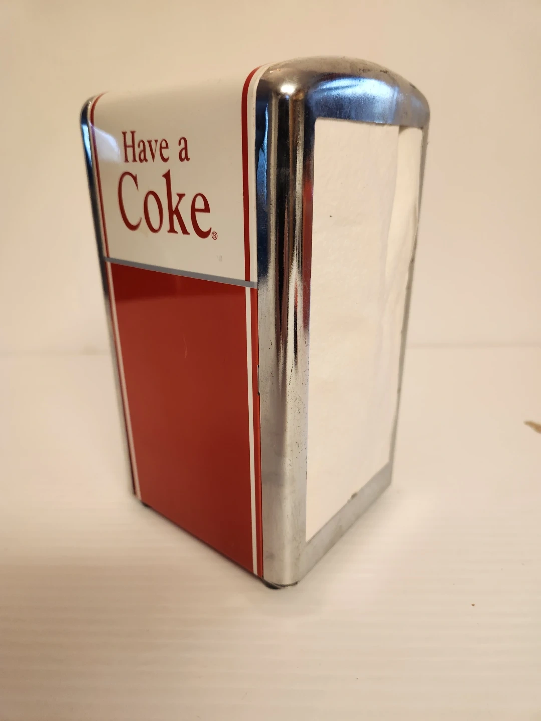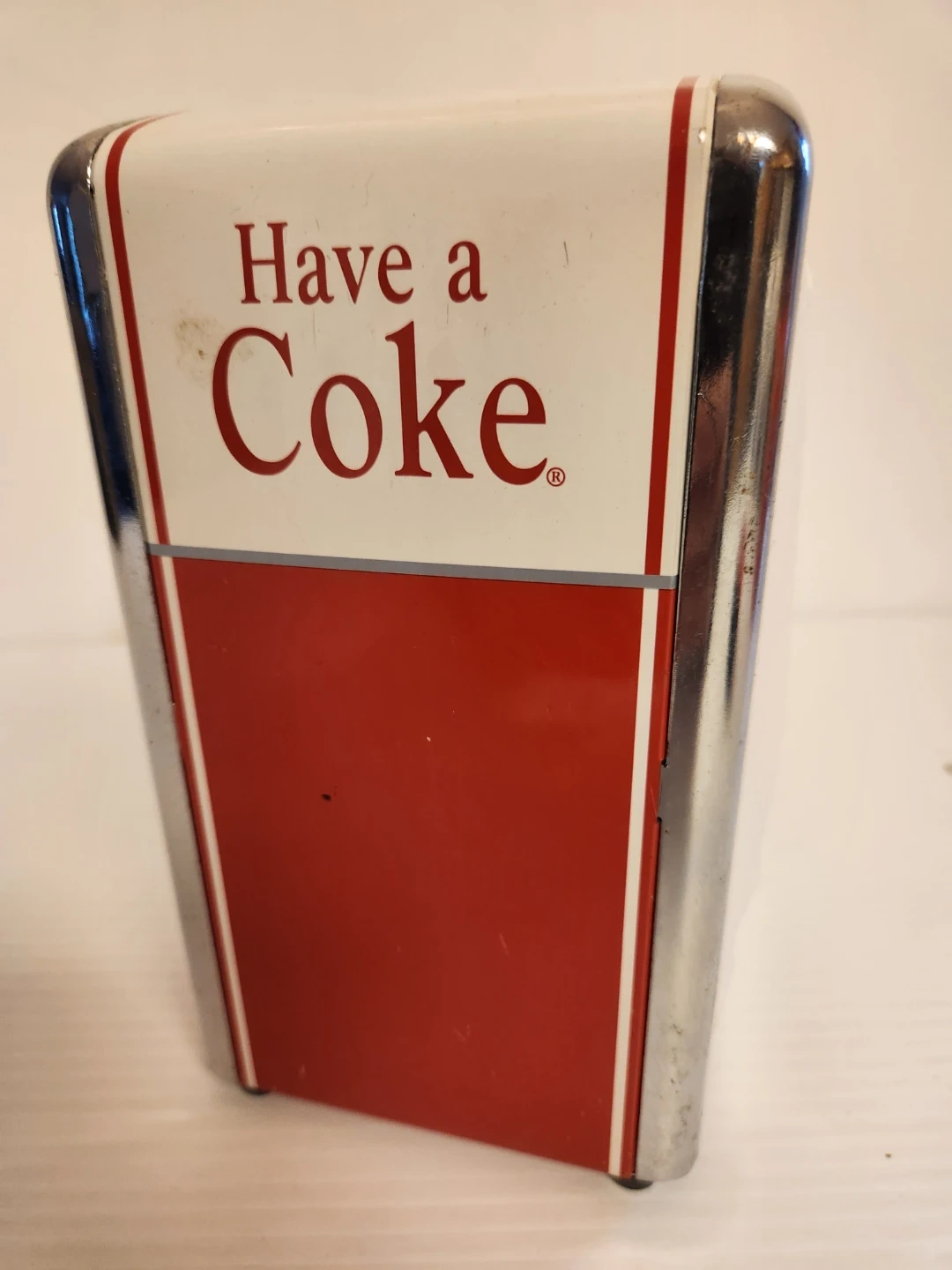 Retro Coca-Cola napkin holder, perfect for adding a touch of vintage charm to your kitchen or diner. Features the classic 'Have a Coke' slogan and durable metal construction.
