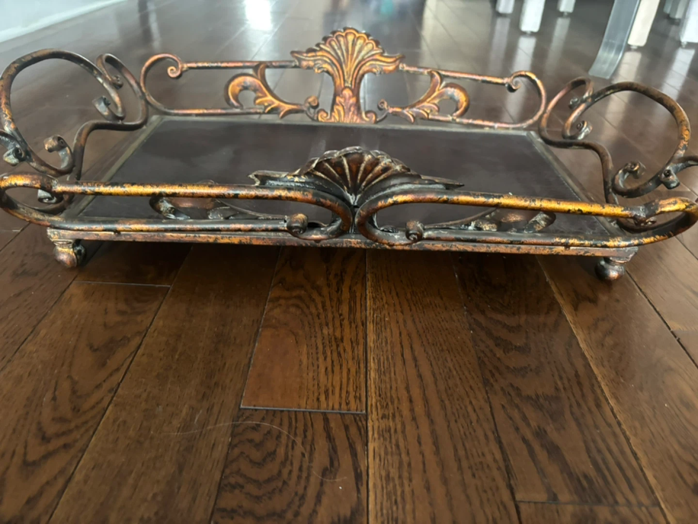 This is an ornate decorative tray with a metal frame. It has intricate scrollwork and a dark textured insert. Great for serving or display!