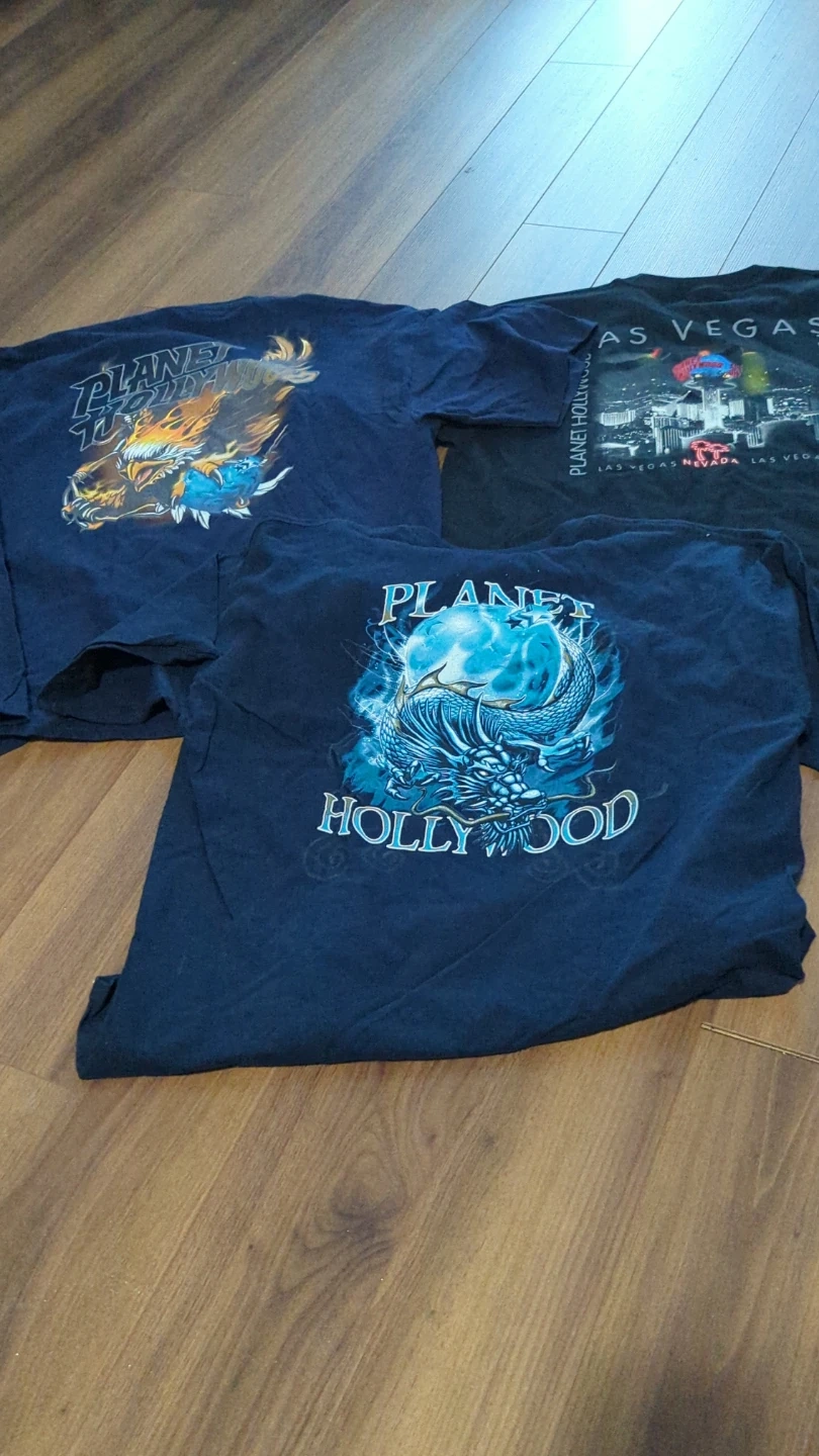 Bundle of three Planet Hollywood t-shirts, featuring a Las Vegas skyline and two graphic prints: one with an eagle and flames, and another with a blue dragon. Casual wear for fans of the brand.