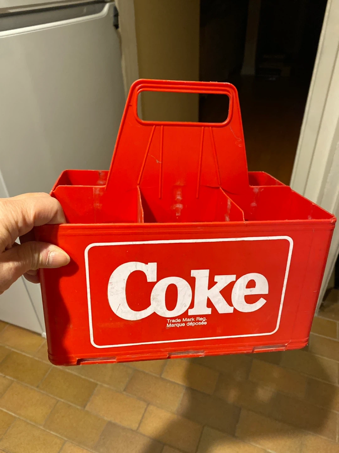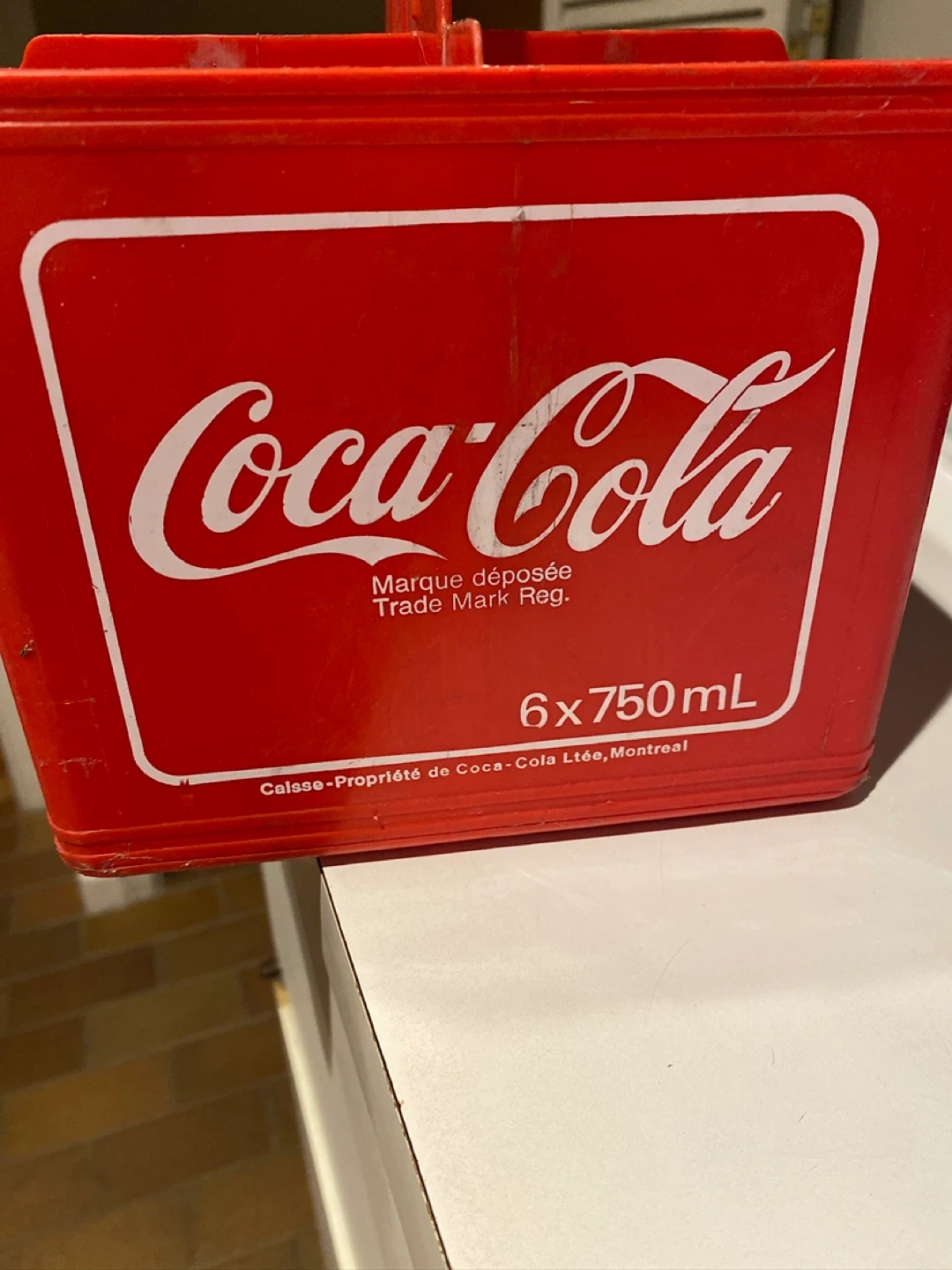 This is a red Coca-Cola plastic carrying crate designed for six 750mL bottles. It's made of sturdy plastic and features the classic Coke logo. Caisse-Propriété de Coca-Cola Ltée, Montreal.