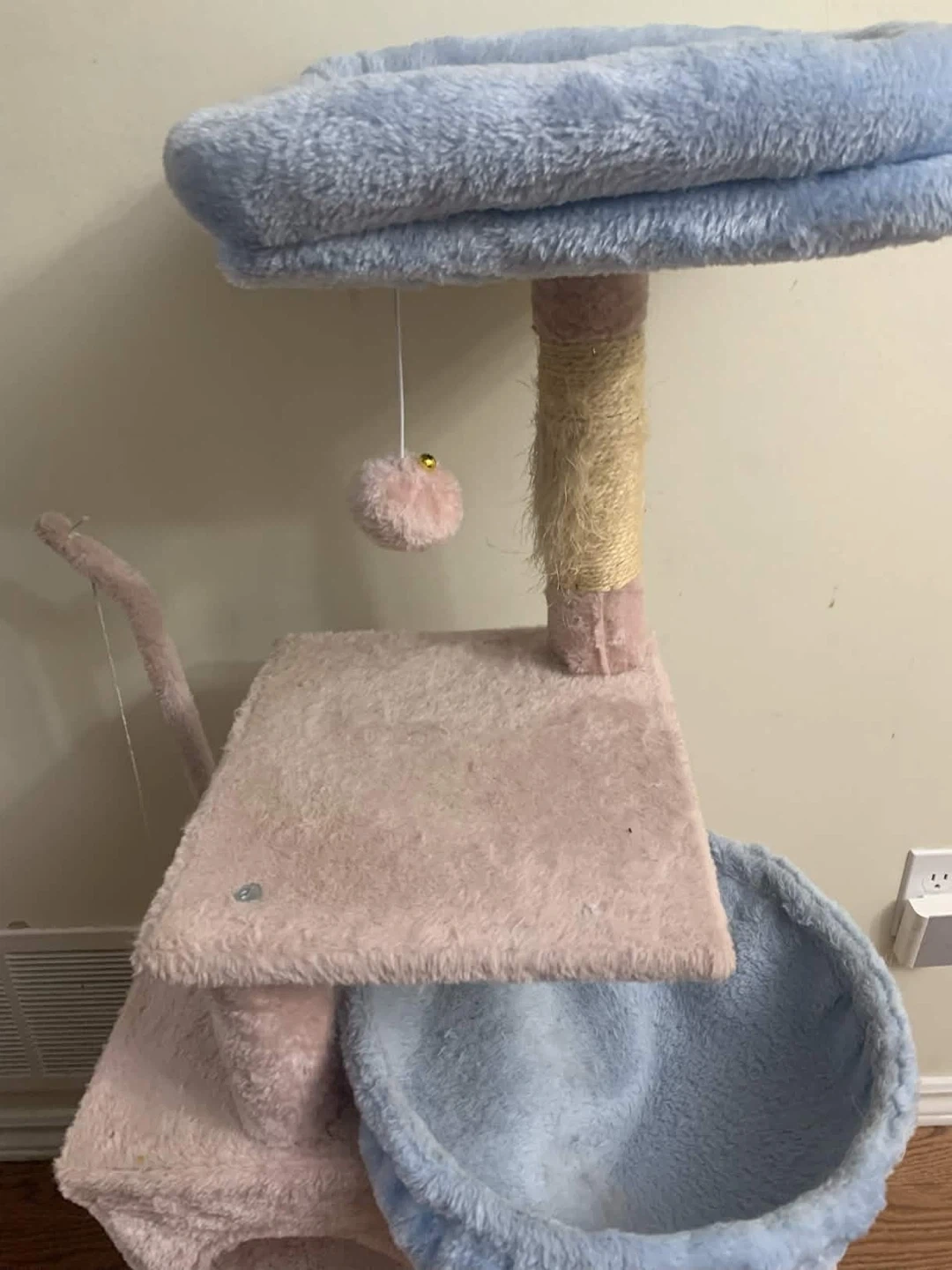 Your kitty will love relaxing, scratching, and playing on this fun Cat Tower. This tower comes with multiple levels, and features jute and carpet to satisfy your kitty's instinctive urge to scratch. It even comes with a dangling ball fur toy for when your cat is feeling playful. What a great addition to any cat lover's home.