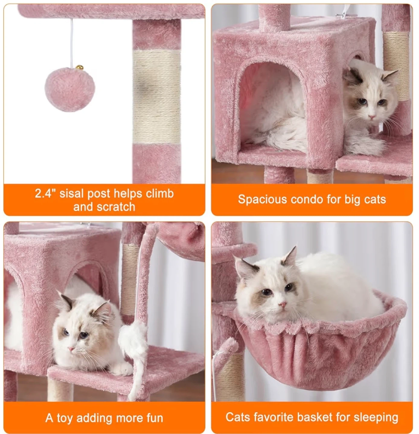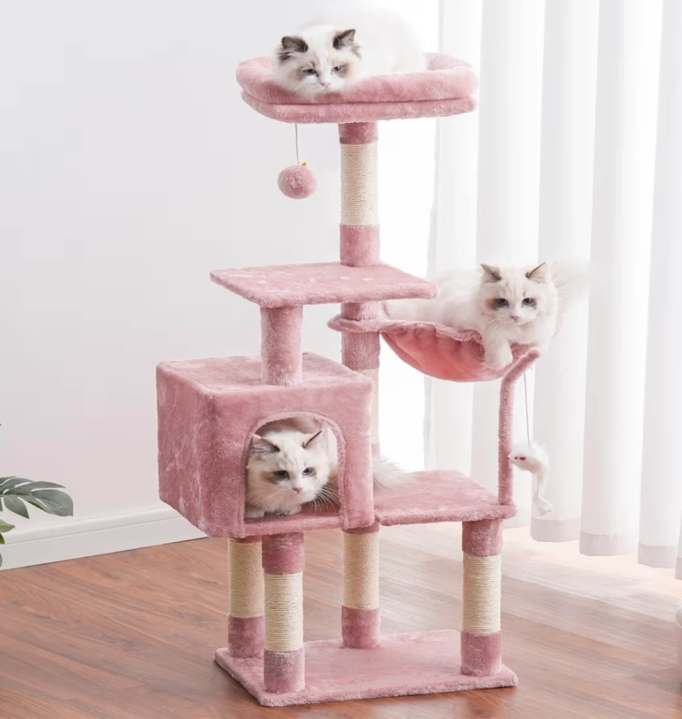This 5-floor big cat tree is the perfect playground for your cat. It is made with strong, high-quality materials, including natural jute rope, so it will last a long time. With five levels of platforms and perches, your cat has a lot of space to play, exercise, and relax. A cozy cat room gives your cat a private spot to nap. Toy will keep your cat entertained for hours. The high levels help your cat feel confident and less anxious. Its sleek design also makes it easy to fit into your home.