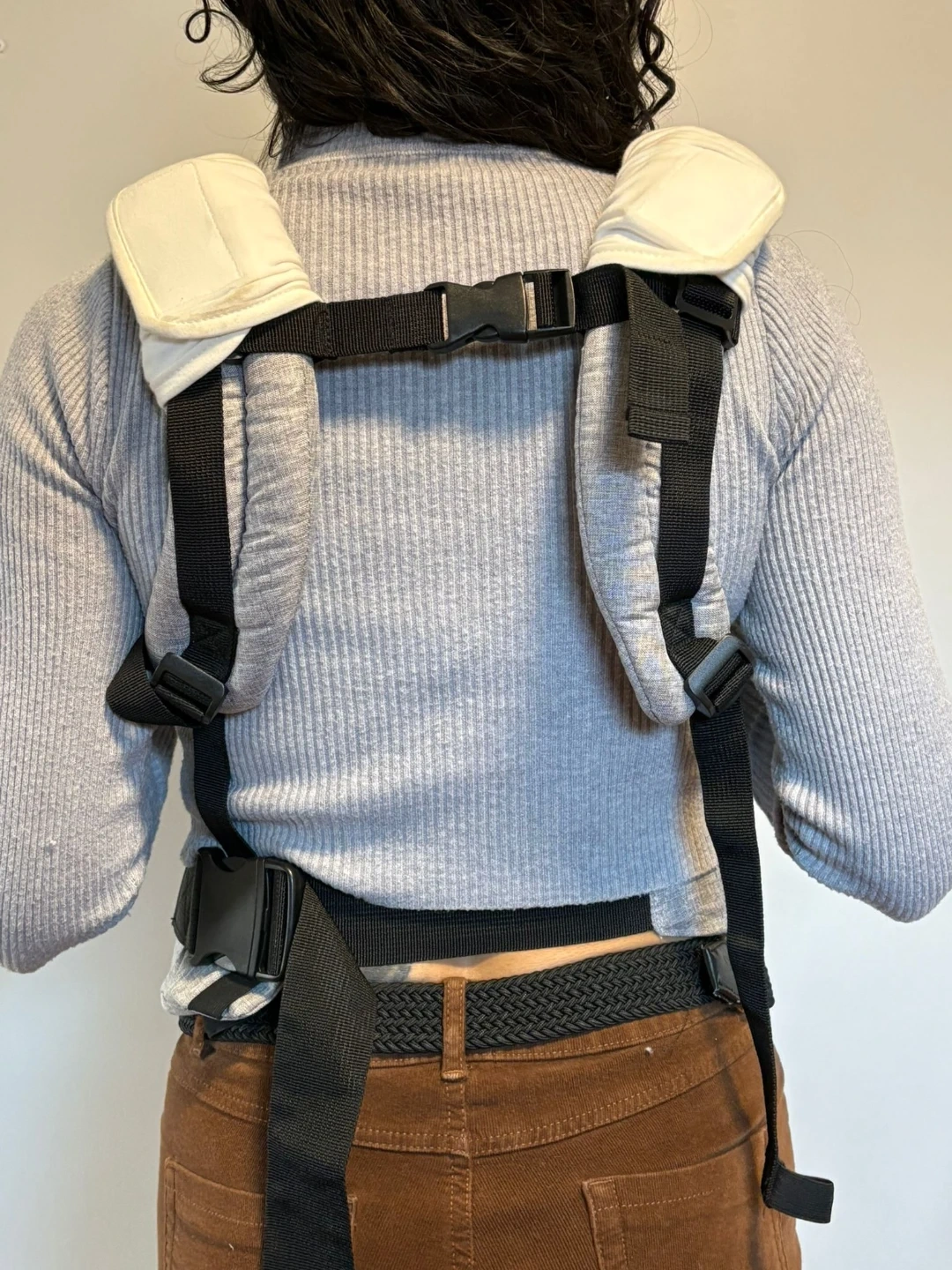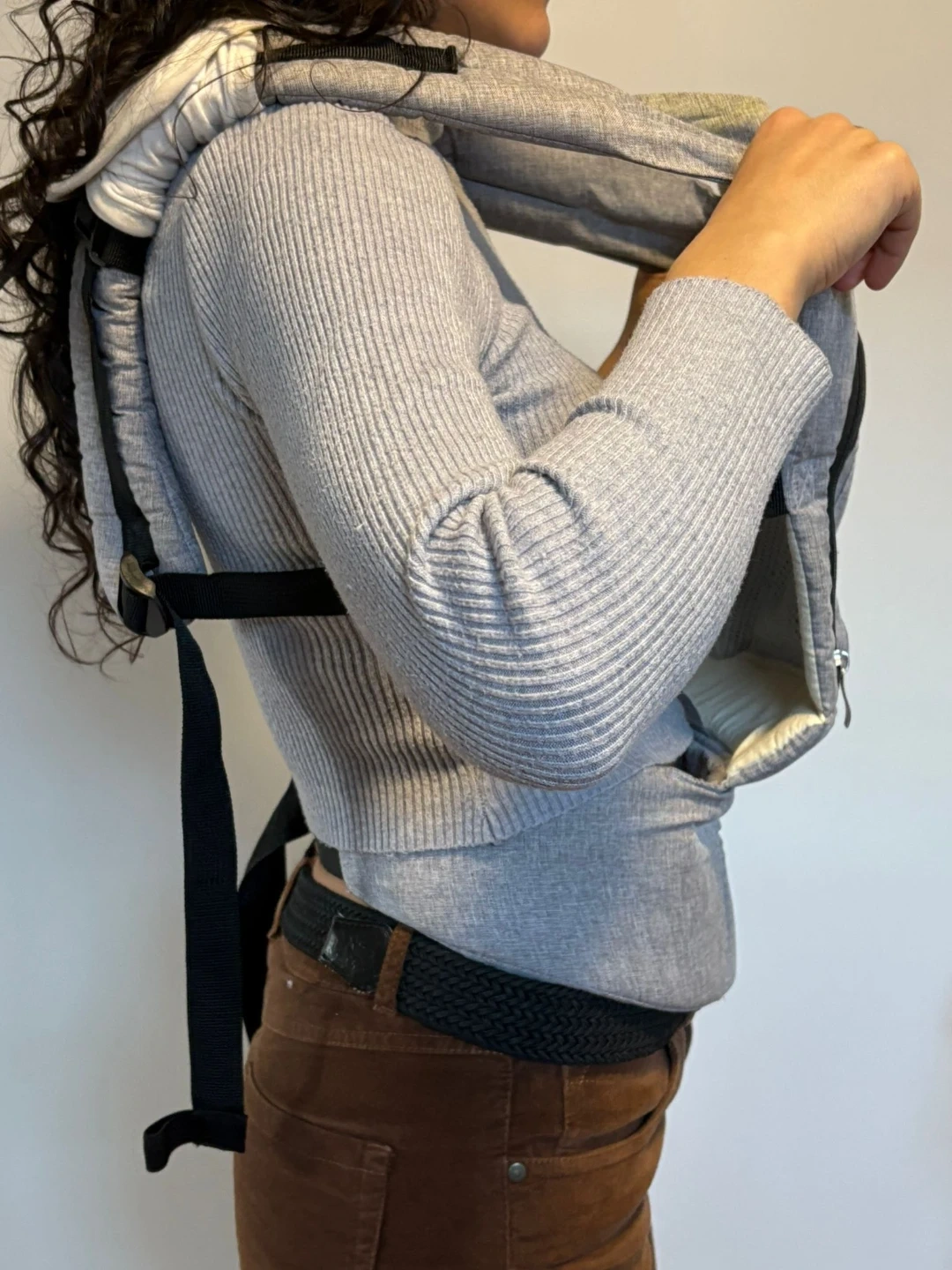 Grey Joybabies baby carrier with adjustable straps. It's made of a soft, durable fabric. Features a zippered pocket on the front.