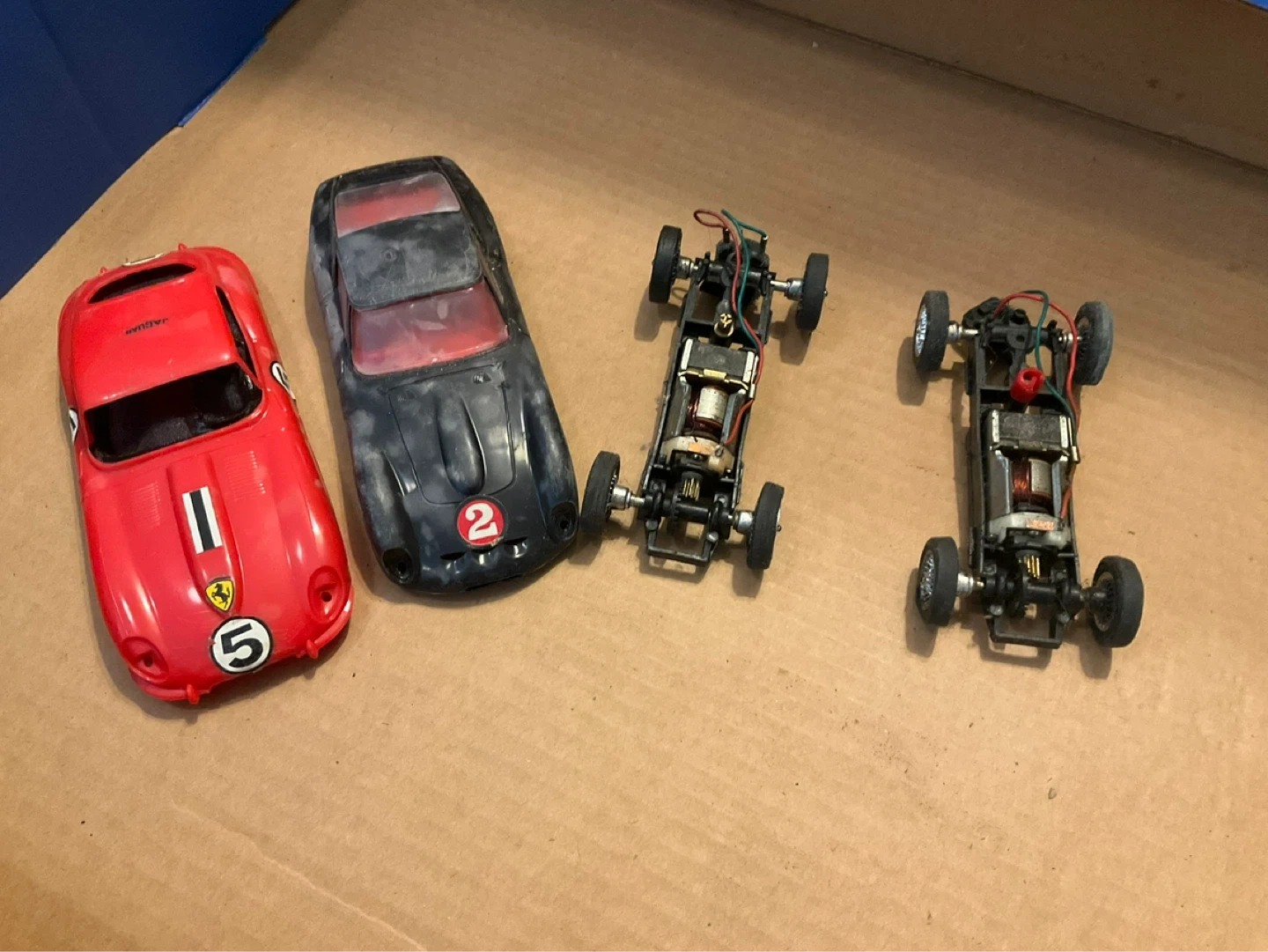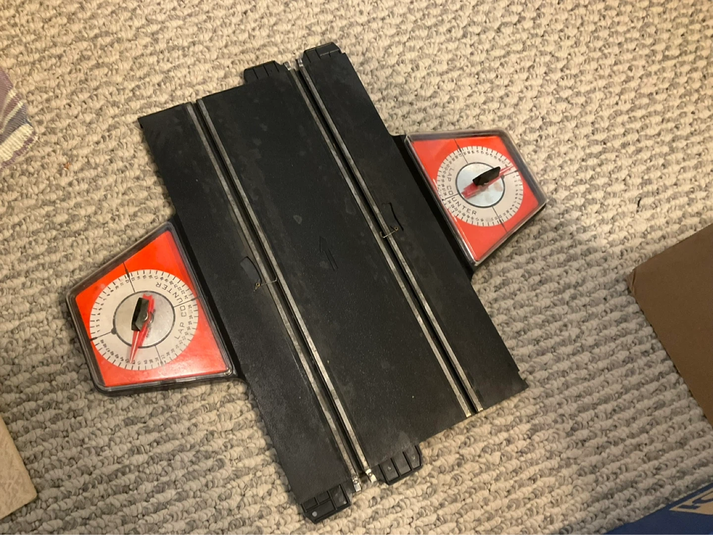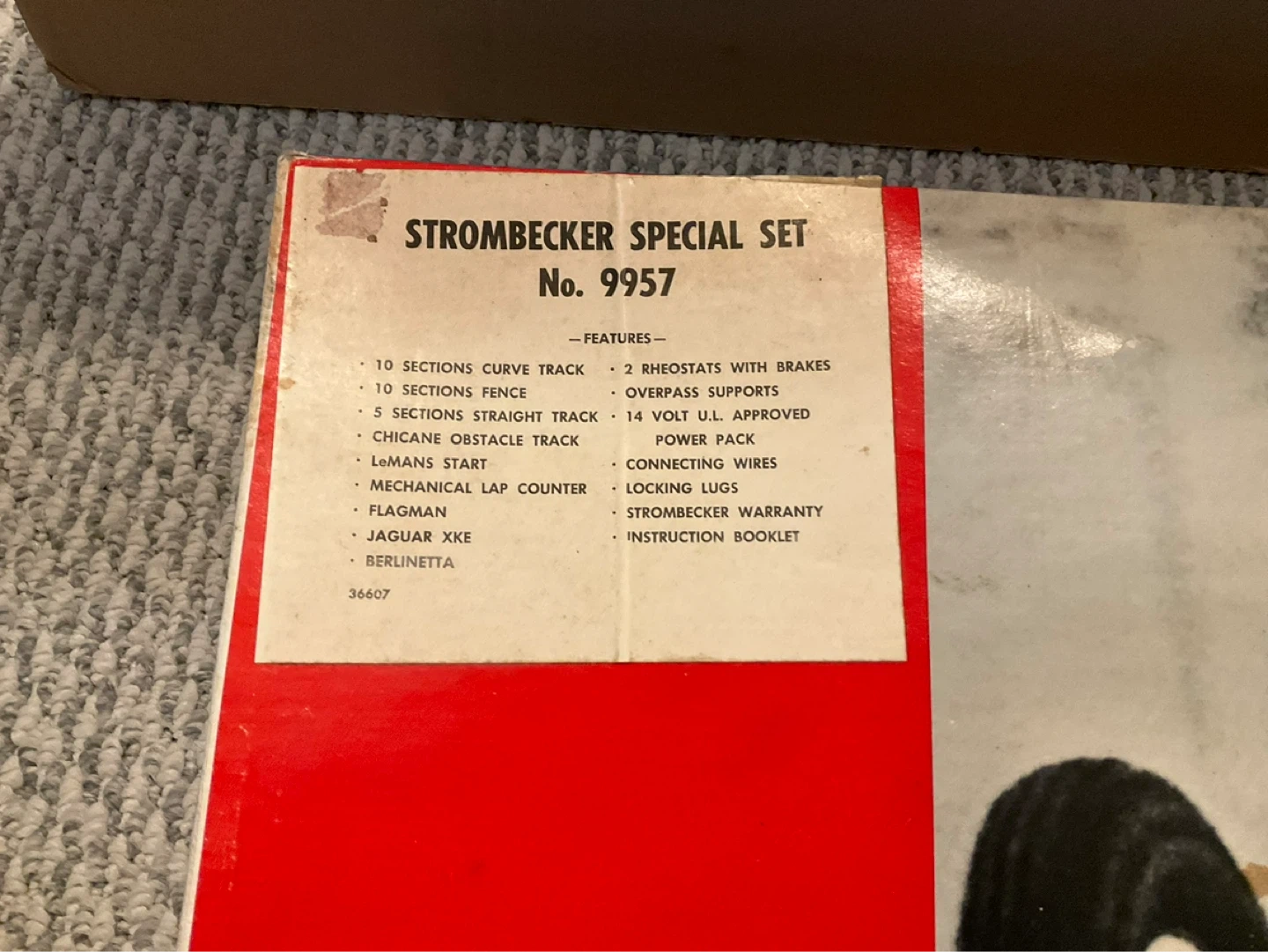 This Strombecker Special Set includes a Formula 1 road racing track and cars. It features 10 sections of curve track, 10 sections of fence, and 5 sections of straight track. It also includes a LeMans start, Chicane obstacle track, mechanical lap counter, flagman, Jaguar XKE, Berlinetta, 2 rheostats with brakes, overpass supports, power pack, and connecting wires. Instruction booklet and Strombecker warranty are also included.