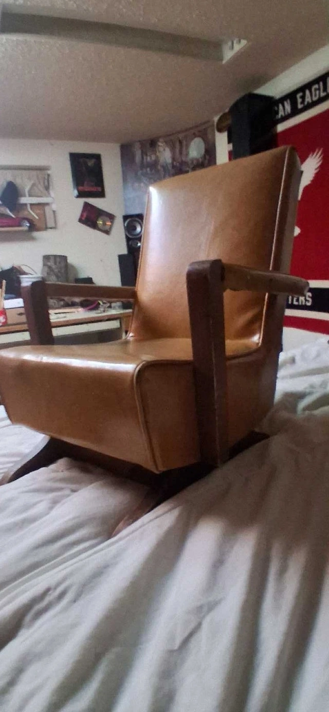 Super cute true mid-century children's rocker with vinyl upholstery and wood base. Very retro looking! Love the colors! Made by the Toledo Woodworks Company, Toledo, Ohio. Rocking chair is in overall good condition for its age. Asking $200 obo. Cash accepted.
