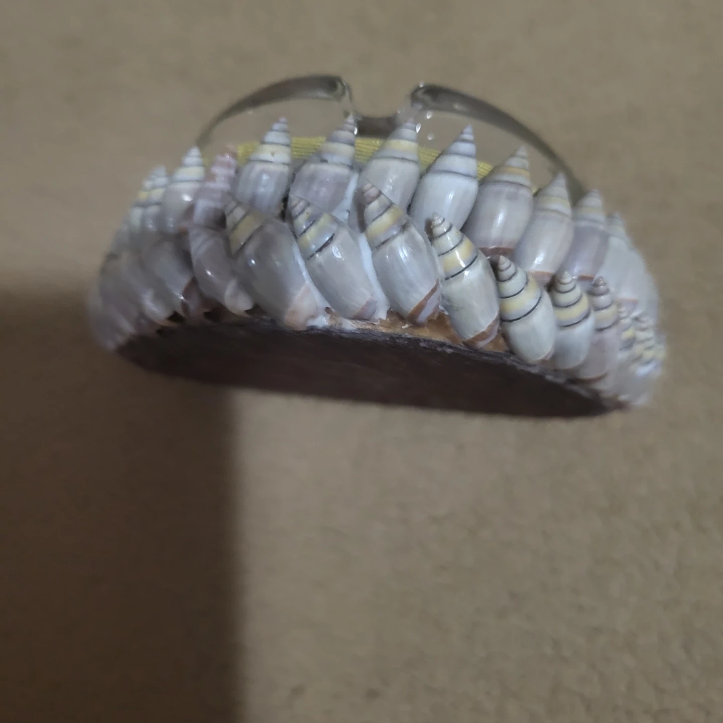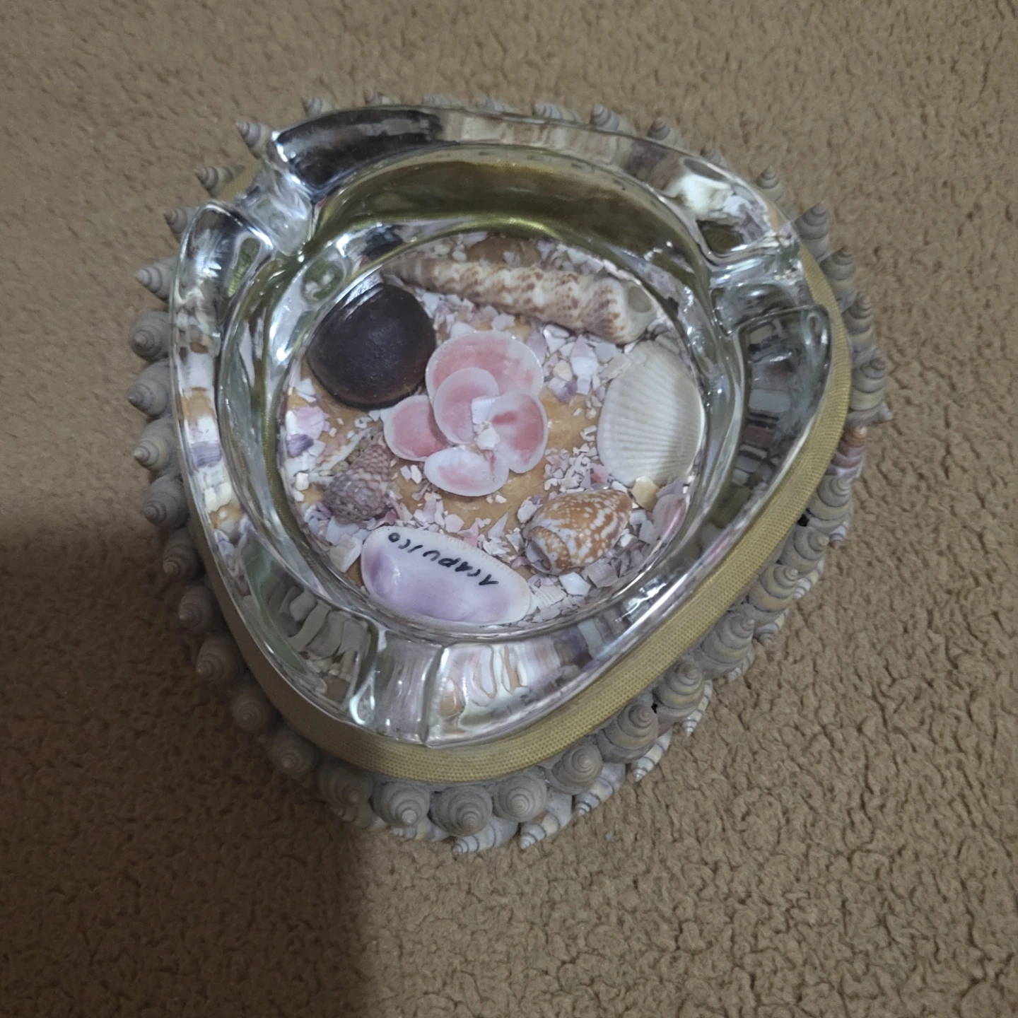 Selling a unique seashell ashtray. It's in good condition and would make a great decorative piece for your home or cottage. The ashtray features a clear glass centre filled with various seashells, surrounded by a decorative shell border.