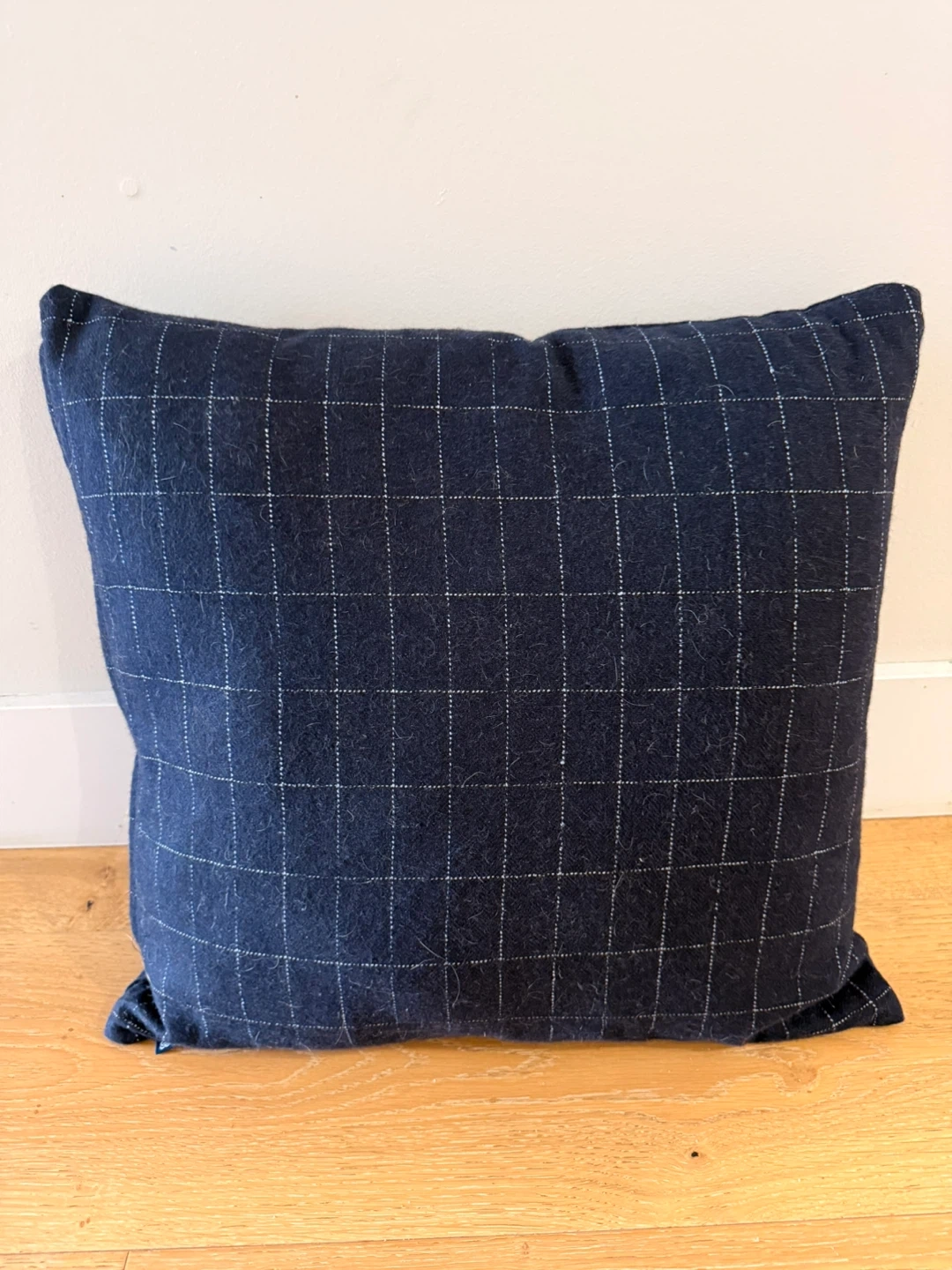 A classic navy blue throw pillow featuring a subtle plaid pattern with white stitching. It's a great accent piece for any sofa or chair. Pillow insert is included.from Urban Barn.