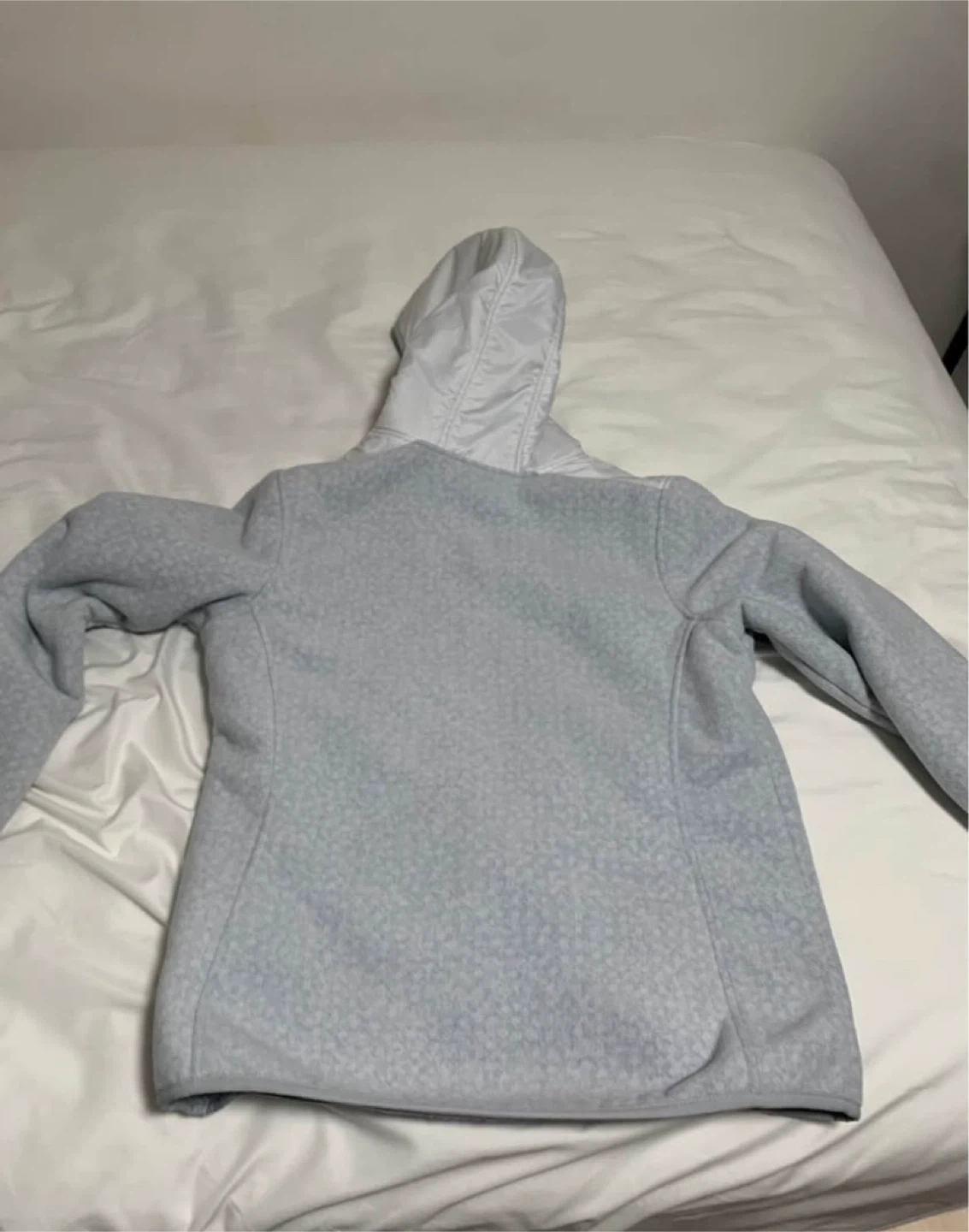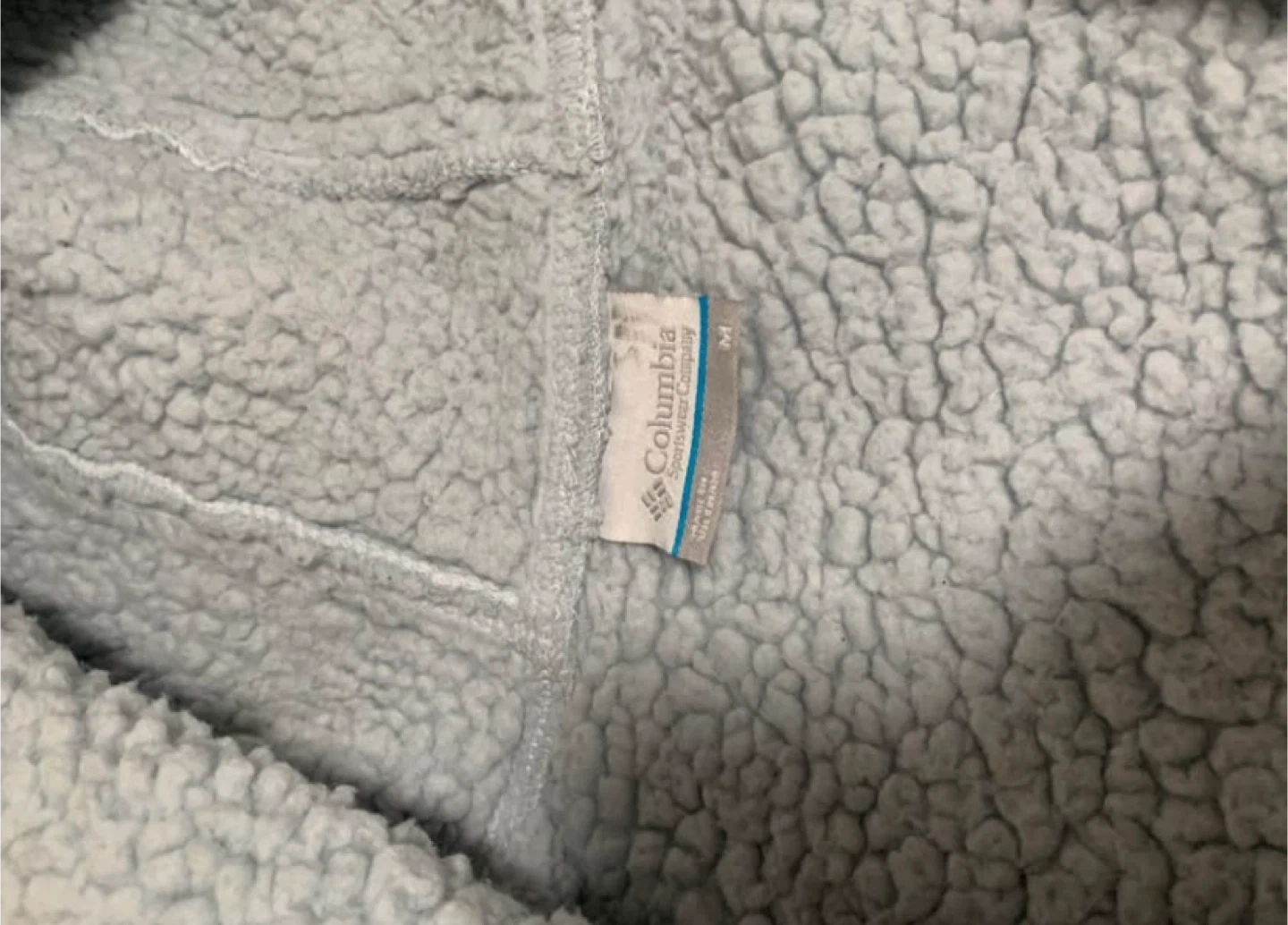 This Columbia hooded jacket is made of soft fleece material. It's light grey with a patterned texture and a cozy sherpa-lined interior. The jacket features a full zip-up front and two front pockets. It's a size medium. Great for staying warm on chilly days!