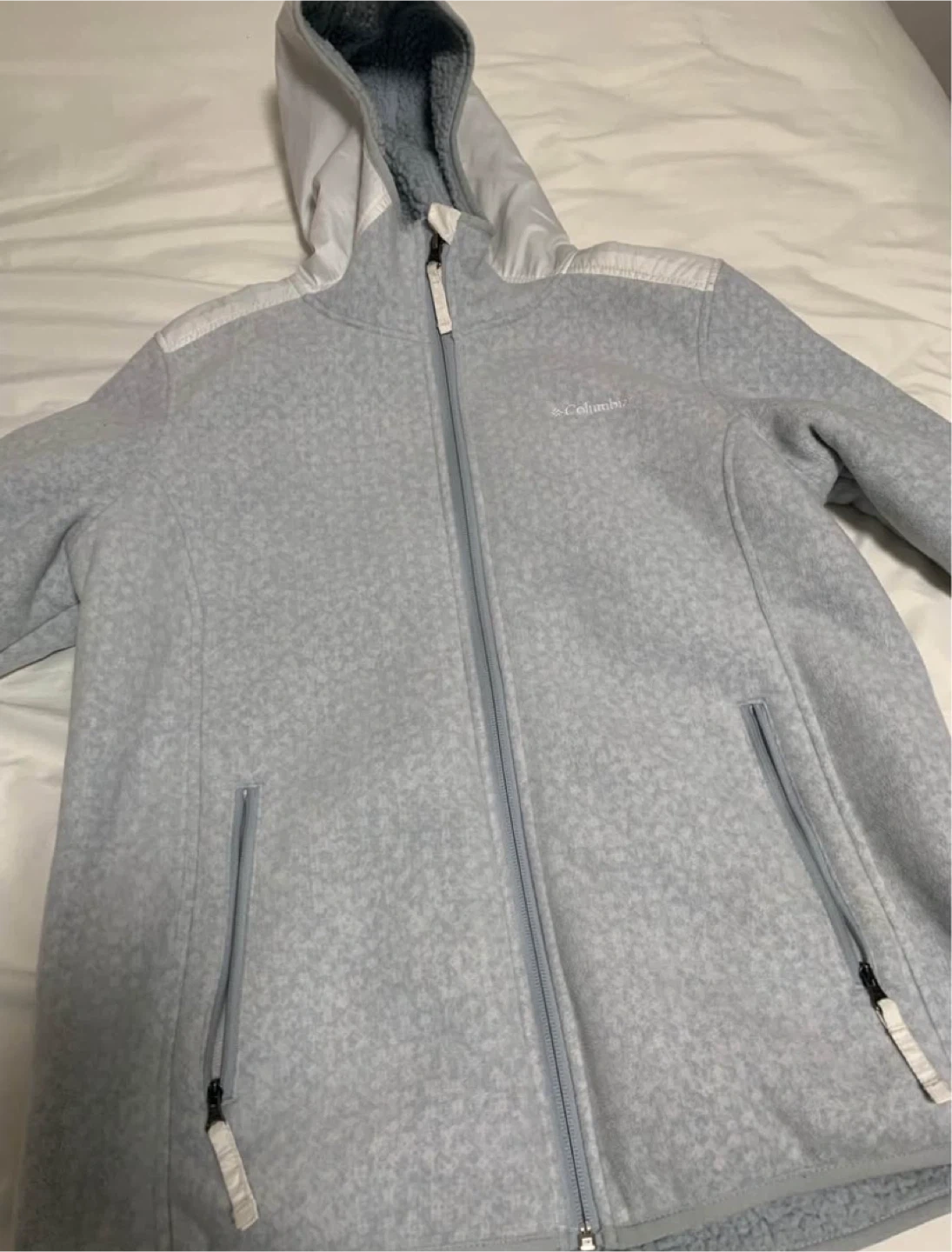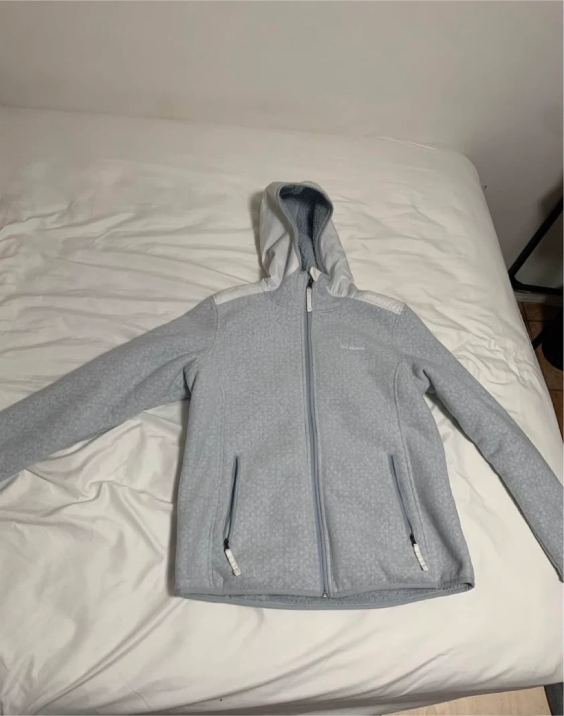 This Columbia hooded jacket is made of soft fleece material. It's light grey with a patterned texture and a cozy sherpa-lined interior. The jacket features a full zip-up front and two front pockets. It's a size medium. Great for staying warm on chilly days!