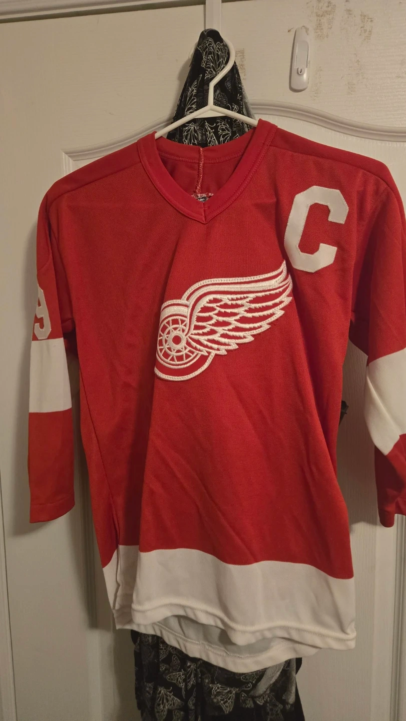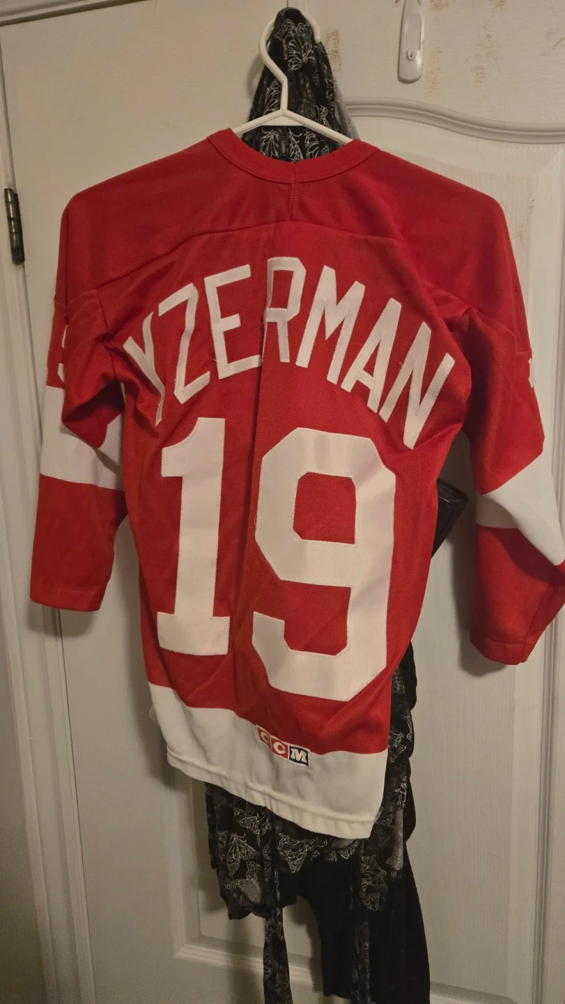 This is a vintage CCM Detroit Red Wings hockey jersey featuring Yzerman and number 19. It's a great piece for any hockey fan!