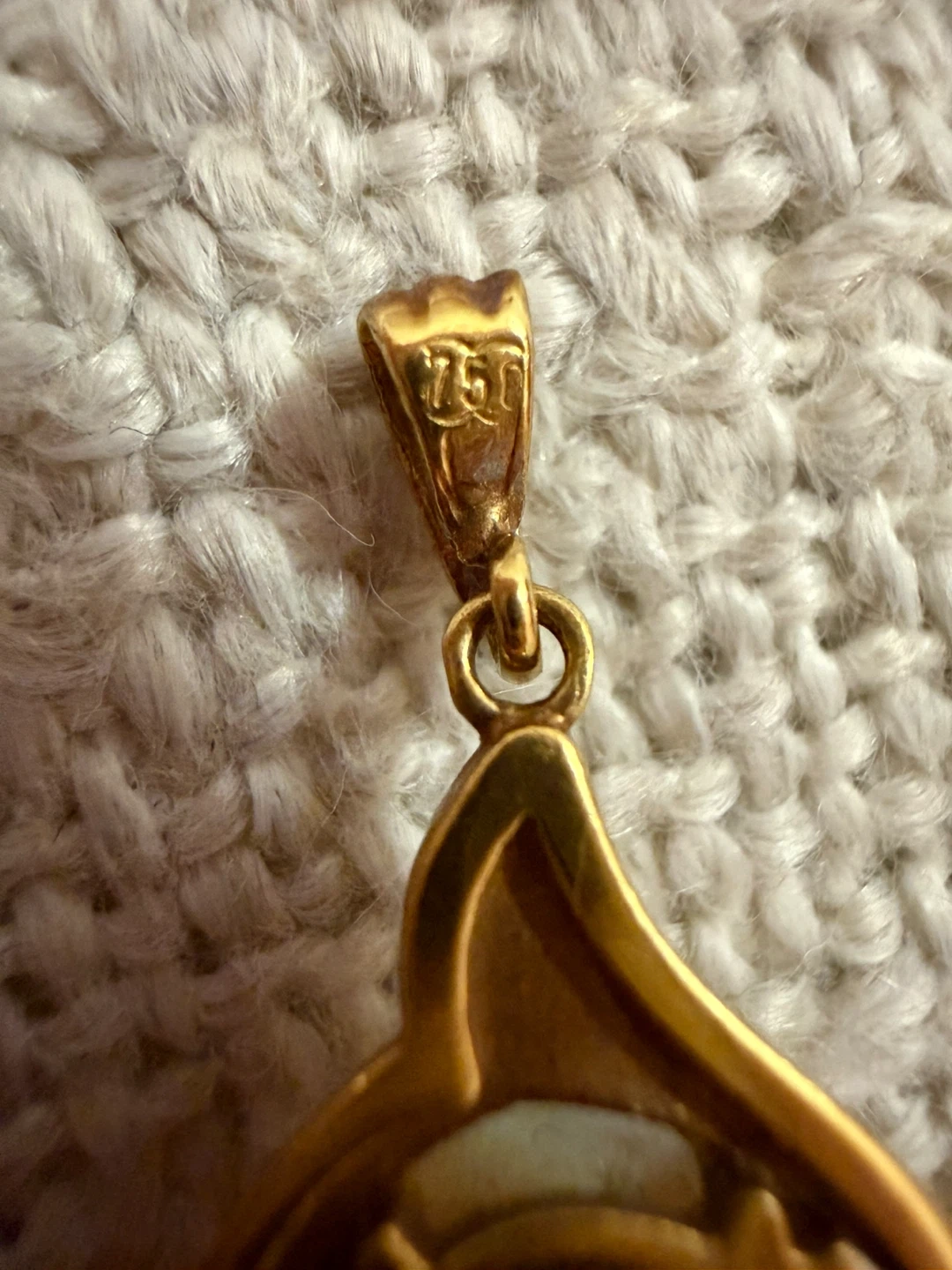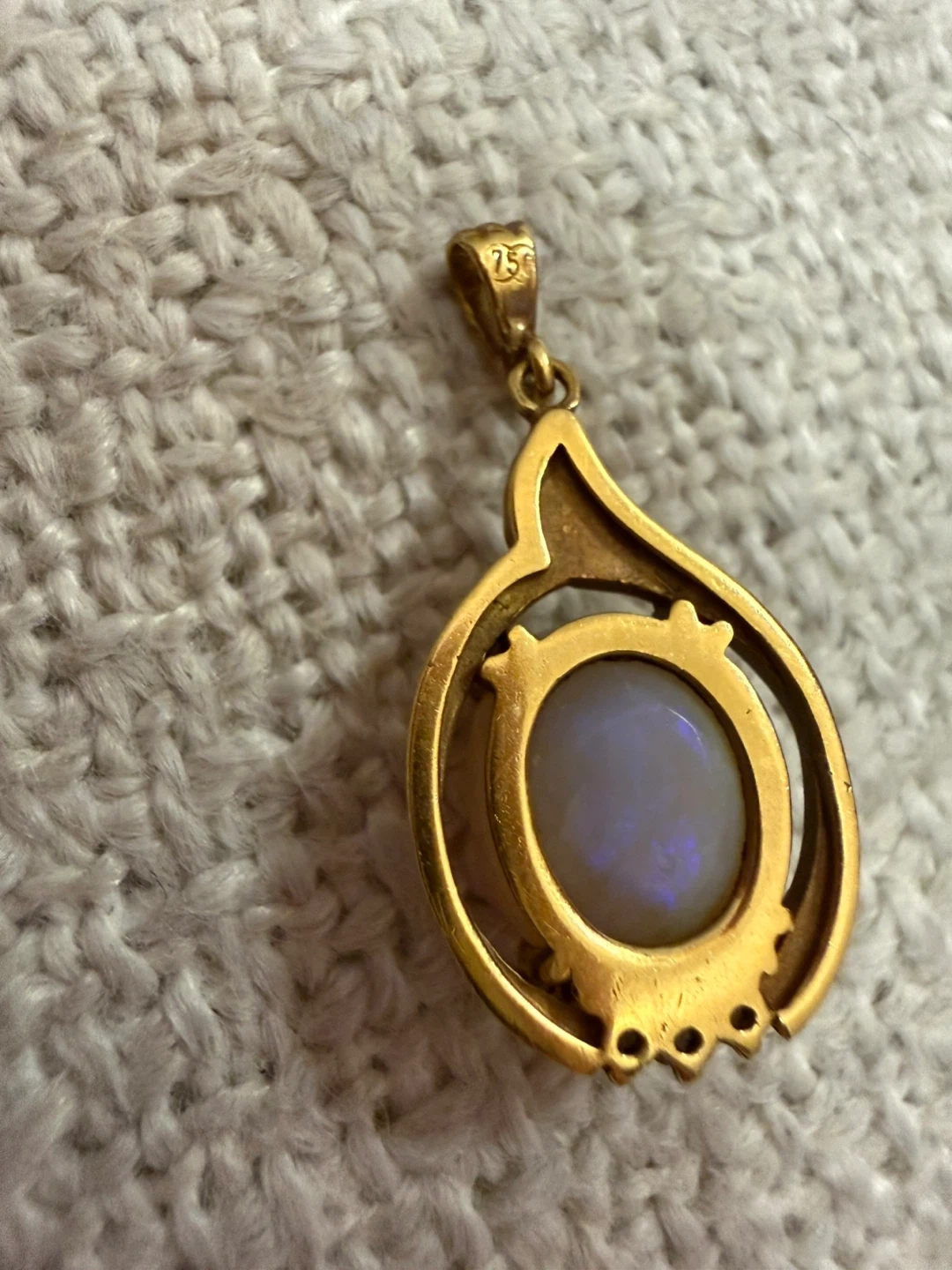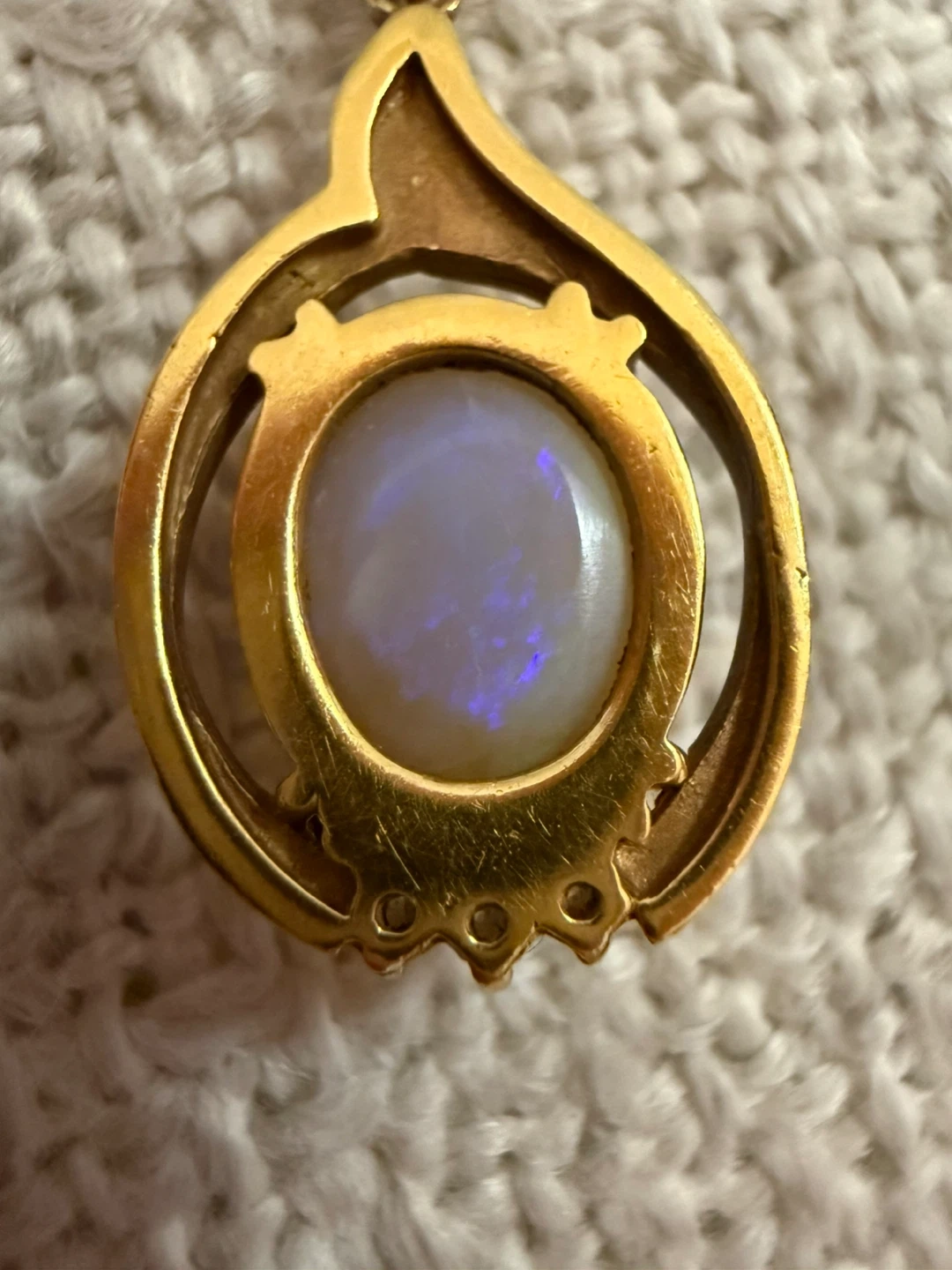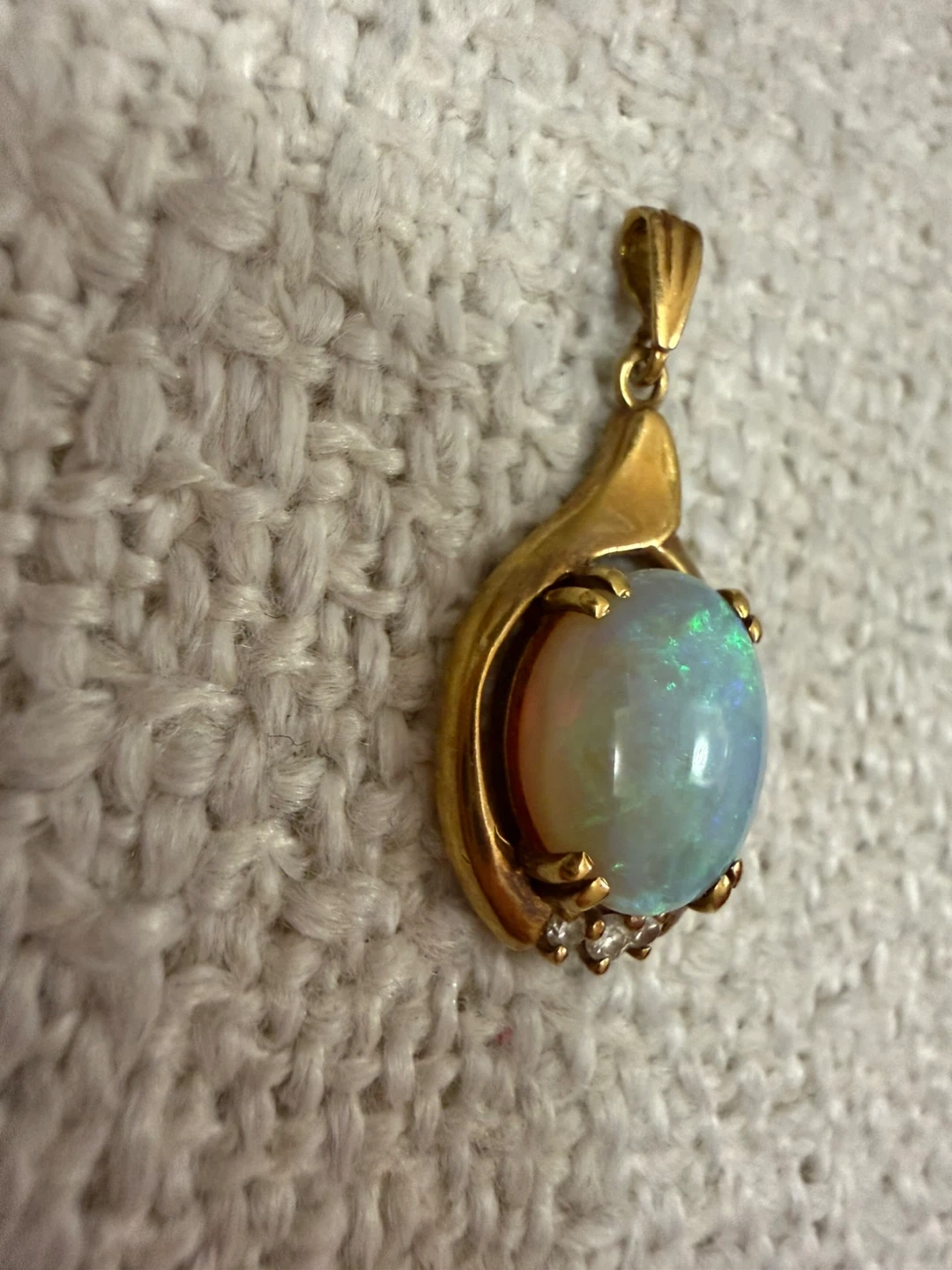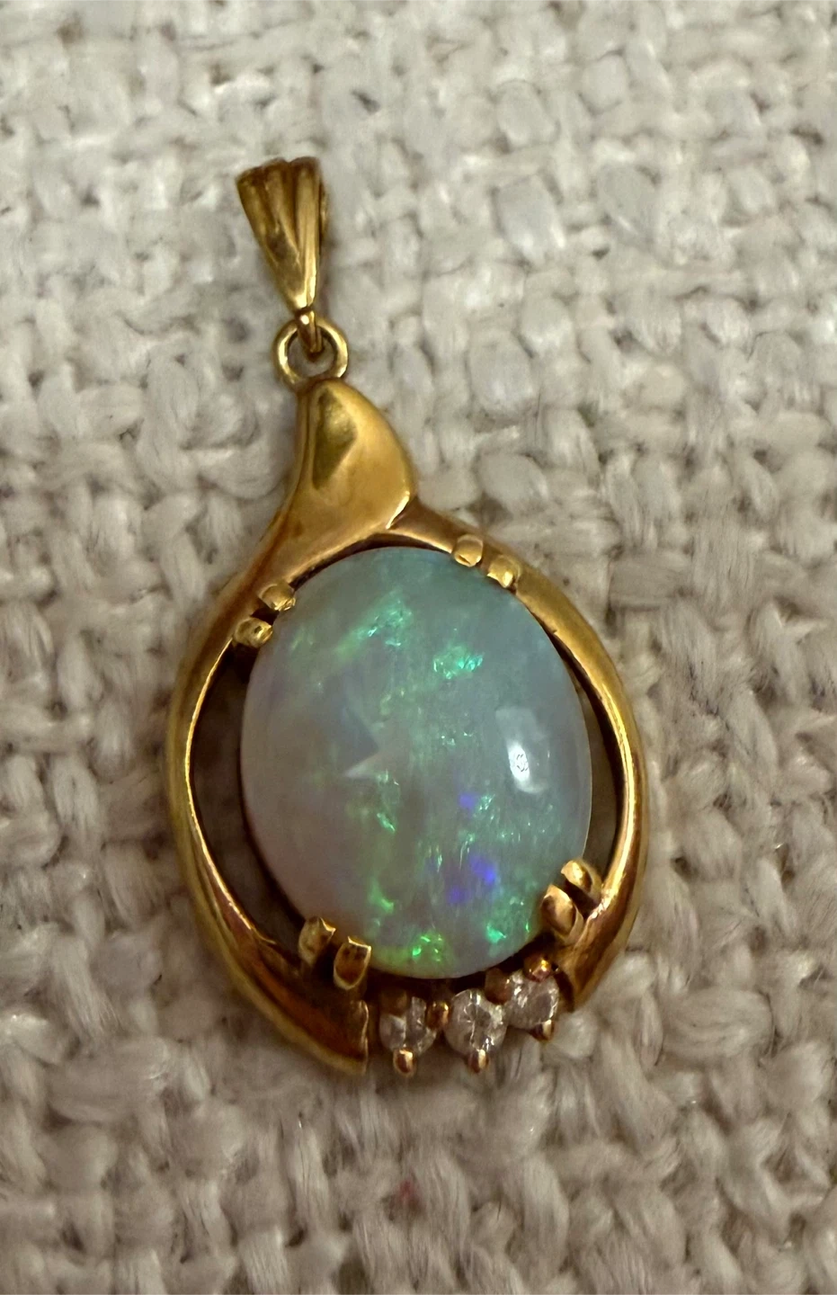 This elegant pendant features a luminous opal surrounded by a gold setting. Three small diamonds accent the bottom. Pendant measures approximately 2.5 cm in length.