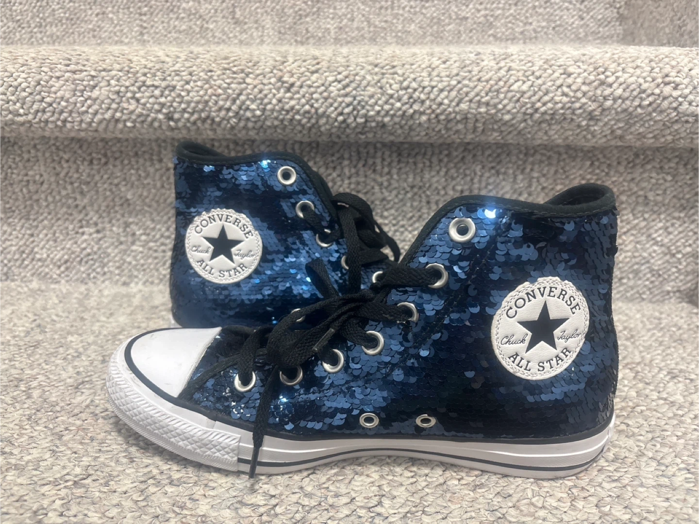 Sparkly blue sequined Converse high top sneakers. These eye-catching kicks feature the classic Chuck Taylor ankle patch and a durable rubber sole. Perfect for adding some shine to any outfit!size 7 pick up cash only