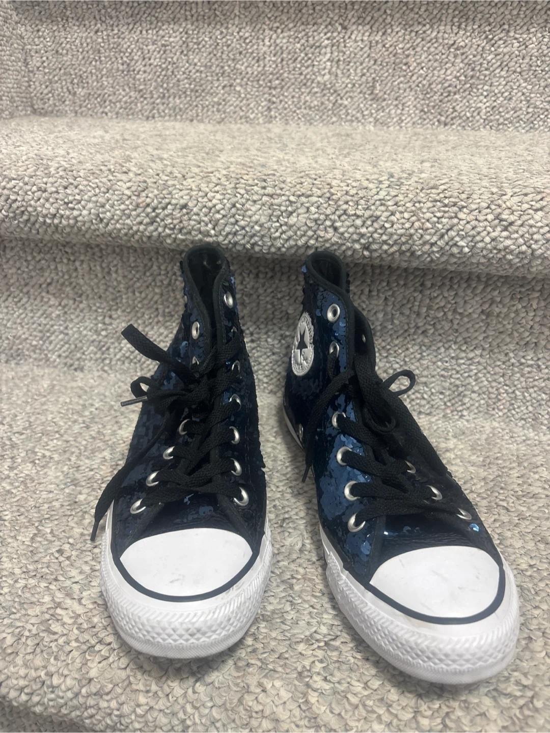 Sparkly blue sequined Converse high top sneakers. These eye-catching kicks feature the classic Chuck Taylor ankle patch and a durable rubber sole. Perfect for adding some shine to any outfit!size 7 pick up cash only