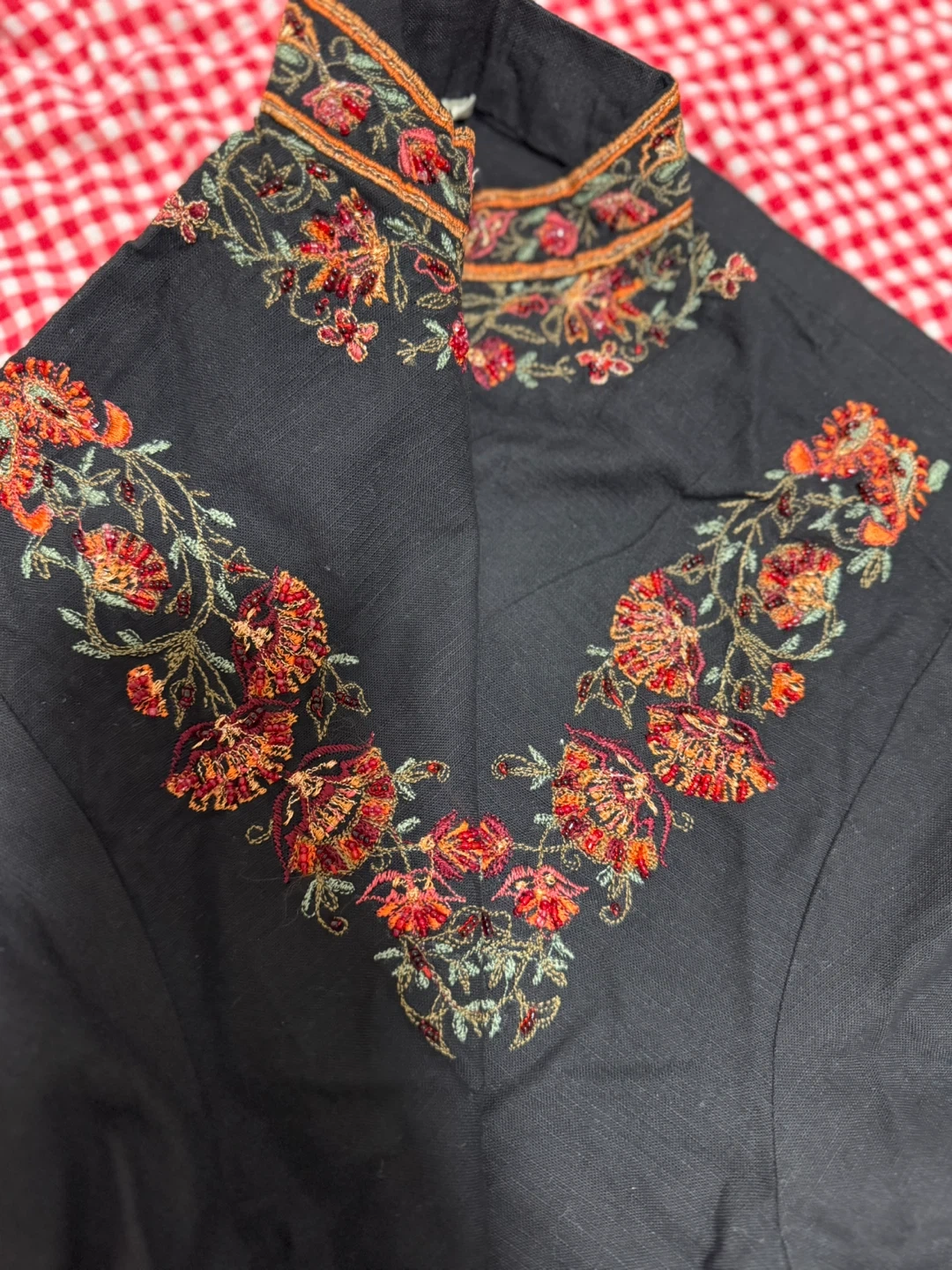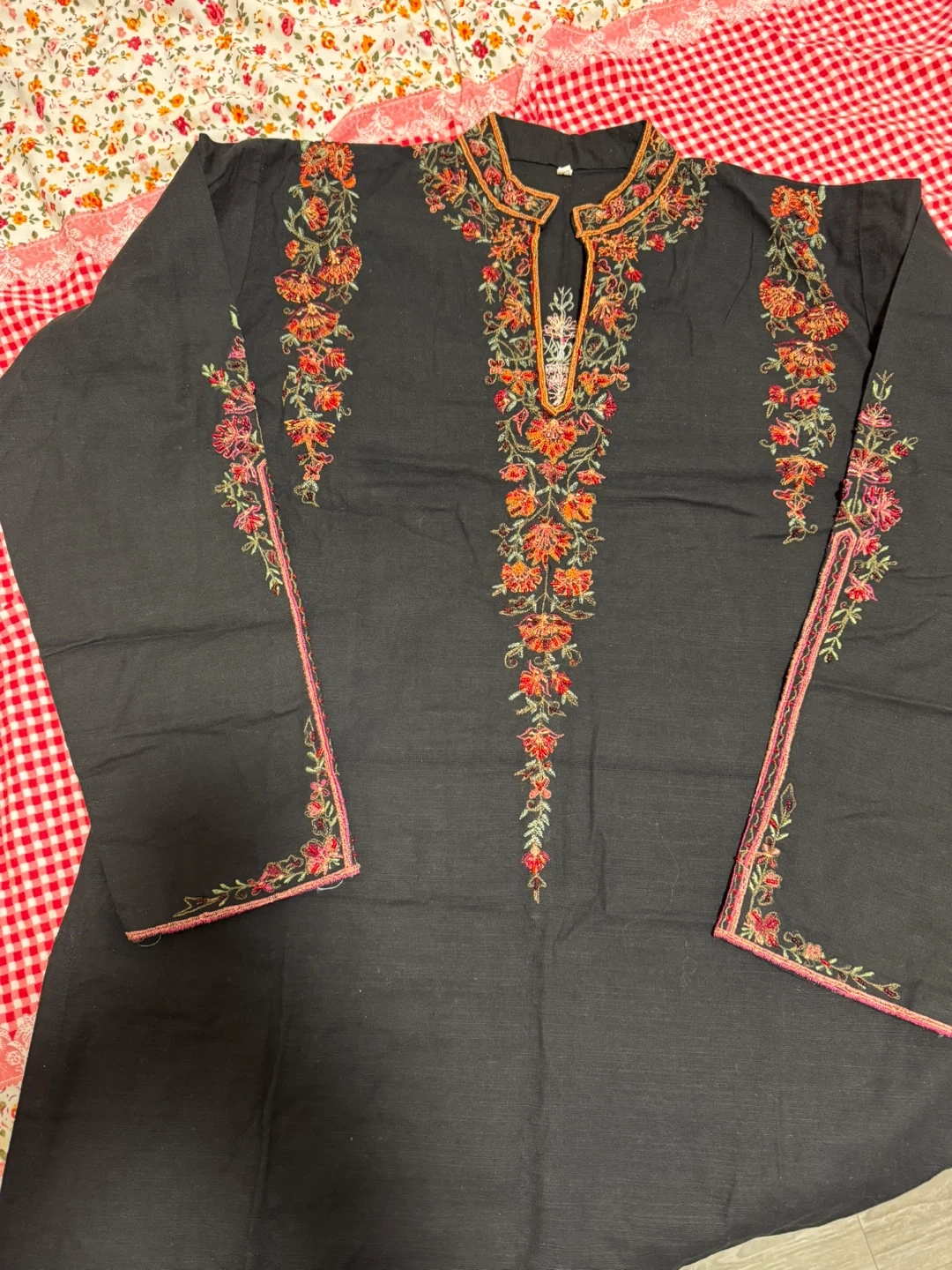 This black kurti with dupatta and pant features intricate floral embroidery around the neckline, down the front, and on the sleeves. It's made of a lightweight fabric, perfect for warmer weather. The matching pants and dupatta are included.