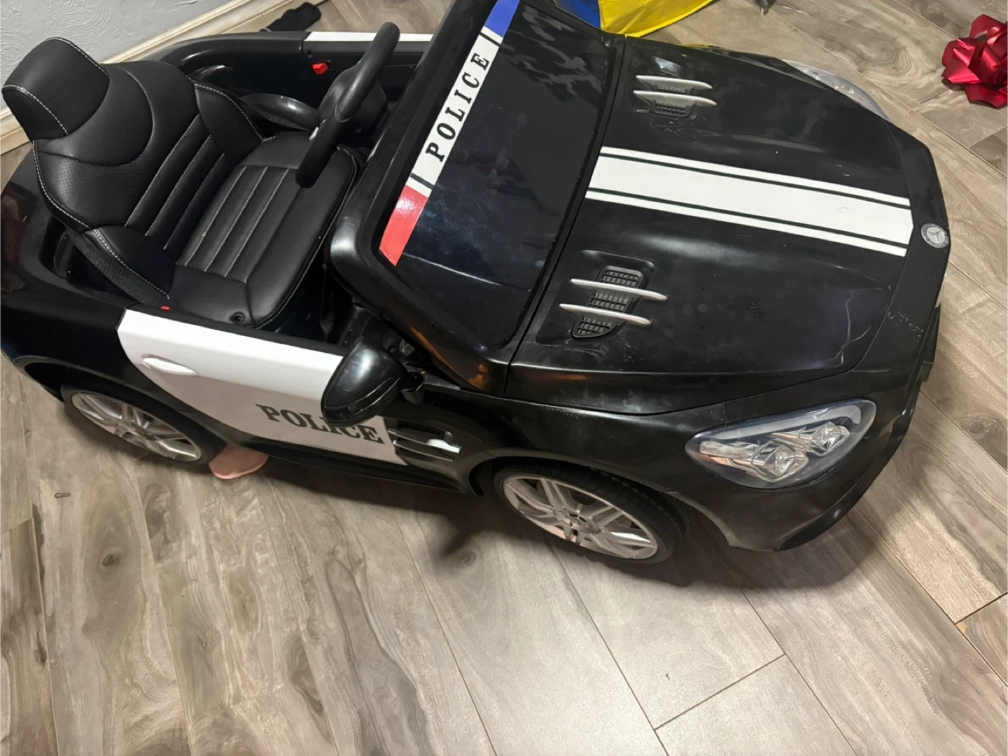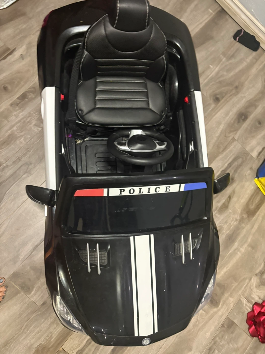 This is a black ride-on police car for kids. It features a seatbelt for safety and a steering wheel. Your little one can play pretend police officer!