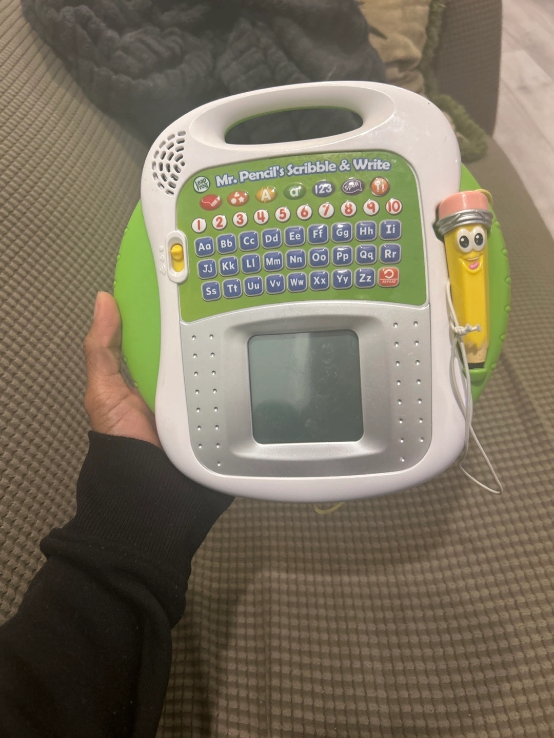 Pre-owned LeapFrog Mr. Pencil's Scribble & Write. Educational toy for preschoolers. Features a LCD screen and stylus. Numbers, letters, and spelling activities.