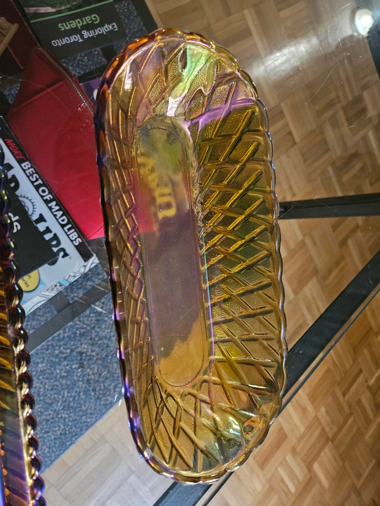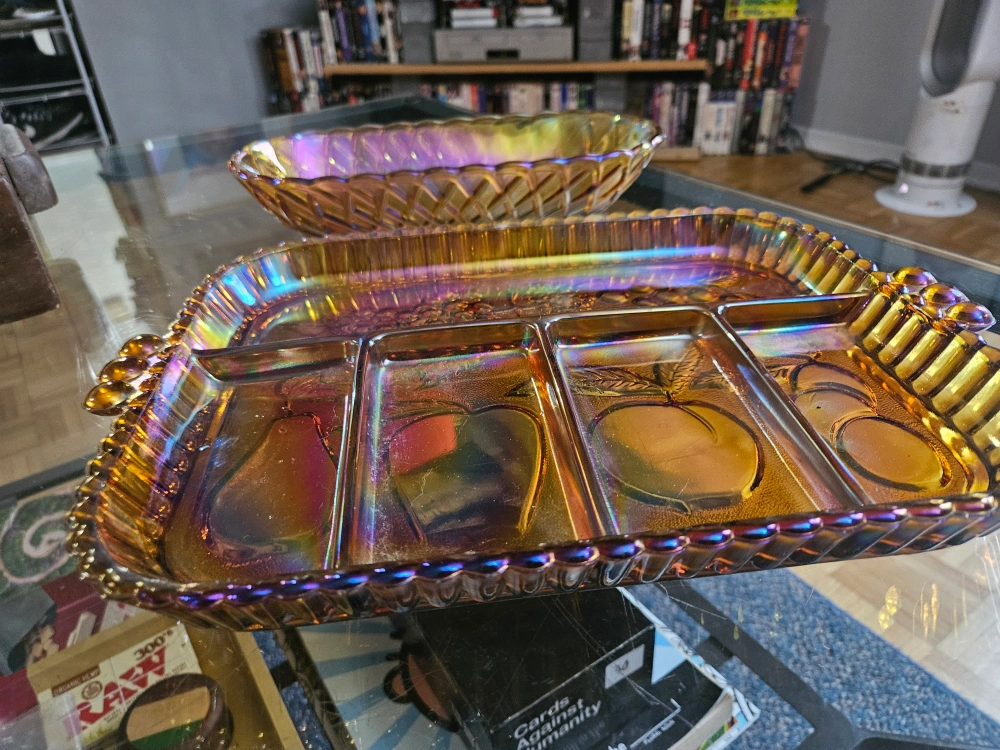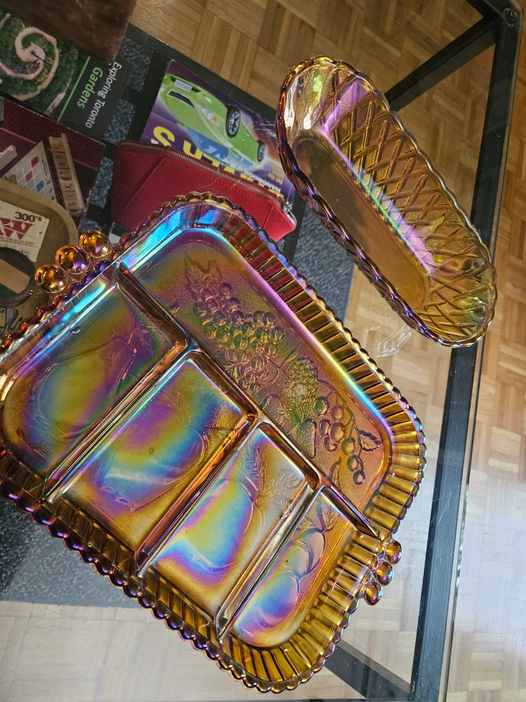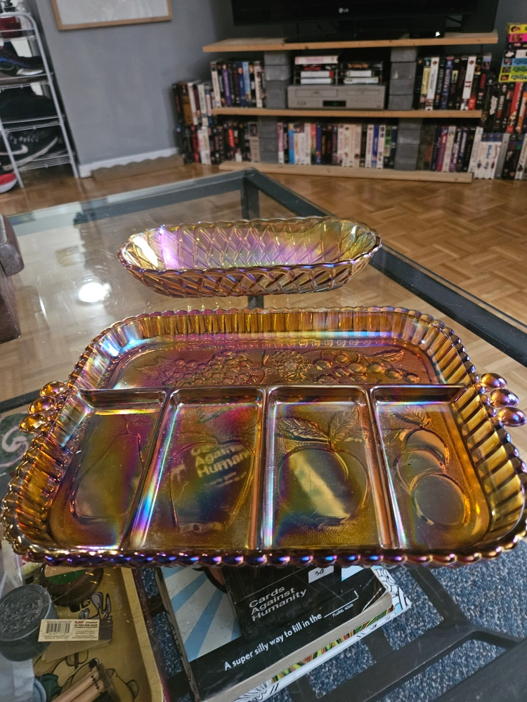 A set of two carnival glass serving dishes. One is a square dish with four sections, the other is an oval dish.