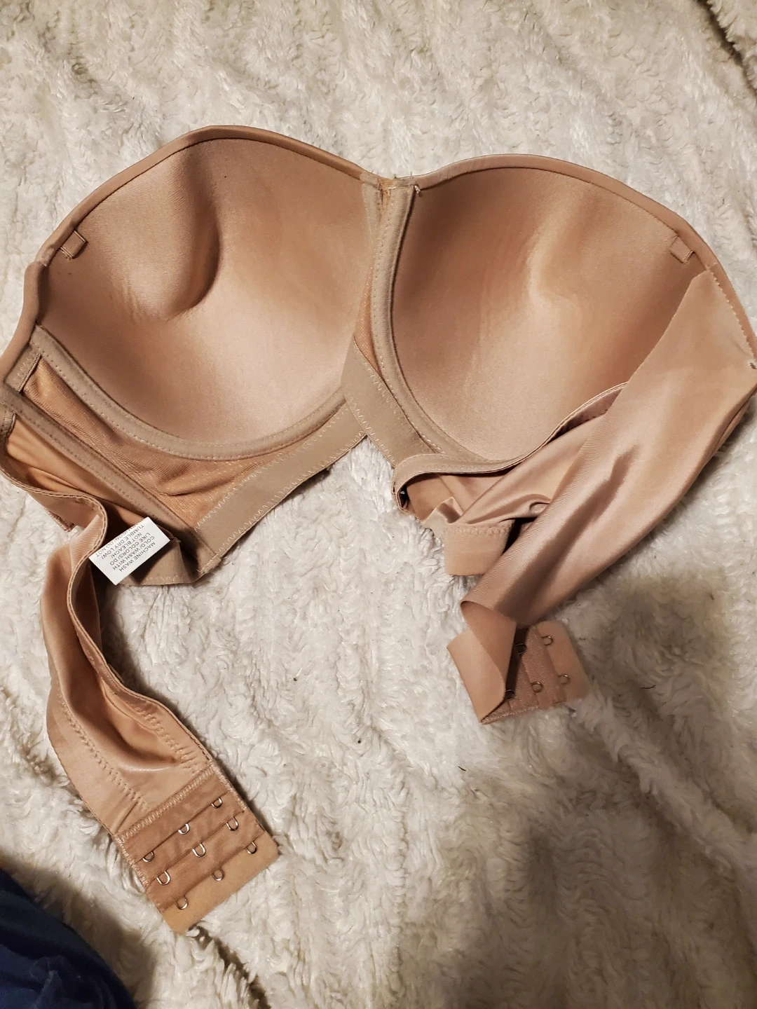 This is a beige strapless bra in size 95C. It's made of a smooth satin-like material. This bra is ideal for strapless outfits. Cedar pick up. It's 42c in Canada.