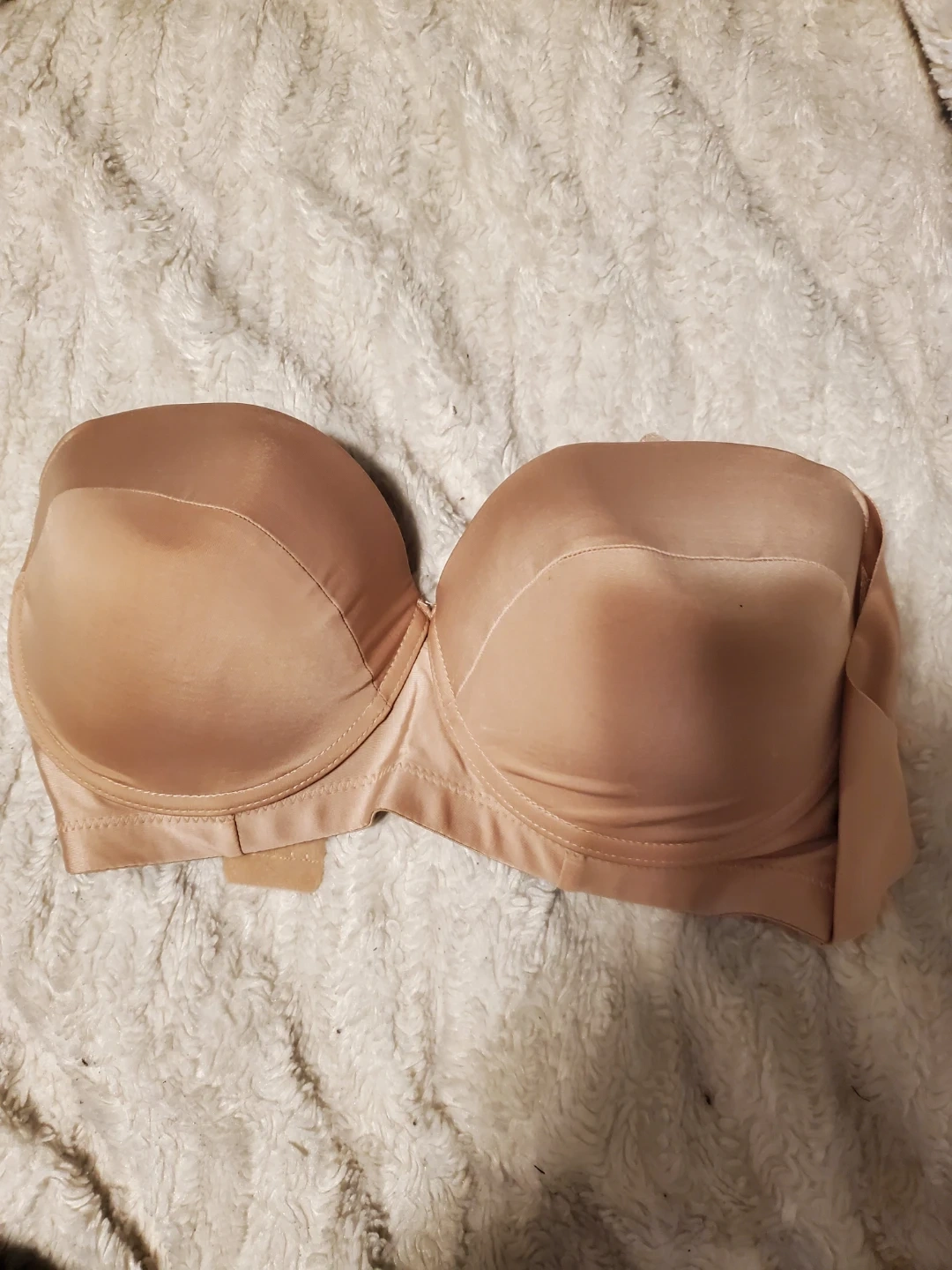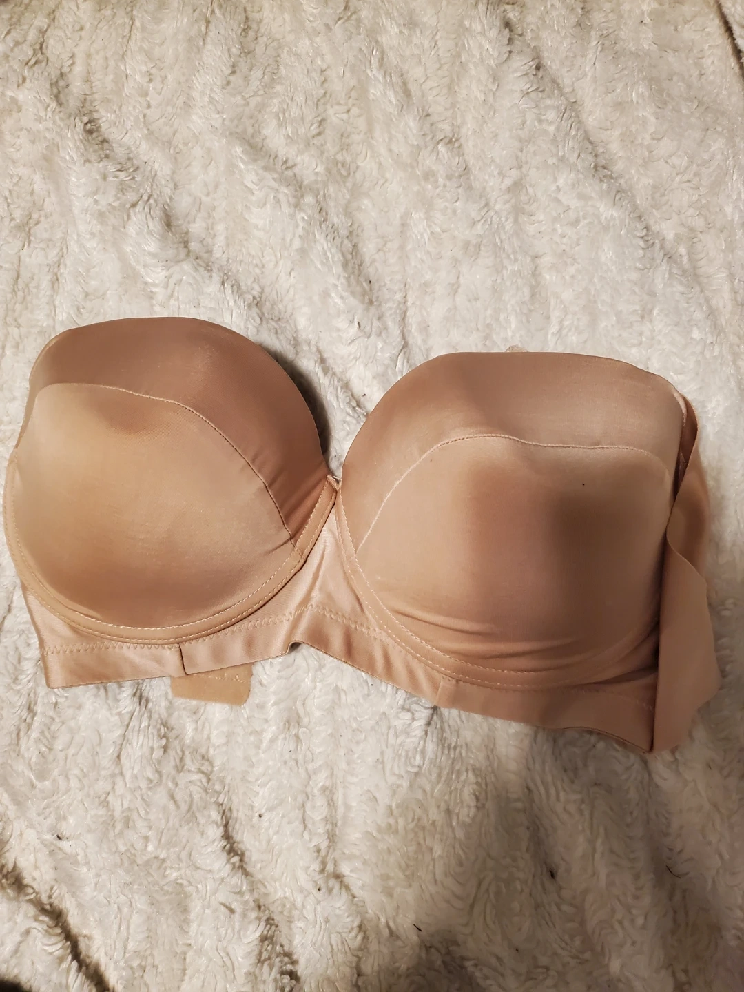 This is a beige strapless bra in size 95C. It's made of a smooth satin-like material. This bra is ideal for strapless outfits. Cedar pick up. It's 42c in Canada.