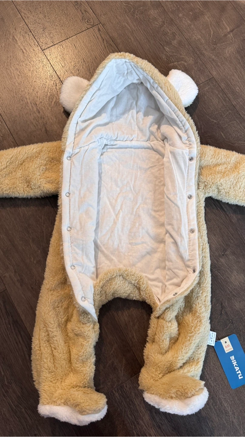 I'm selling a brand new, adorable Bikatu bear onesie! This cozy onesie is perfect for keeping your little one warm. It's made of 100% polyester and lined with 100% cotton. Size 6M (6 months)